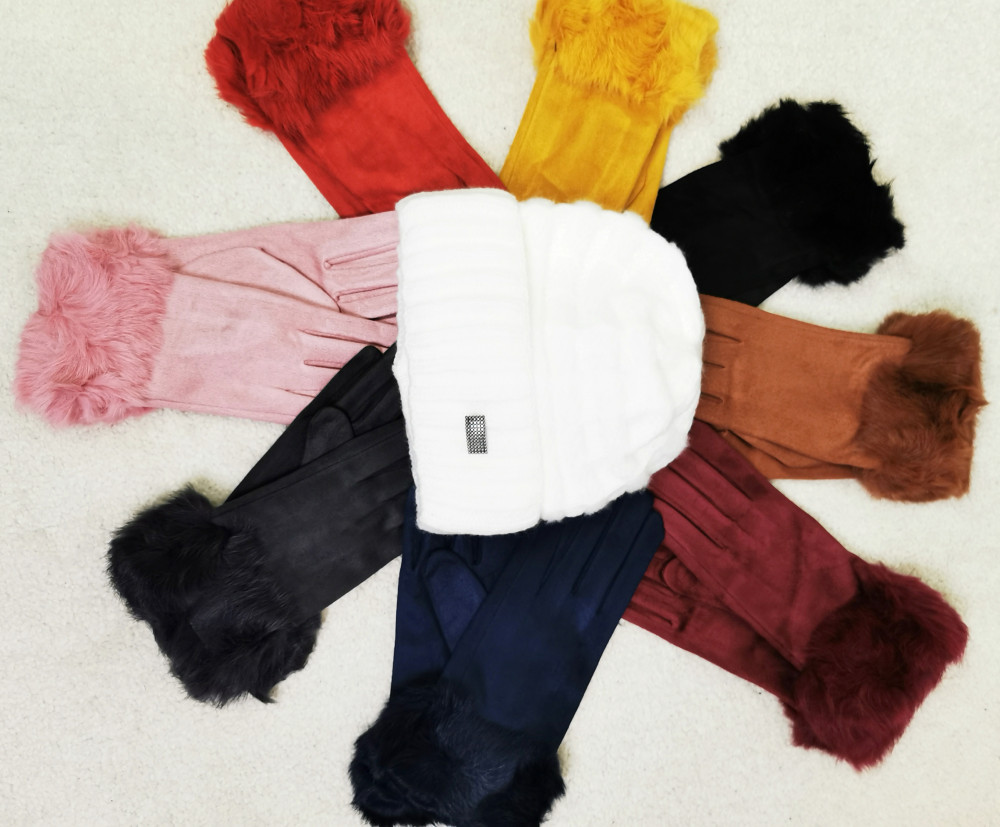 5 ujjas, vékony béléses, csuklónál szőrmés, velúros anyagú, telefon kezelős pamut kesztyű.