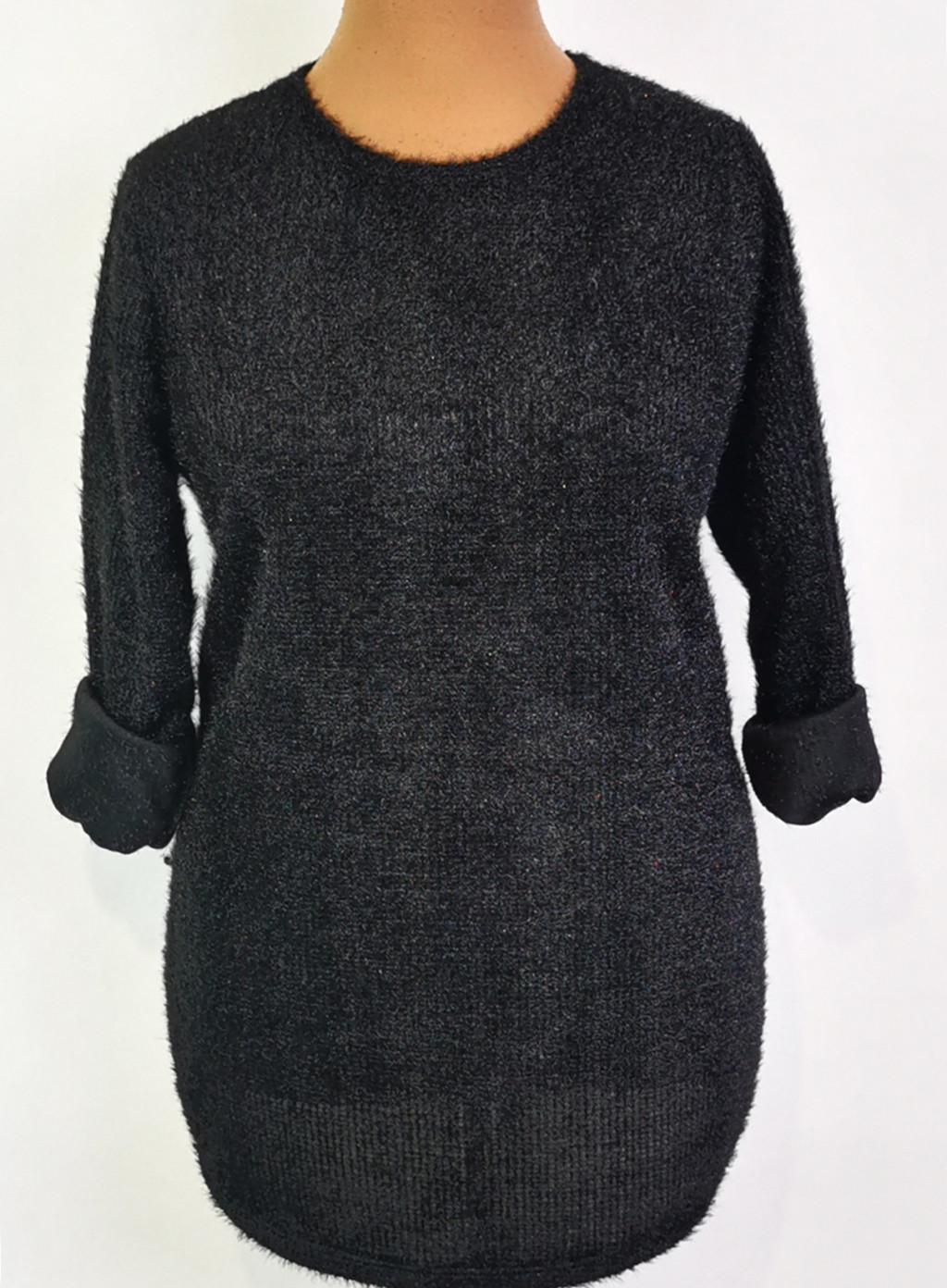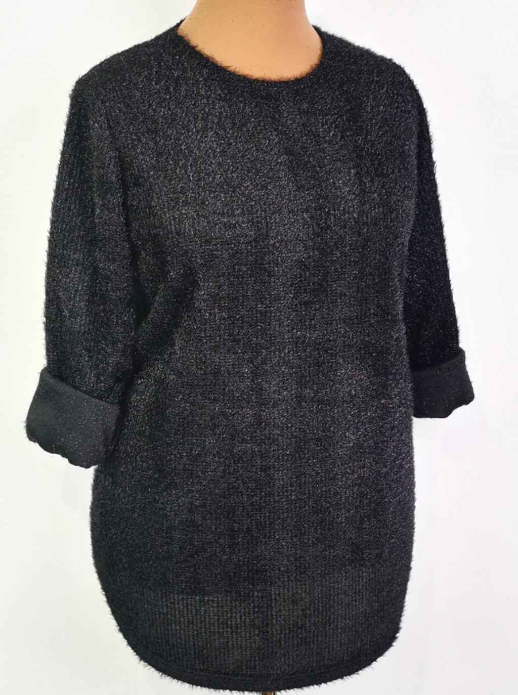 Gyönyörű, fekete színű, puha anyagú, gépi kötött, anyagában mintás, pulóver, ajándék sállal.