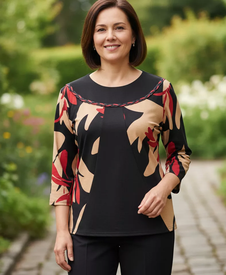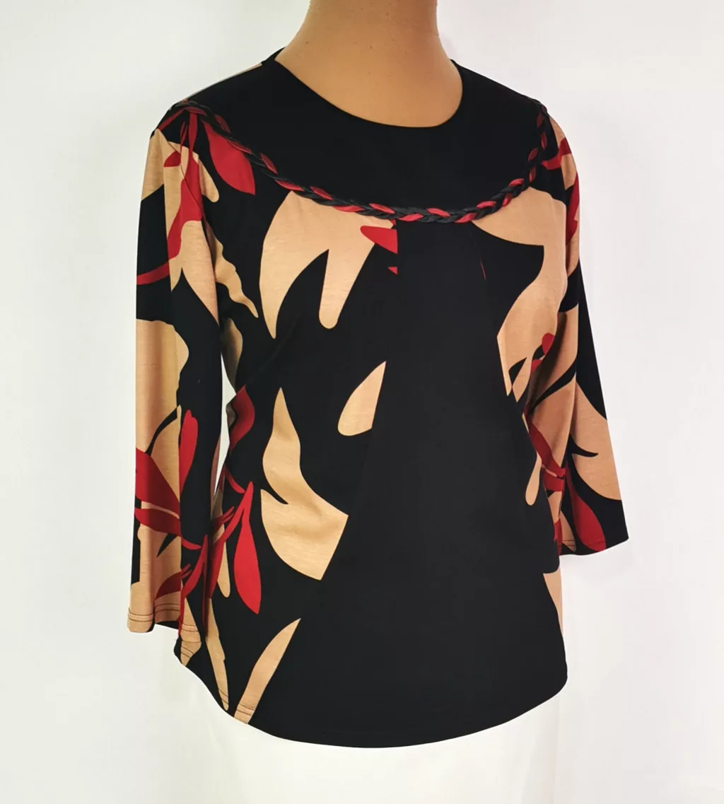 Kerek nyakú, 3/4-es ujjú, Barna-bordó-fekete színű mintás, selymes anyagú felső. 2-3 cm-t enged.
