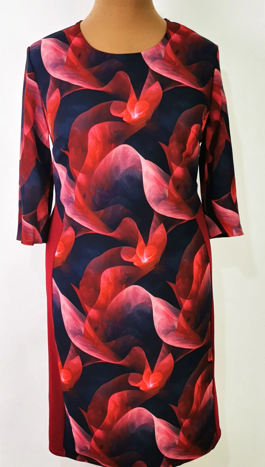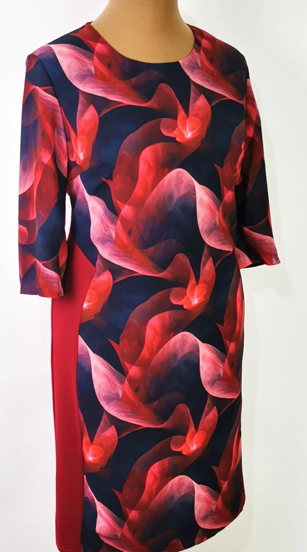 Kerek nyakú. 3/4-es ujjú, hátul és oldalt bordó színű, elől és az ujja bézs-sötétkék színű betéttel díszített, selymes anyagú ruha. 3-4 cm-t enged.