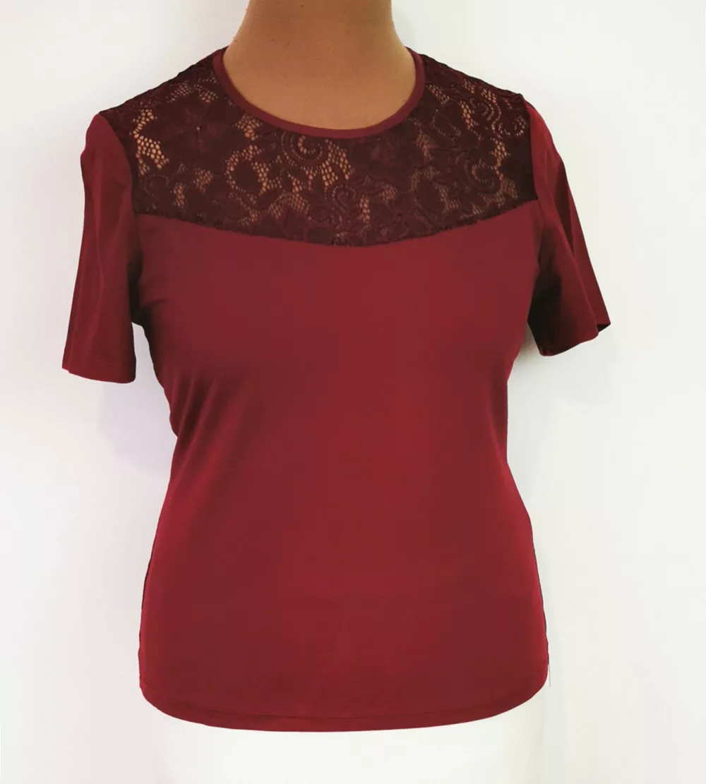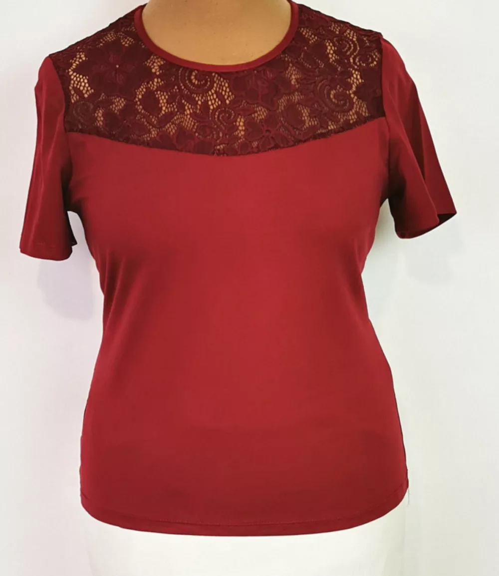 Kerek nyakú, bordó színű, rövid ujjú, elől csipkebetéttel díszített, pamutos, rugalmas anyagú felső. 3-4 cm-t enged.