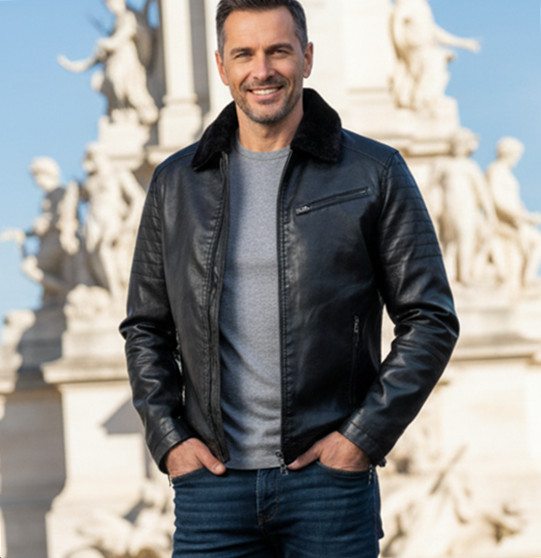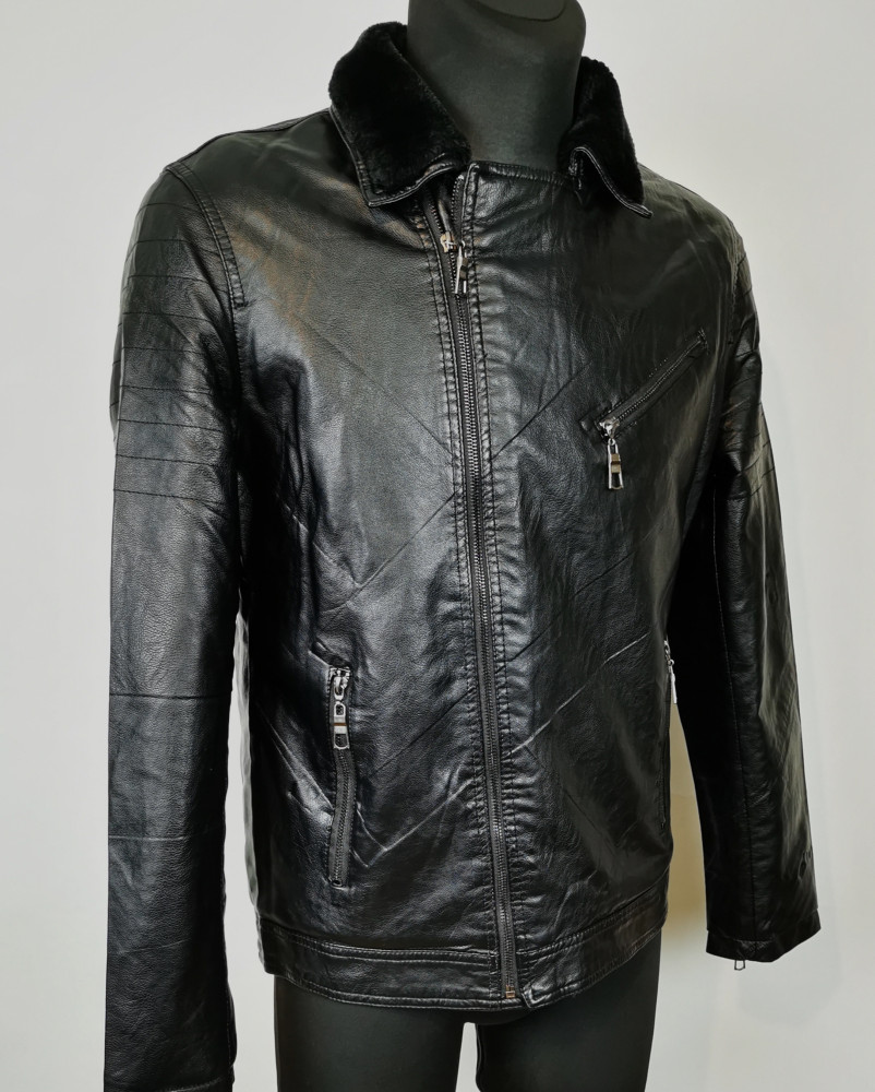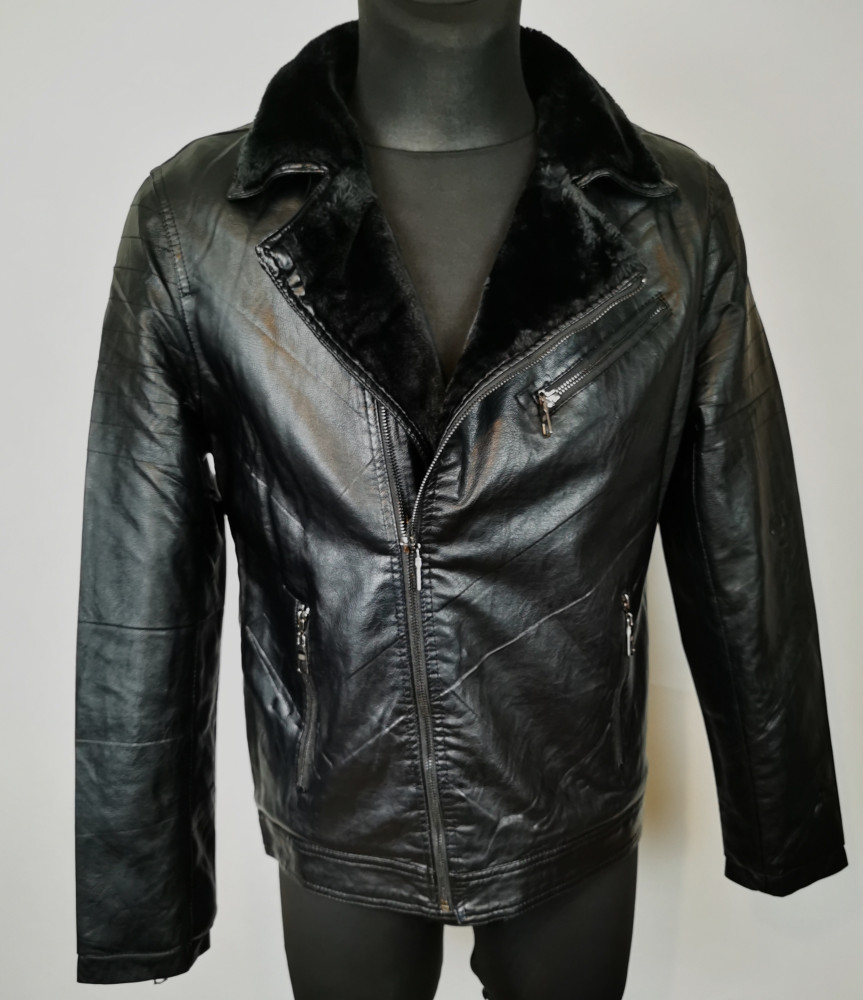 Fekete színű, szőrme bélelt, zsebes, cipzáras, műbőr férfi dzseki .