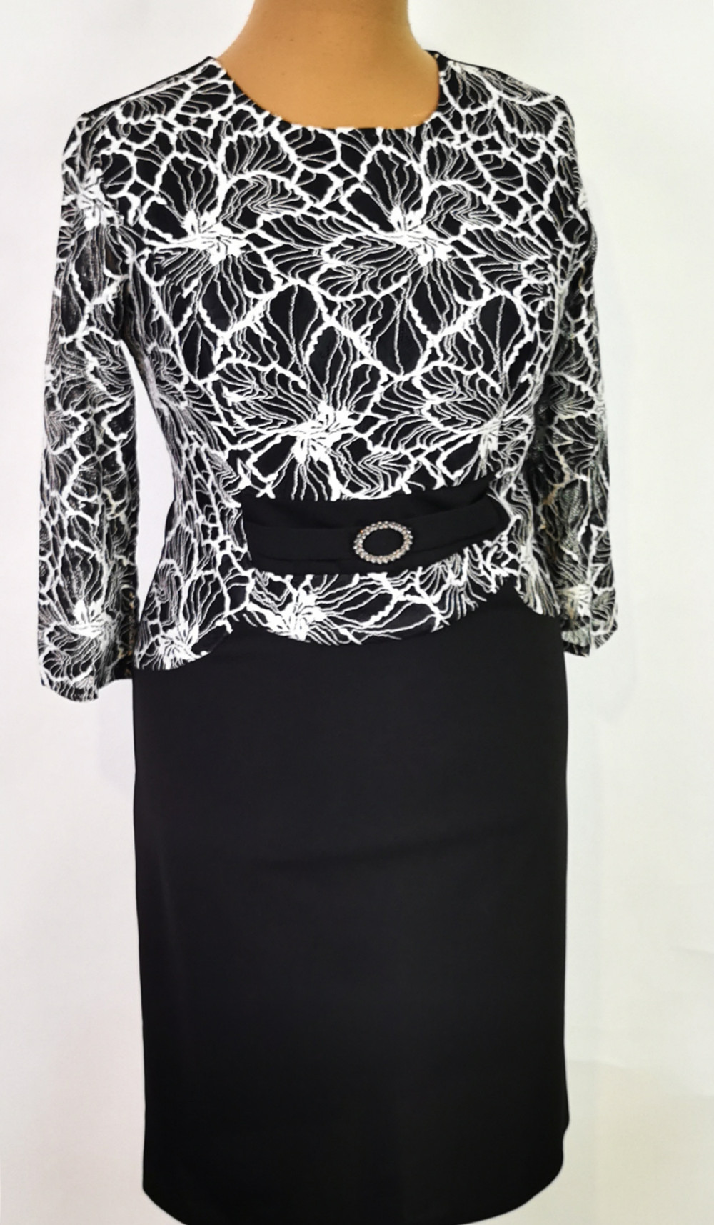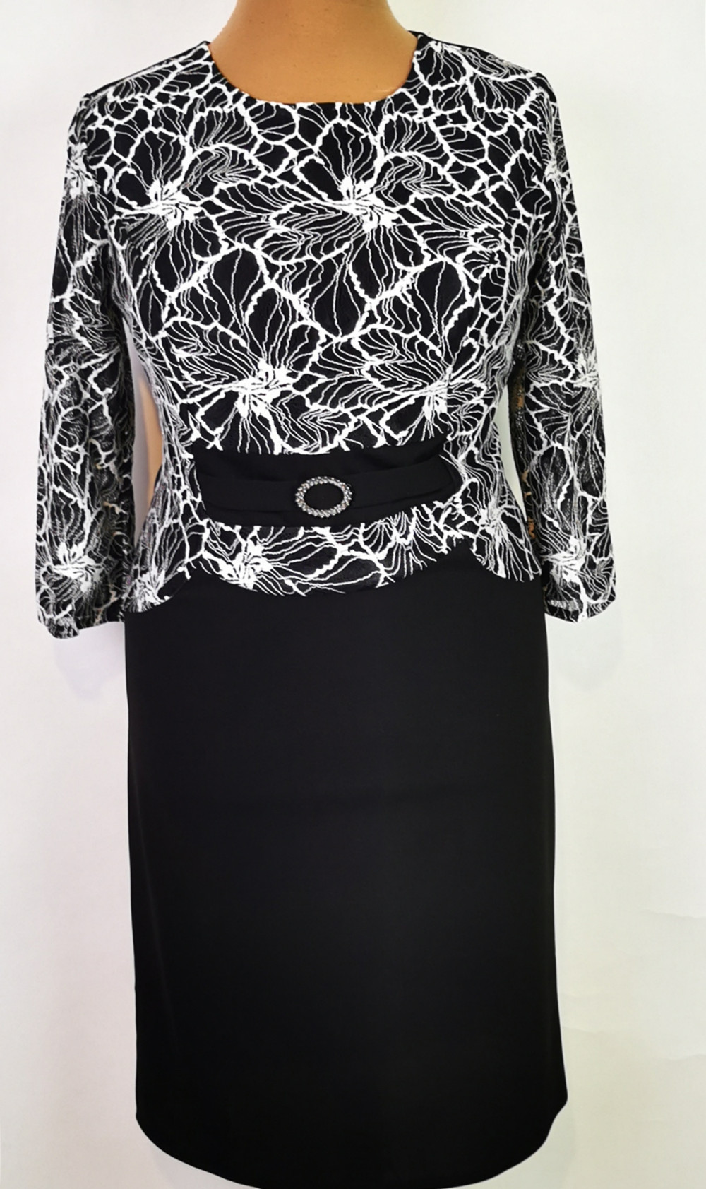 Kerek nyakú, 3/4-es ujjú, hátul felsliccelt, fekete alapszínű, felső része elől és az ujja fehér színű, csipke rátétes, díszcsatos ruhaa. 3-4 cm-t enged.