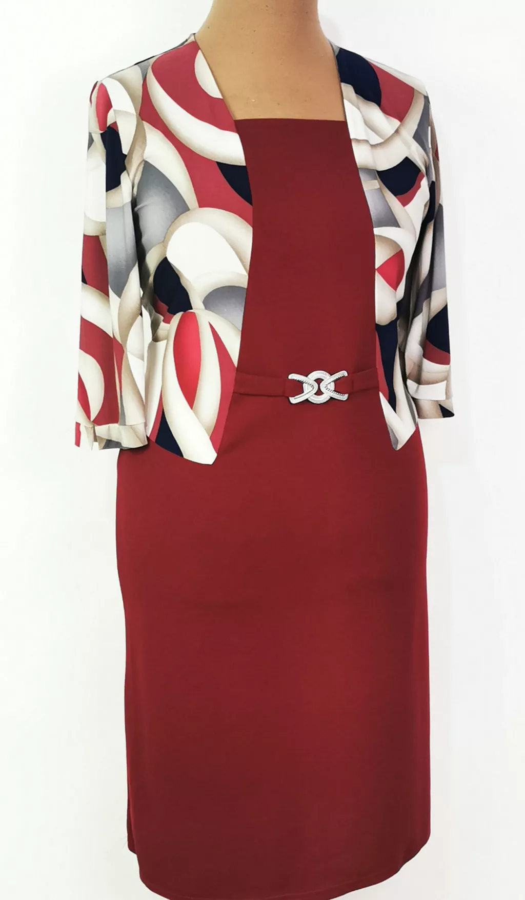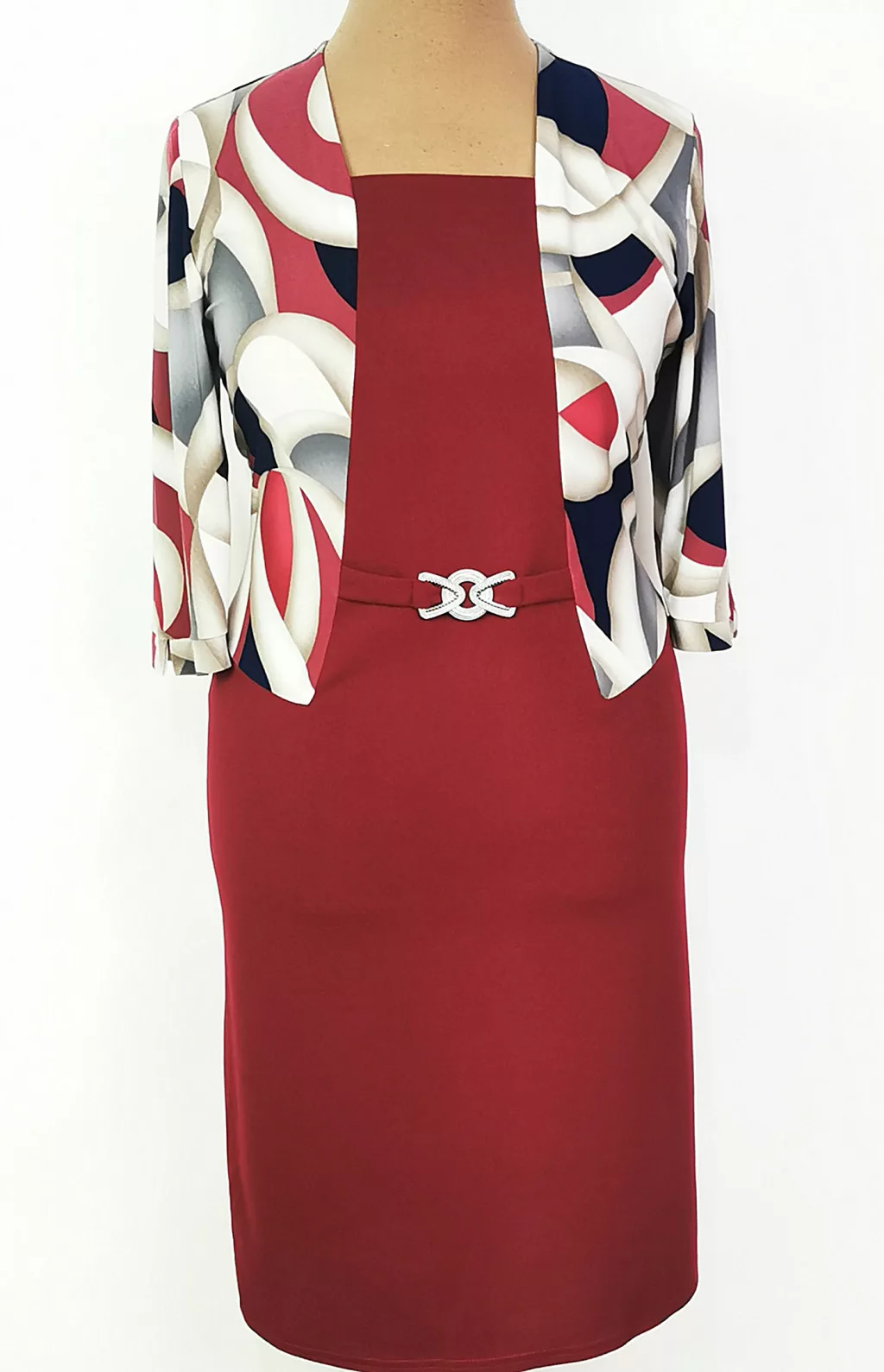 Bordó alapszínű, felső része, bézs-bordó-sötétkék színű mintával díszített, deréknál díszcsatos ruha. 5-6 cm-t enged.