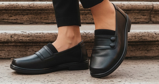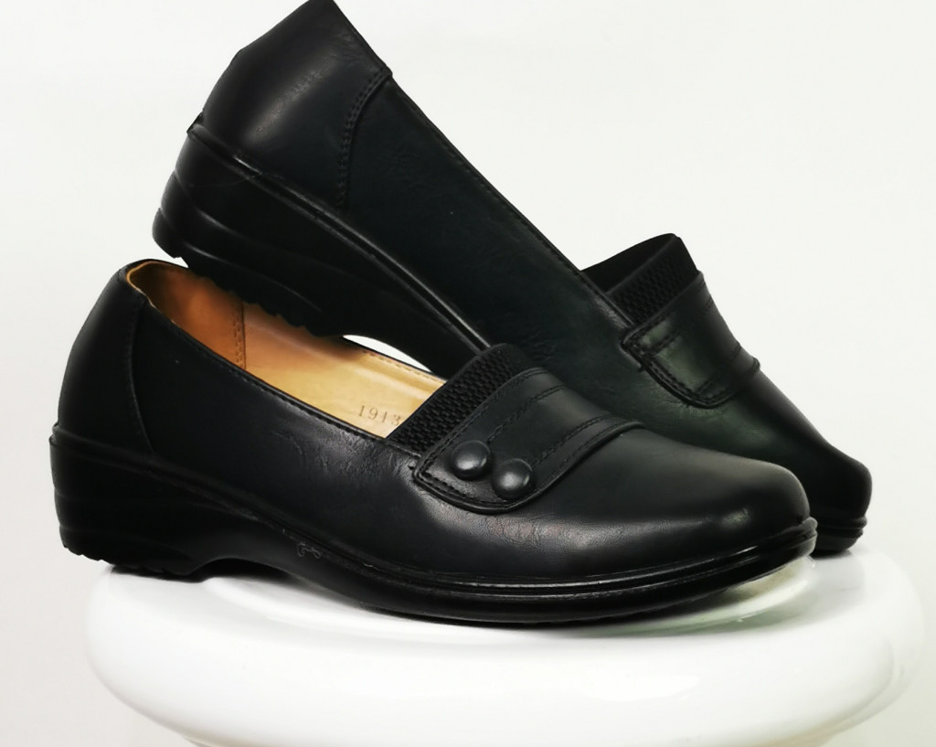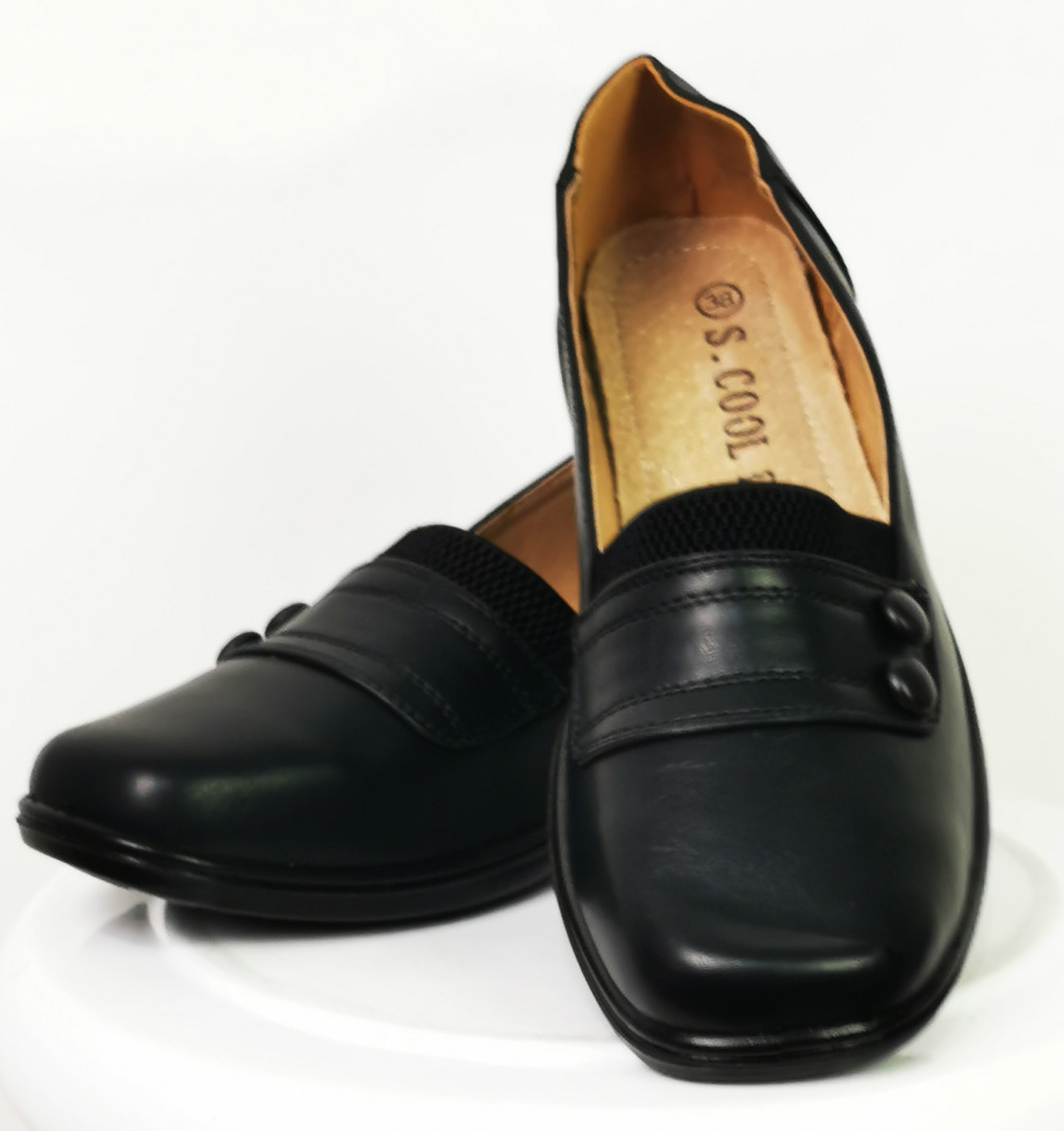 Fekete színű, elől díszített, felül gumibetétes, teletalpú cipő.
