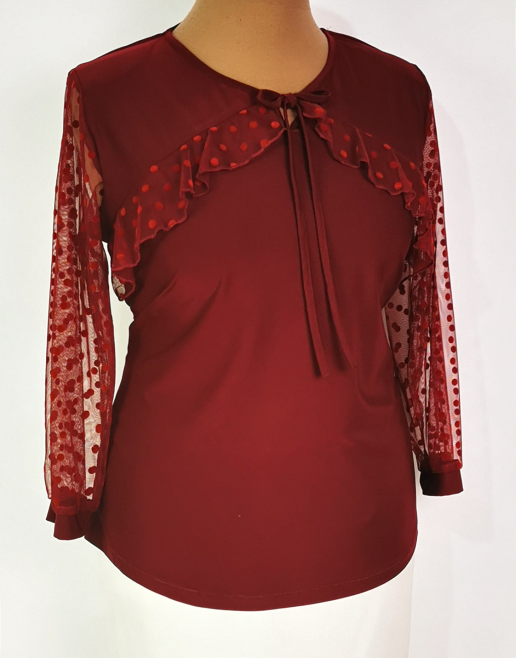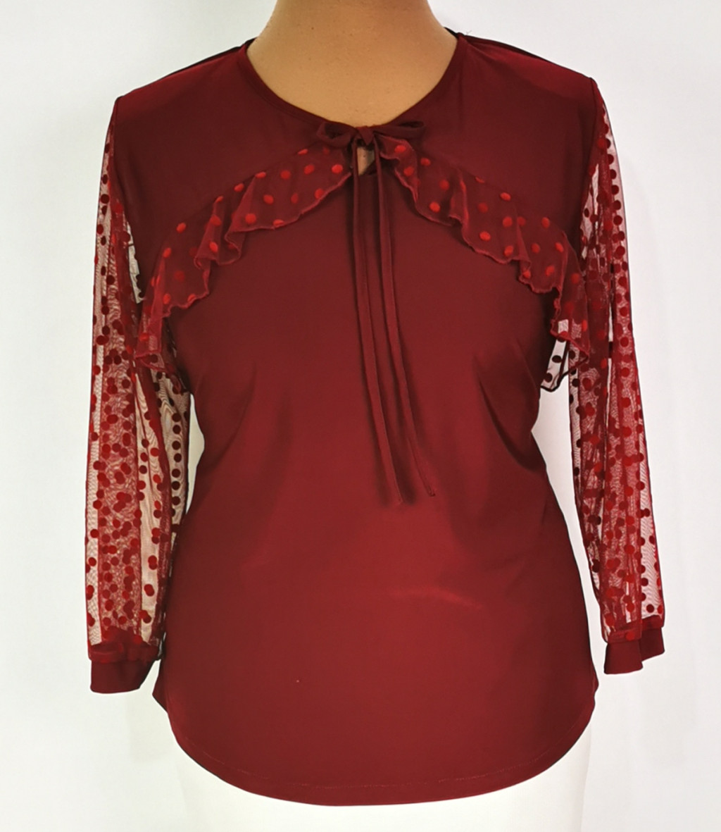 Kerek nyakú, 3/4-es ujjú, elől-hátul bordó színű mintás, nyaknál muszlin fodorral díszített, selymes, rugalmas anyagú felső. 6-7 cm-t enged.
