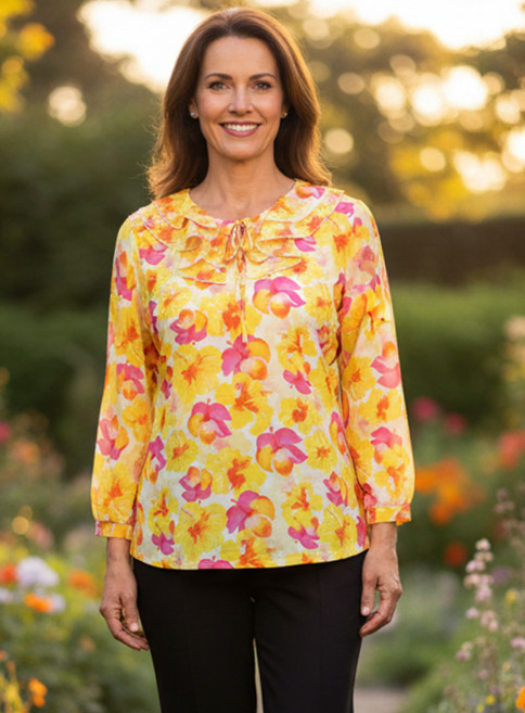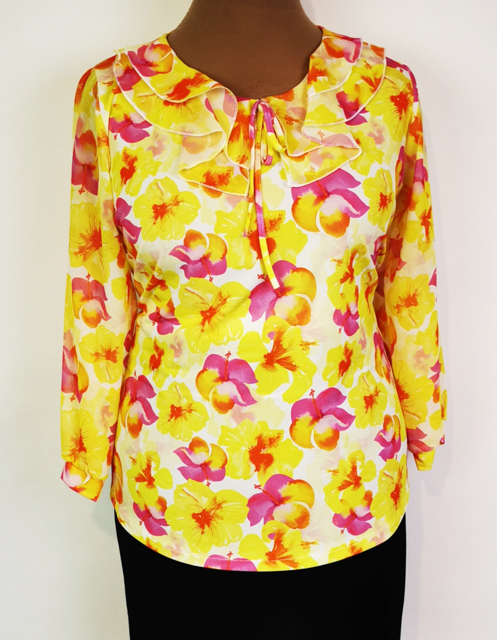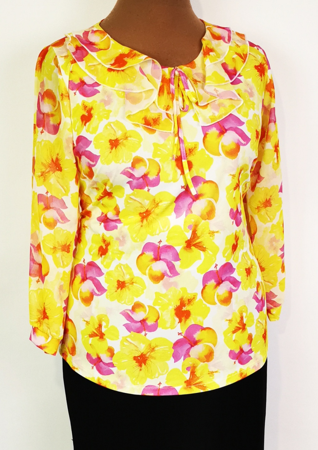 Kerek nyakú, 3/4-es ujjú, elől-hátul, sárga-pink színű, virág mintás, nyaknál muszlin fodorral díszített, selymes, rugalmas anyagú felső. 6-7 cm-t enged.
