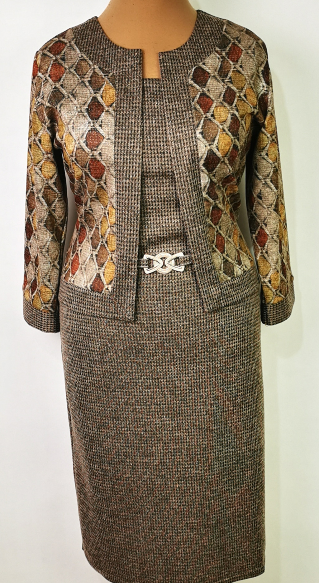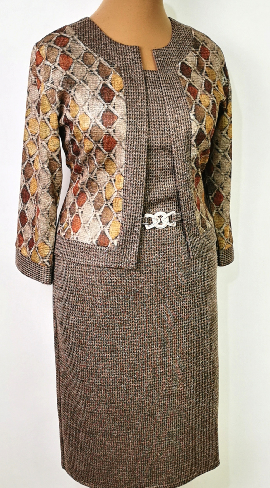 Kerek nyakú, 3/4-es ujjú, felsliccelt, sötétbarna-világosbarna színű, enyhén csillogó, felső része elől színes-pepita mintás, díszcsatos ruha. 3-4 cm-t enged.