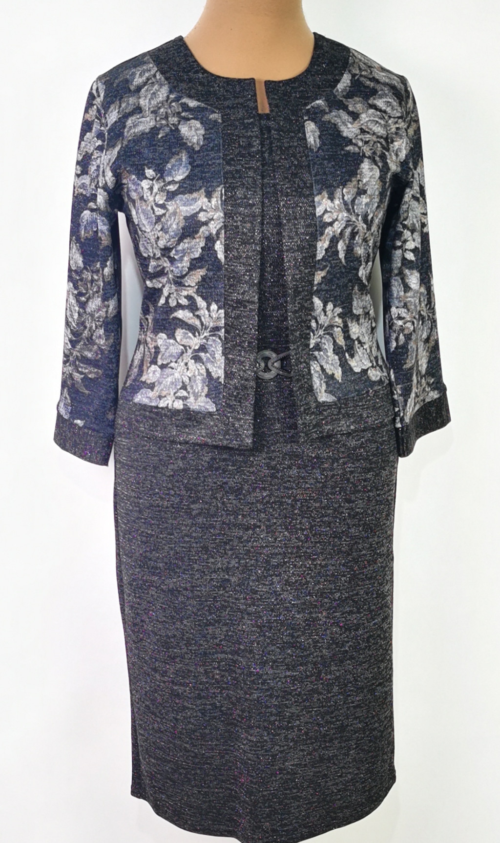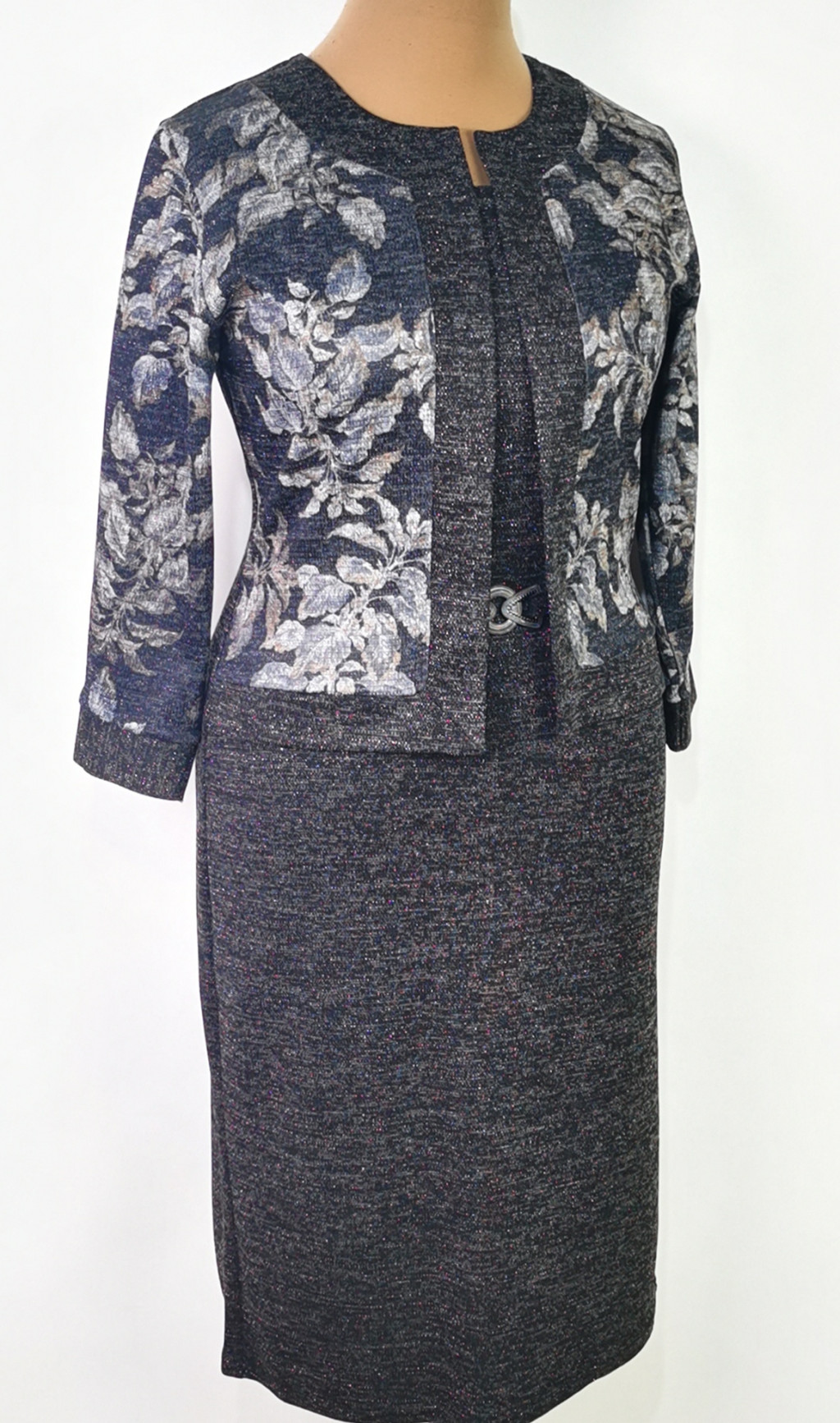 Kerek nyakú, 3/4-es ujjú, felsliccelt, fekete alapszínű,enyhén csillogó, felső része elől virág mintás, díszcsatos ruha. 3-4 cm-t enged.