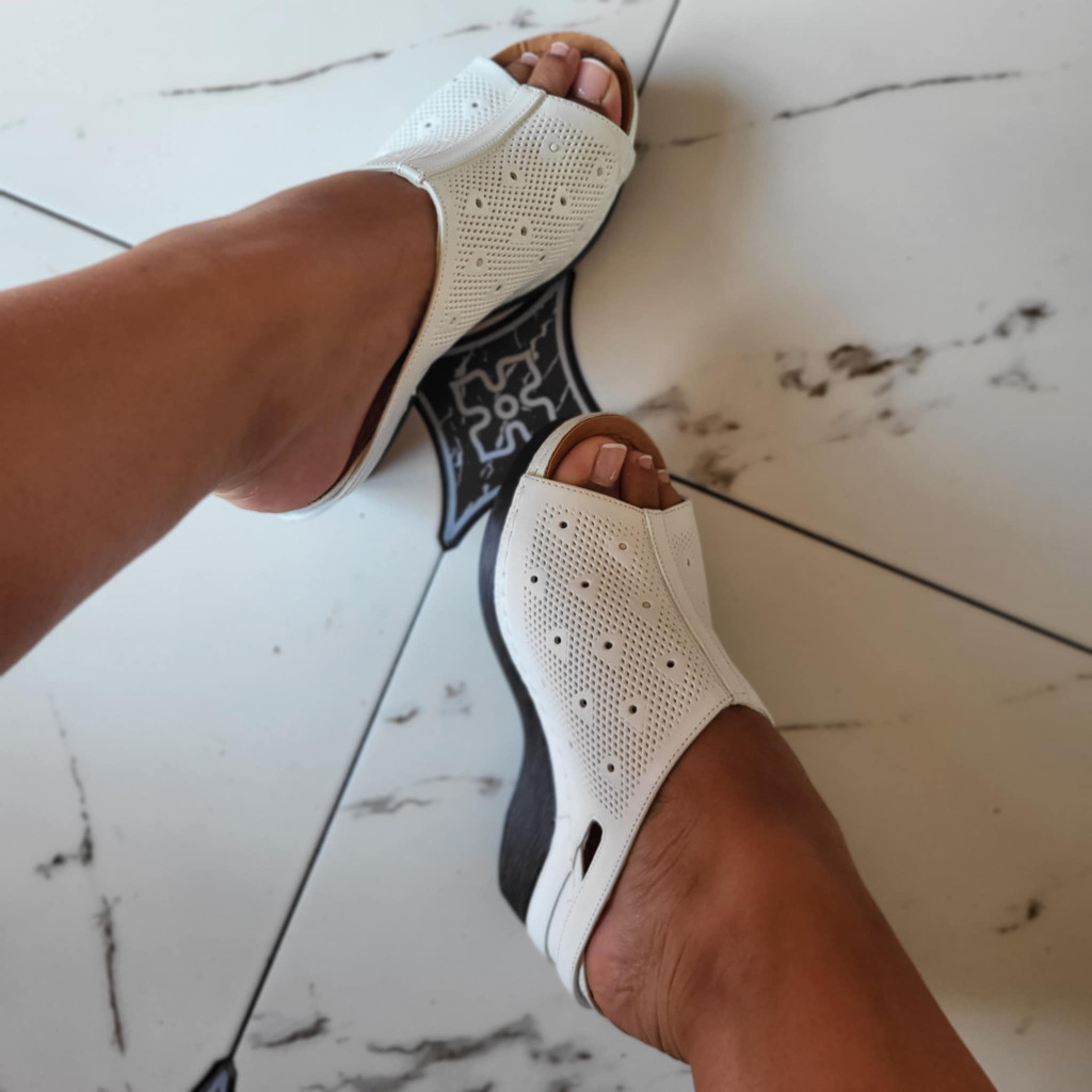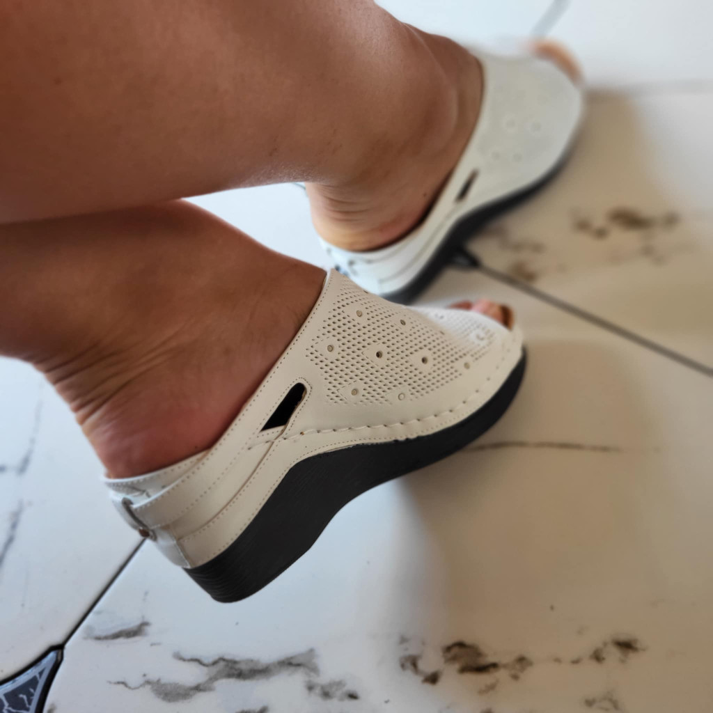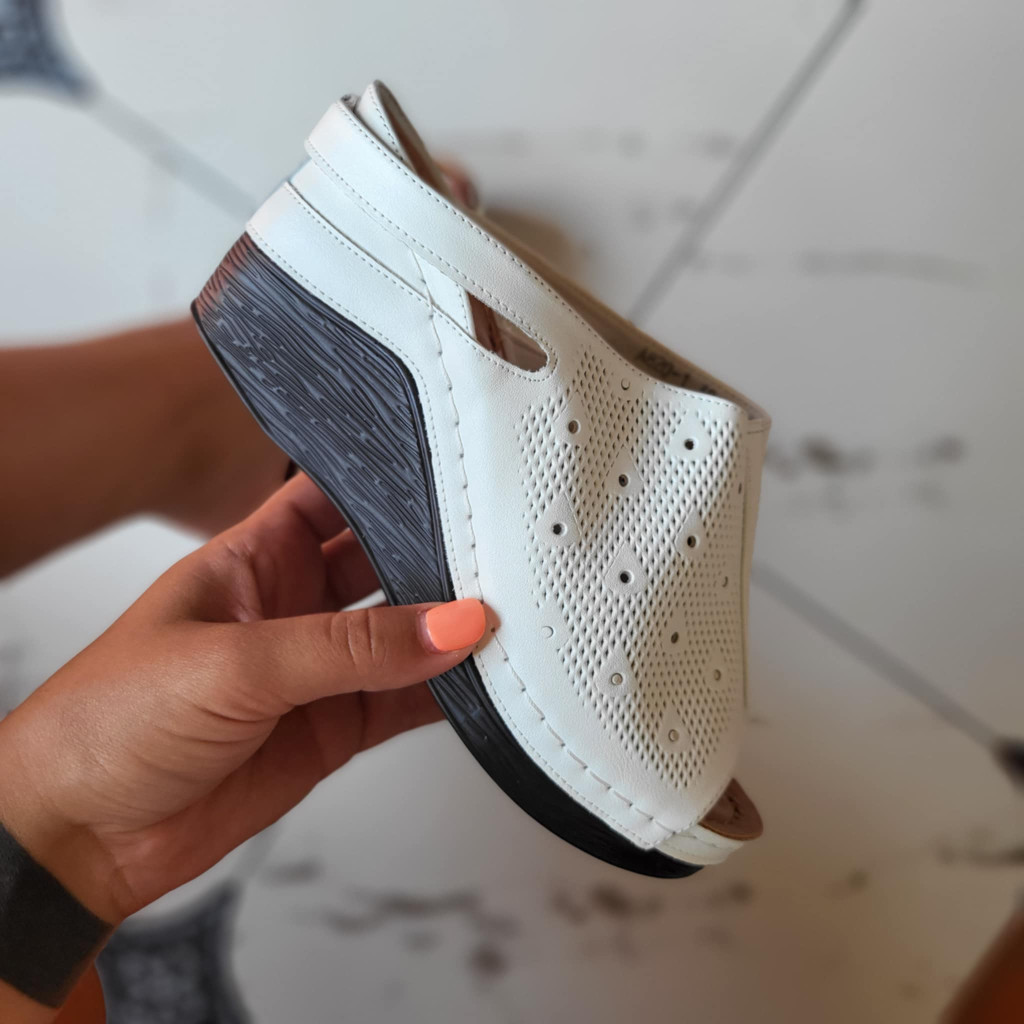 Fehér színű, emlékezős talpú, alkalmi papucs. Sarok magasság kb.: 7 cm.