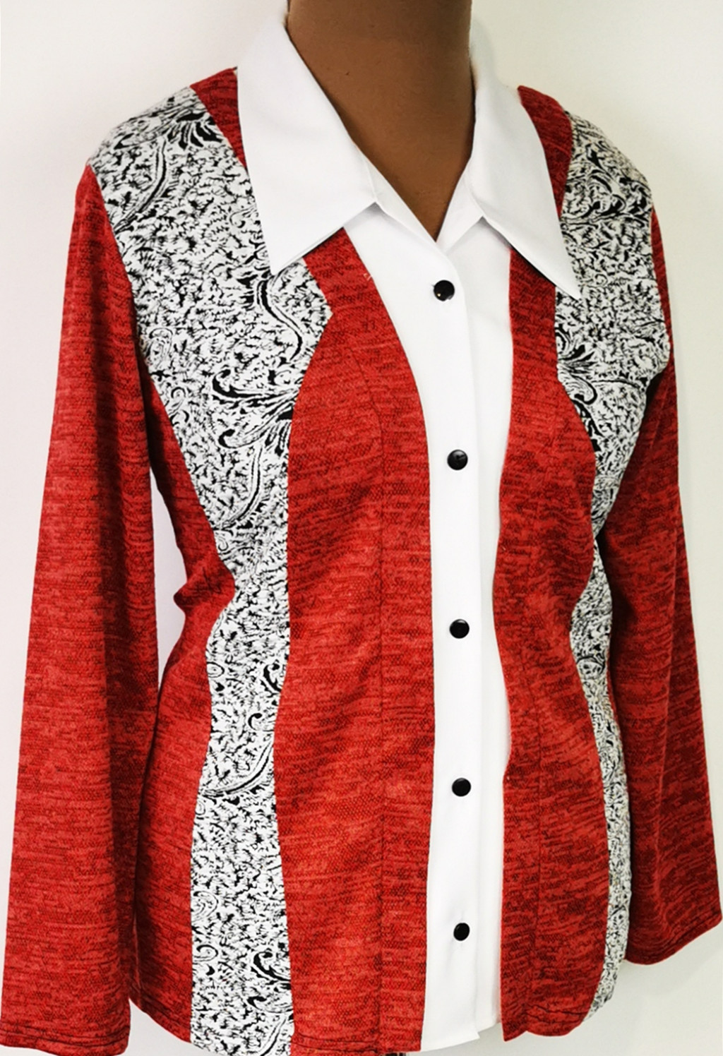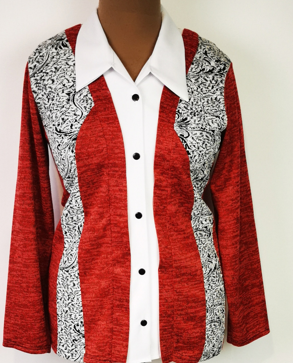 Ingnyakú, hosszú ujjú, elől gombos záródású, hátul egyszínű, elől bordó színú, cirmos mintás, fekete-fehér betétes, karcsúsított felső . 3-4 cm-t enged.