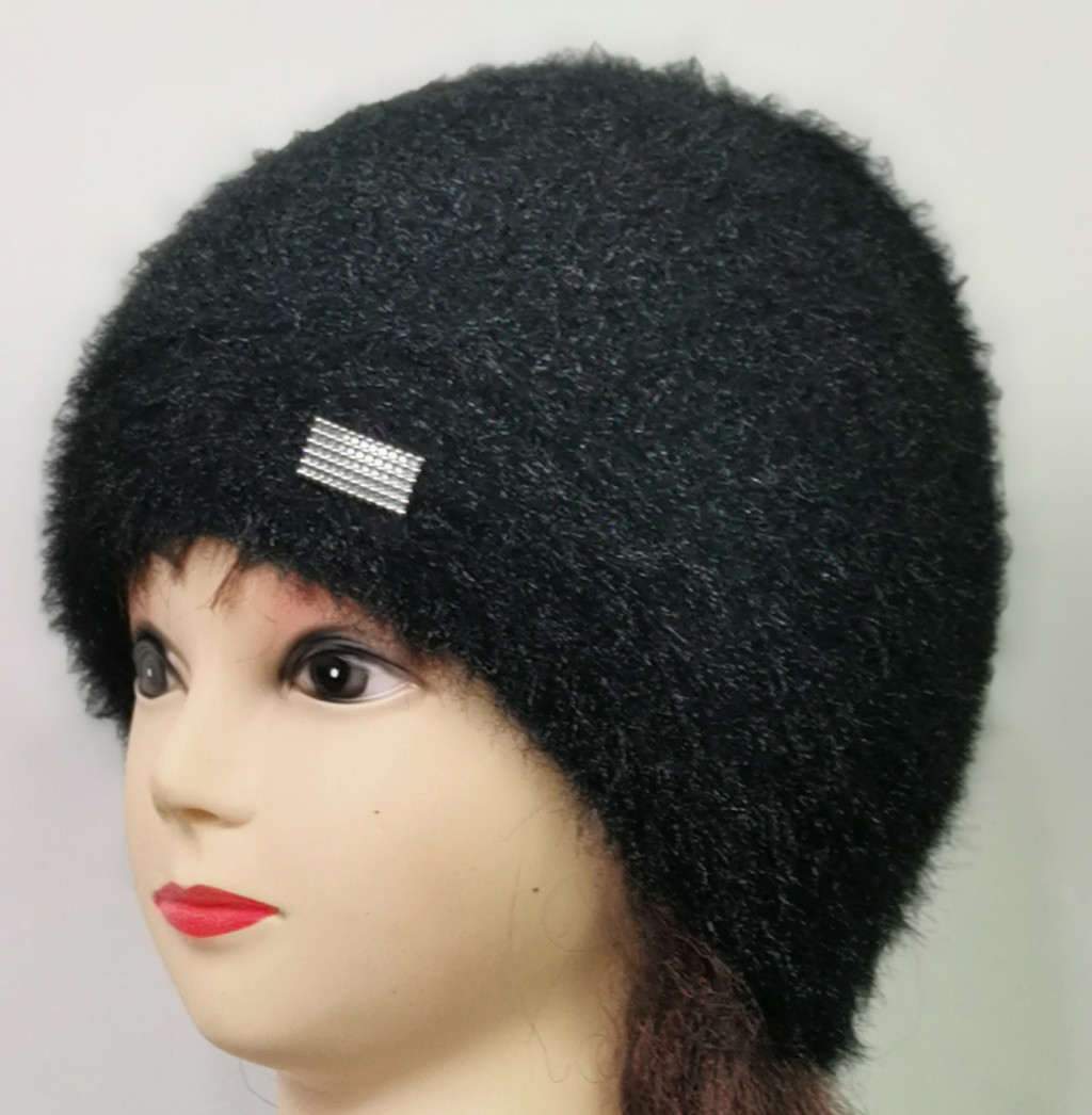 Gépi kötött, dupla anyagú, fekete színü, anyagában mintás, díszített sapka