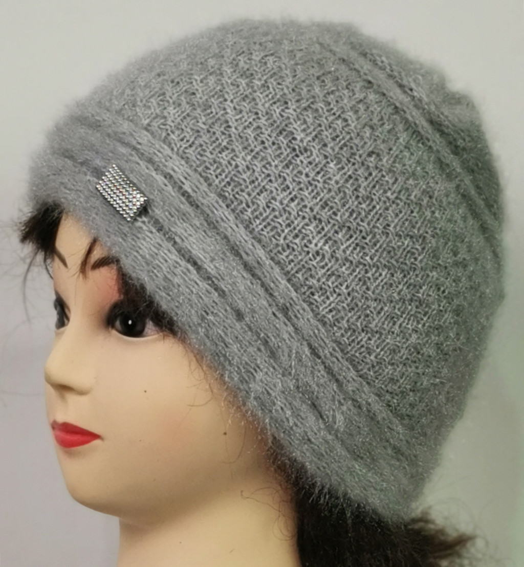 Gépi kötött, dupla anyagú, galambszürke színü, anyagában mintás, díszített sapka