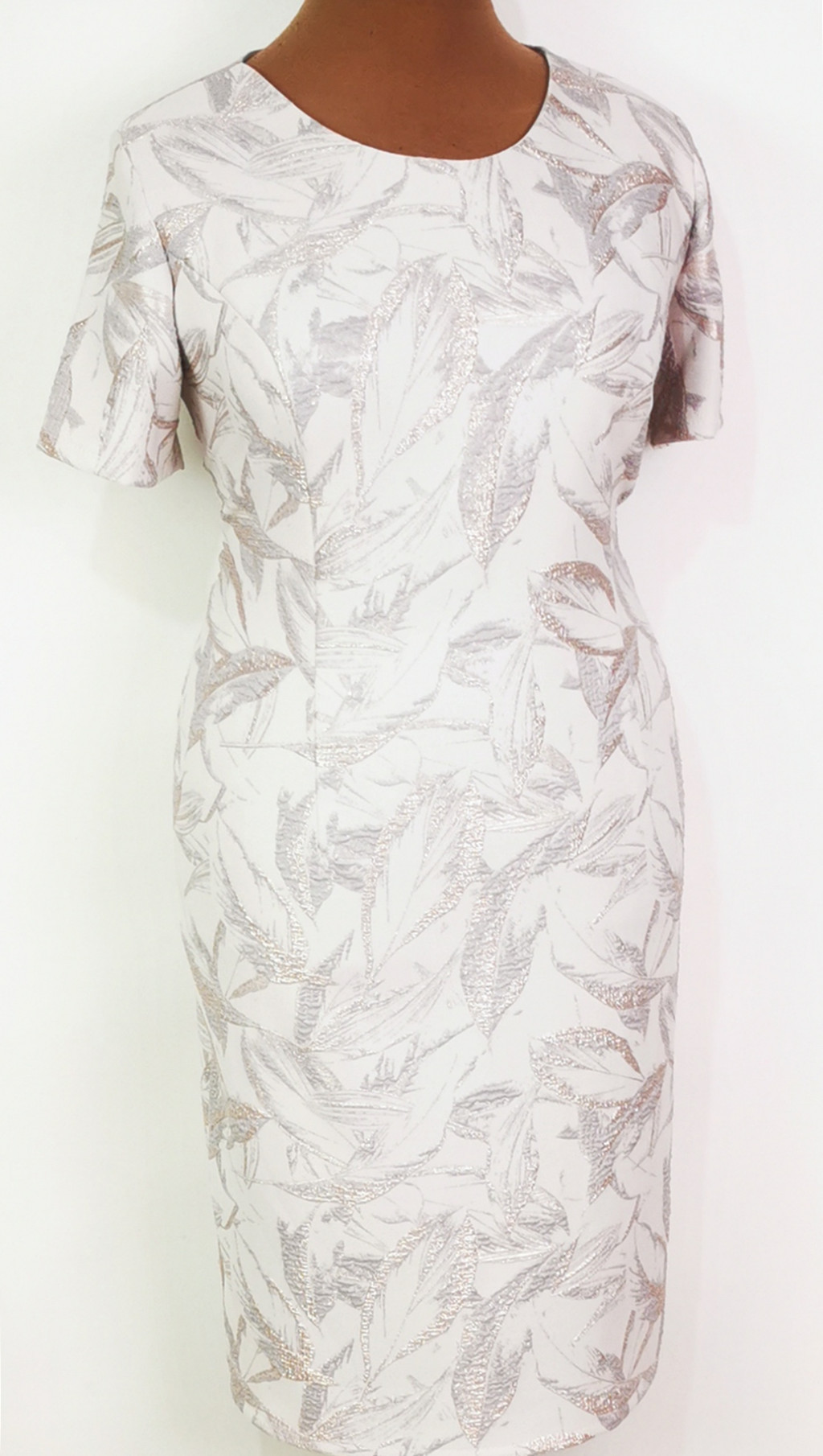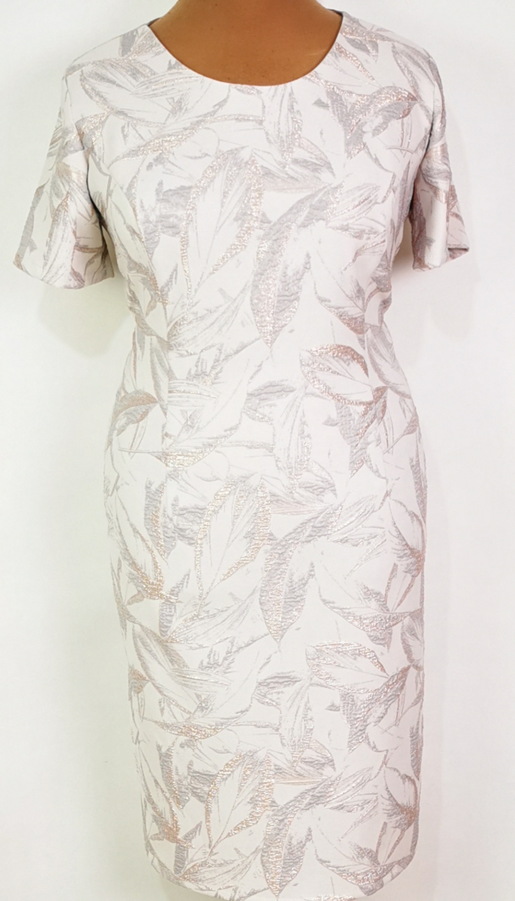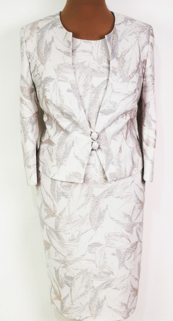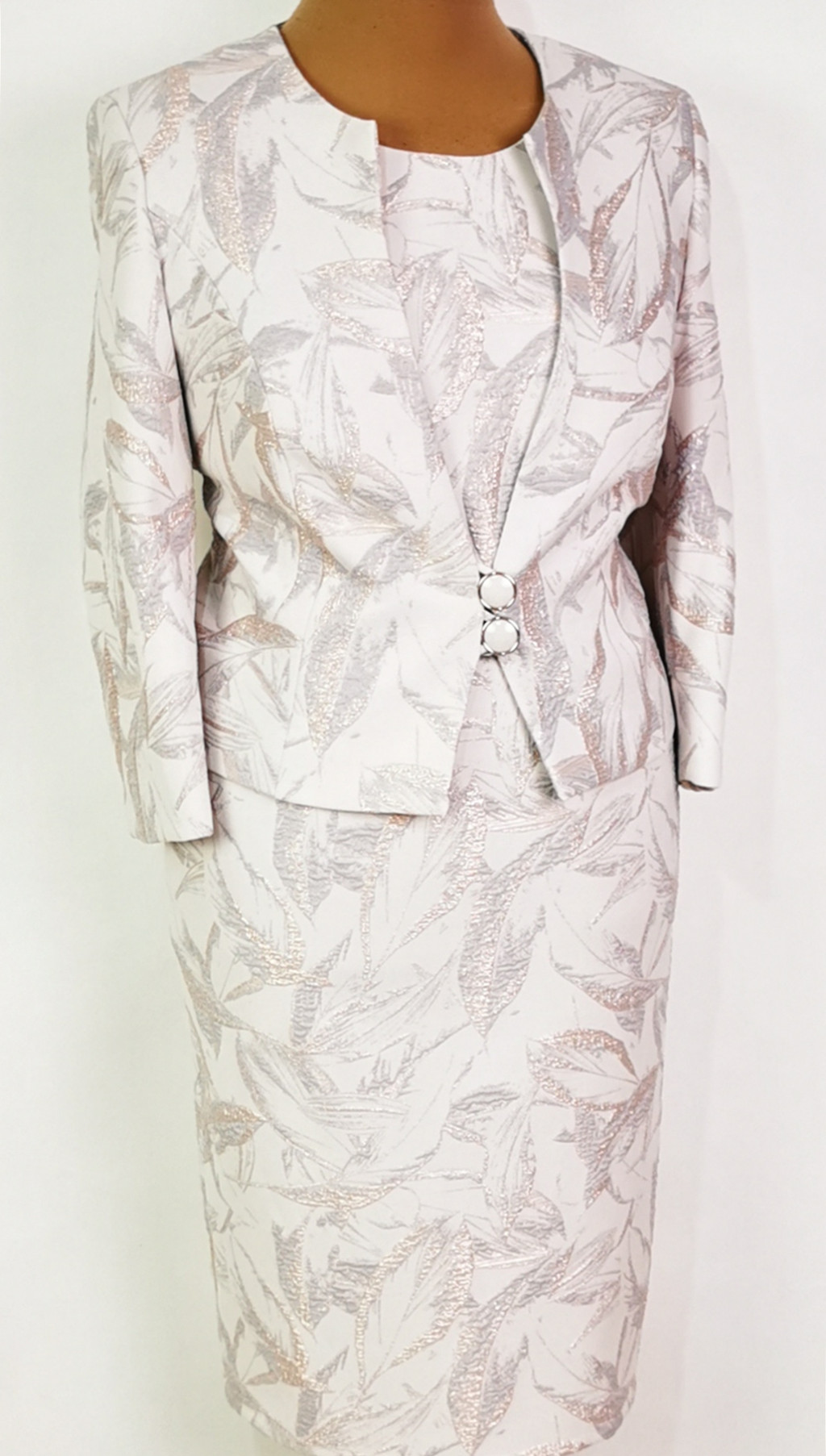 Gyönyörű, bézs színű, két részes alkalmi kosztüm. Ruha része kerek nyakú, rövid ujjú, hátul derékig cipzáras, enyhén csillogó rajzolt virág mintával díszített. Blézere 3/4-es ujjú, selyembéléses, a ruhával megegyező mintával, két díszgombbal díszített. 2-3 cm-t enged.
