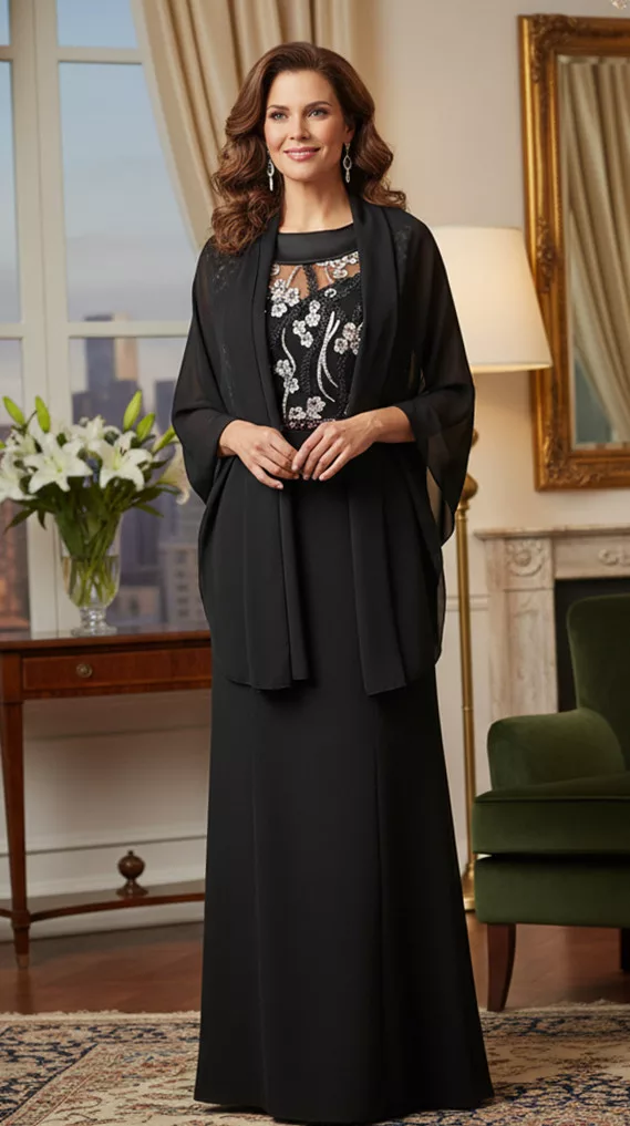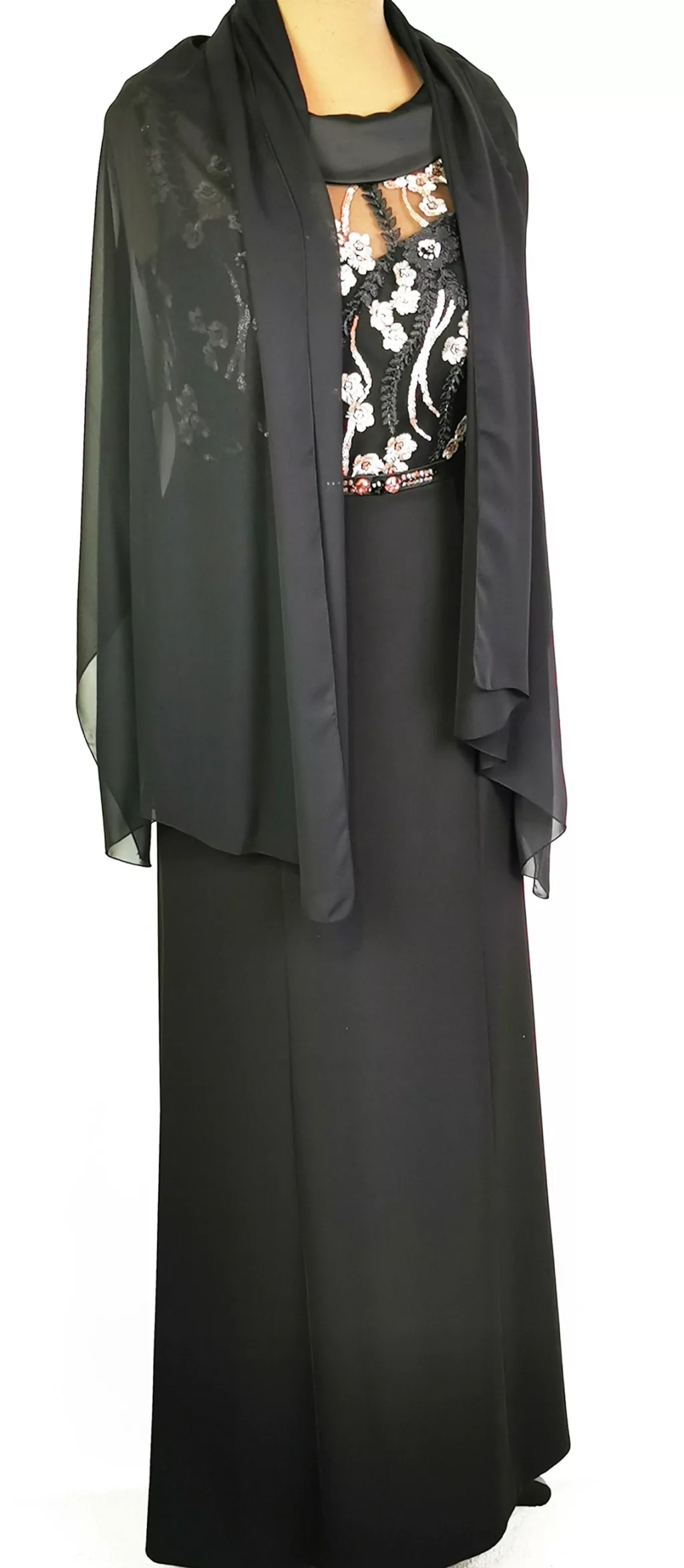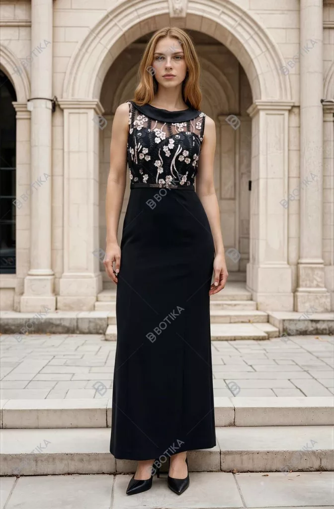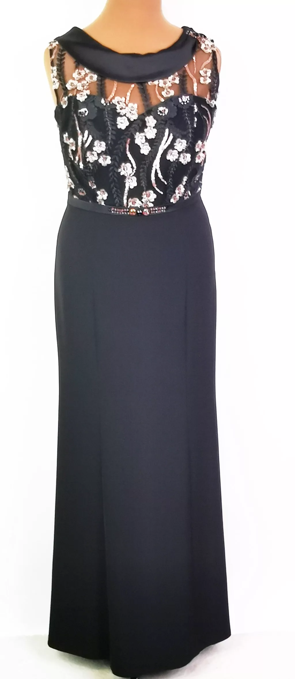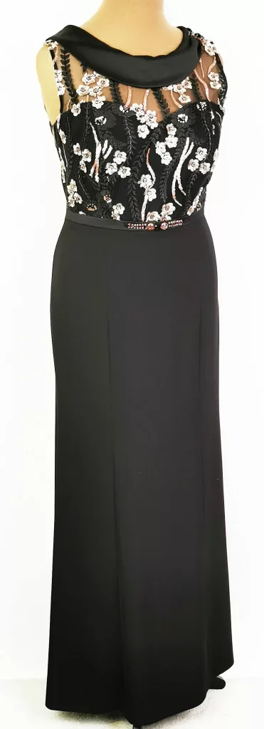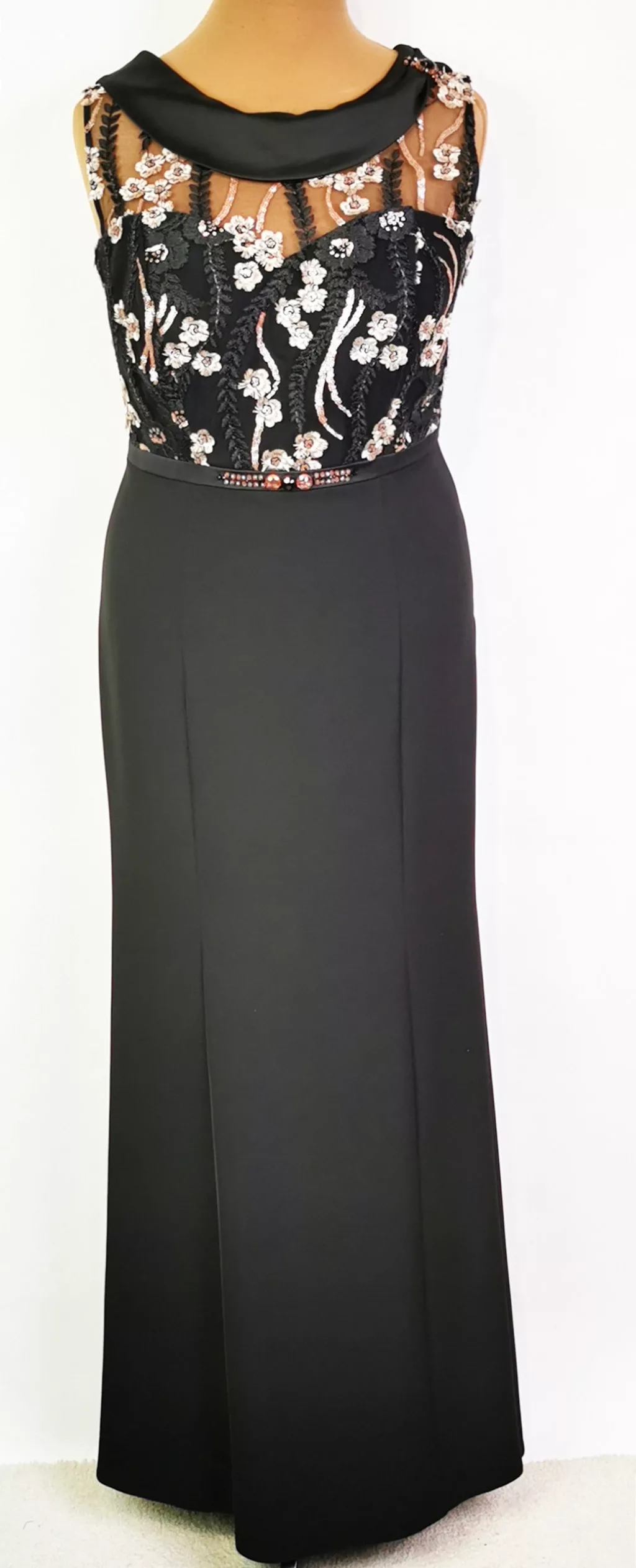 Gyönyörű, fekete színű alkalmi maxi ruha. Ruha része, kerek nyakú, ujjatlan, oldalt cipzáras, selyembéléses. Felső része elől-hátul, bronz színű virágokkal díszített. 2-3 cm-t enged.