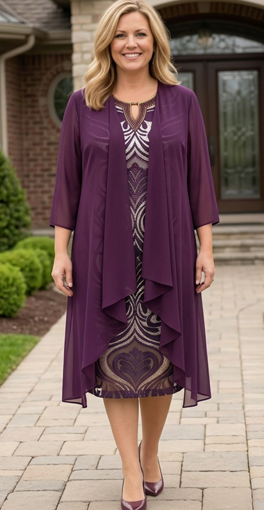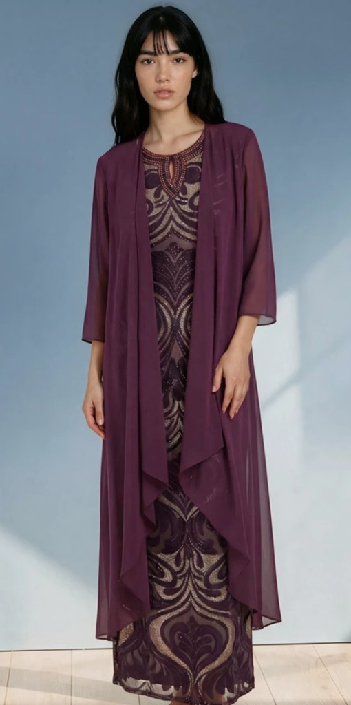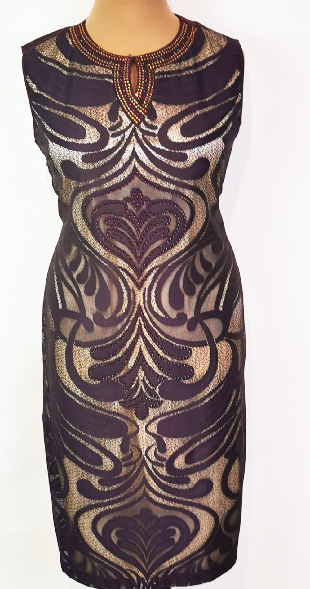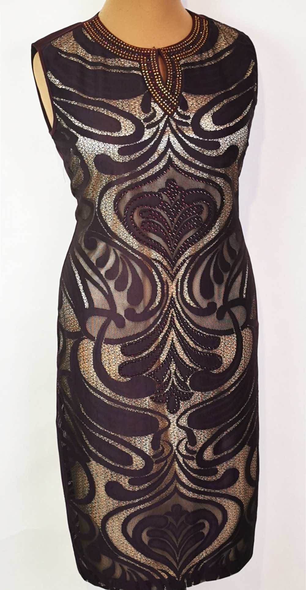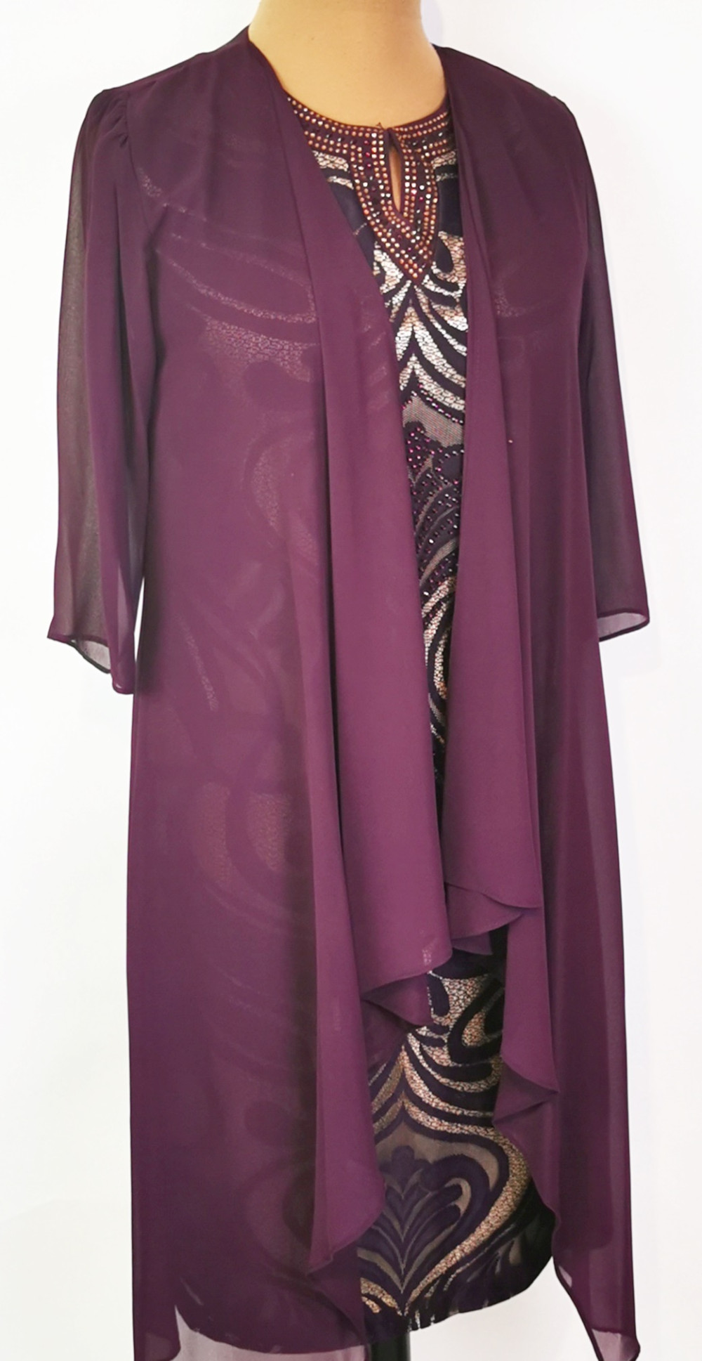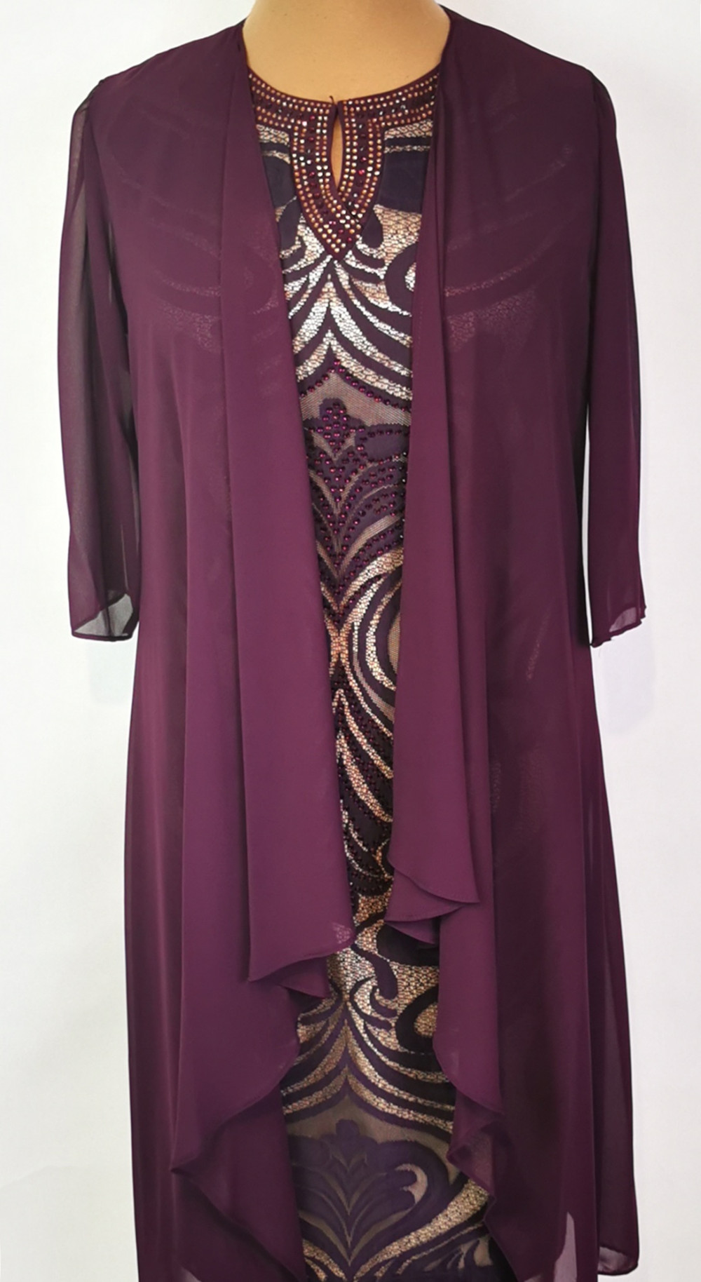 Gyönyörű két részes alkalmi ruha. Ruha része lila színű, kerek nyakú, ujjatlan, nyaknál cseppformájú kivágással, első része dupla anyagú, díszített. Pelerinje 3/4-es ujjú, nyitott. 1-2 cm-t enged.