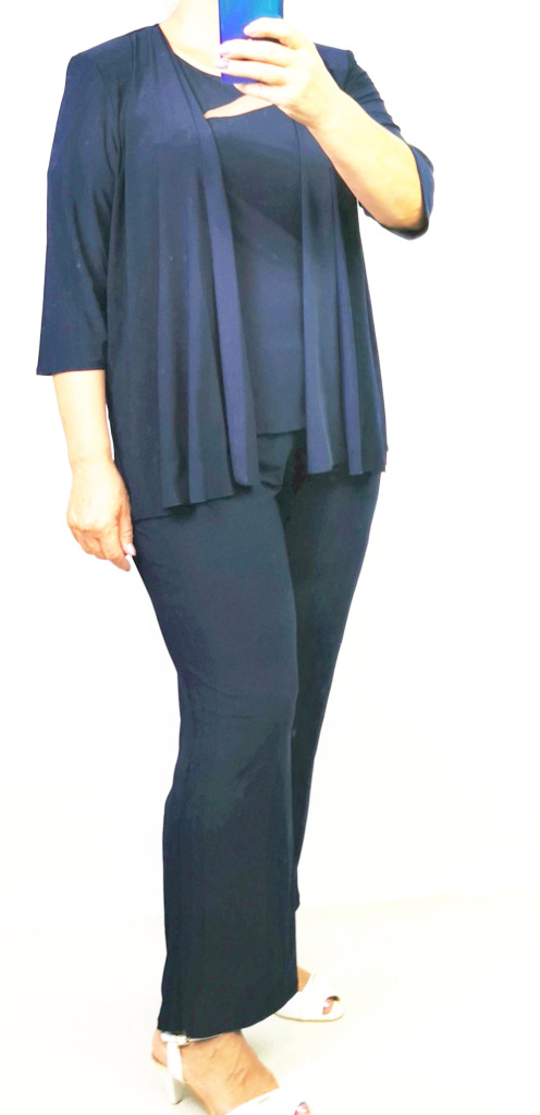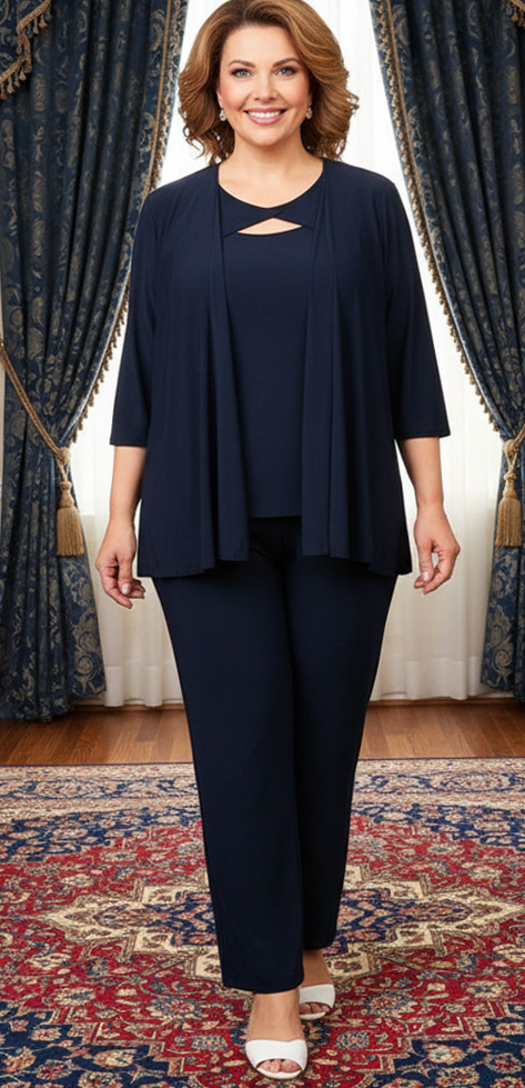 Gyönyörű, sötétkék színű, három részes alkalmi nadrág kosztüm. Nadrágja gumis dereku, selymes anyagú. Felső része kerek nyakú, rövid ujjú, nyaknál díszített. Blézere nyitott, 3/4-es ujjú, selymes anyagú. 6-7 cm-t enged.