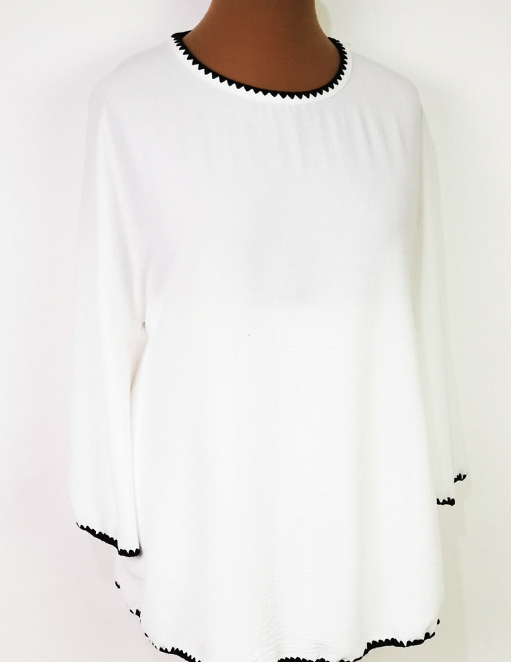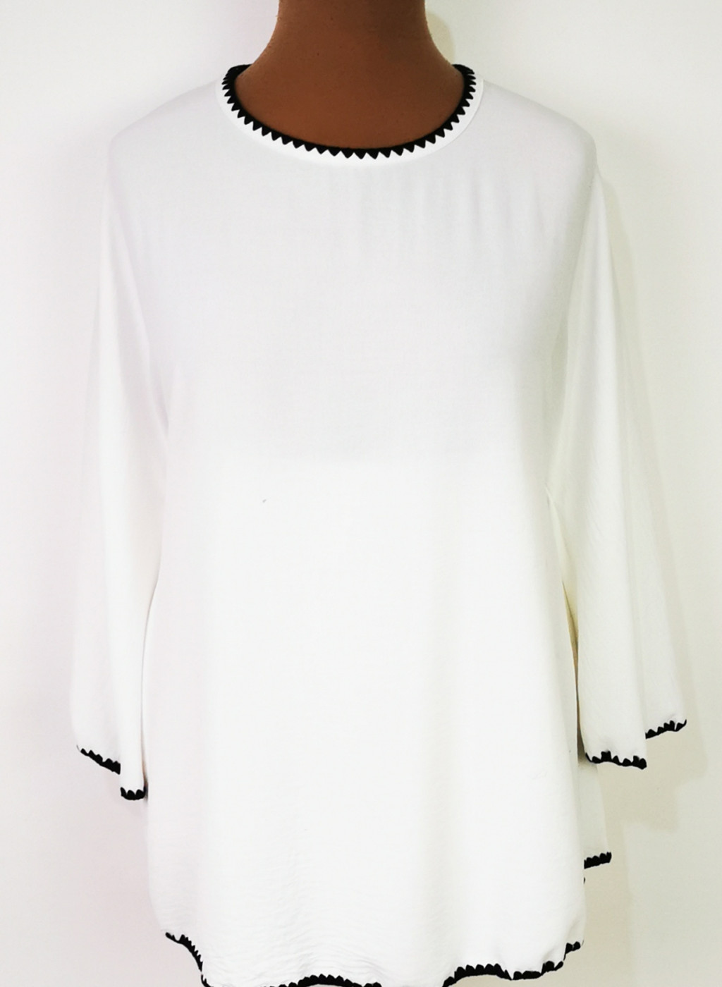 Kerek nyakú, 3/4-es tölcsér ujjú, fehér színű, lefelé bővülő, pamutos anyagú felső. 7-8 cm-t enged.