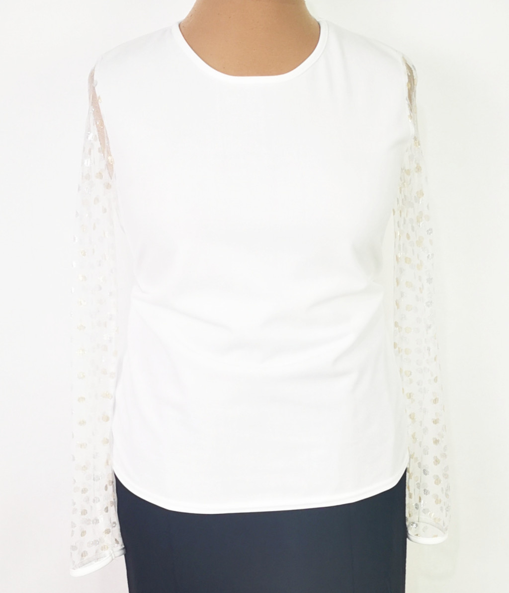 Kerek nyakú, hosszú, tüllös ujjú, fehér alapszínű, selymes anyagú felső. 1-2 cm-t enged.
