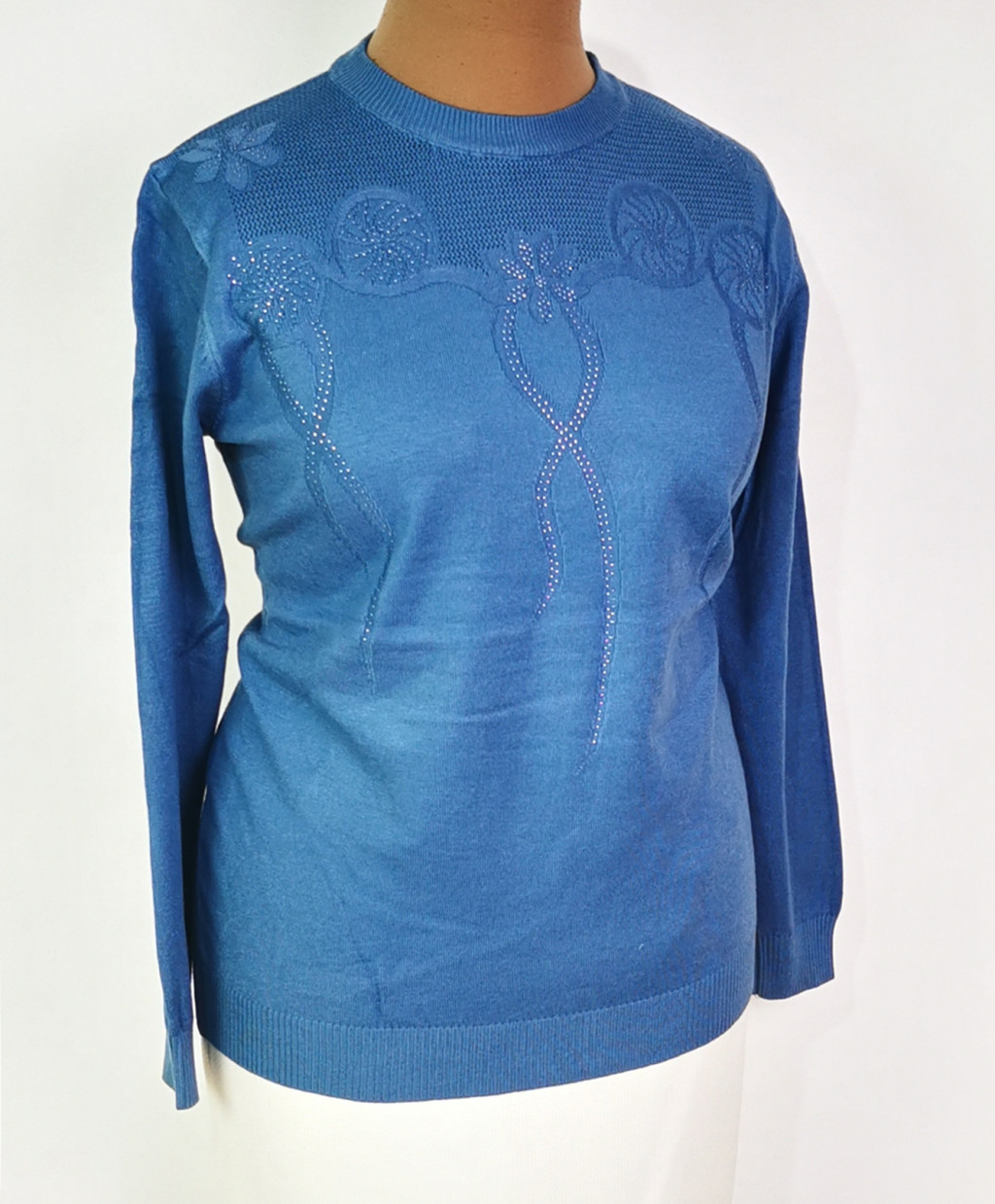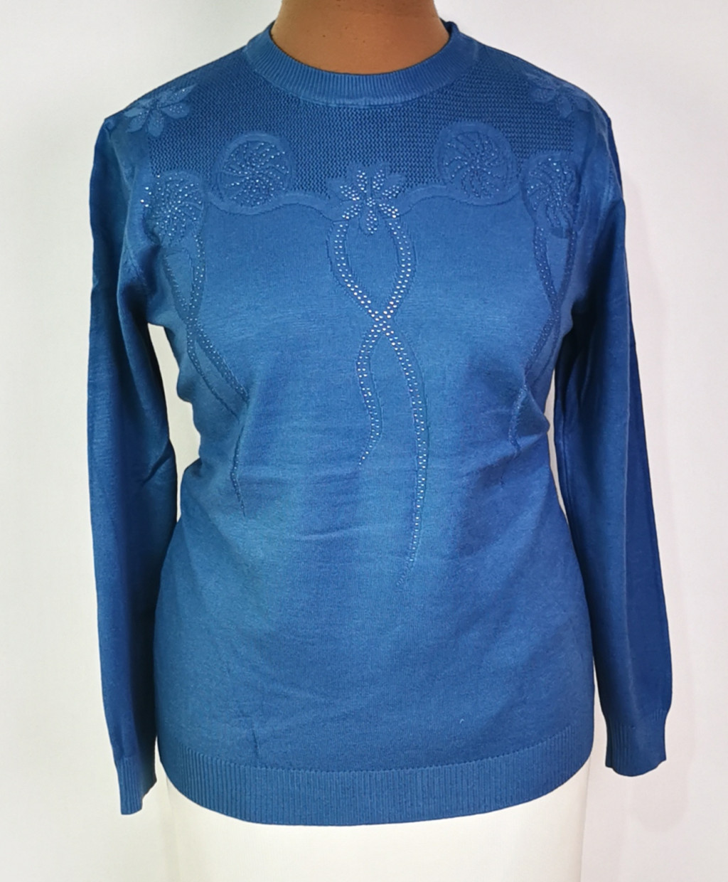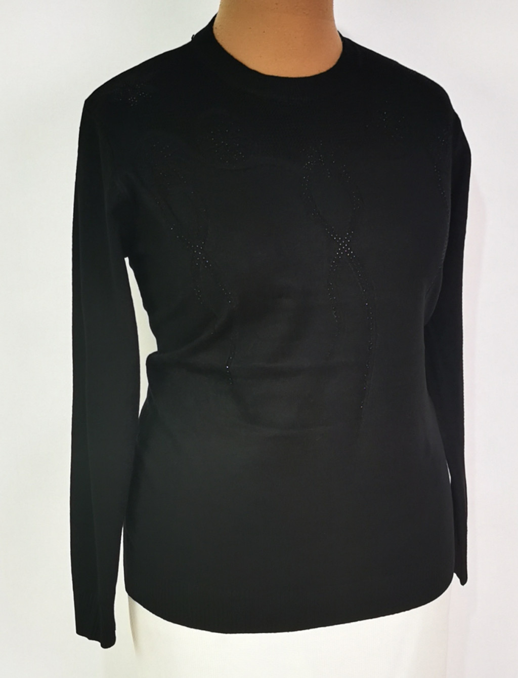 Kerek nyakú, hosszú ujjú, gépi kötött, enyhén csillogó mintás, pamutos anyagú felső.