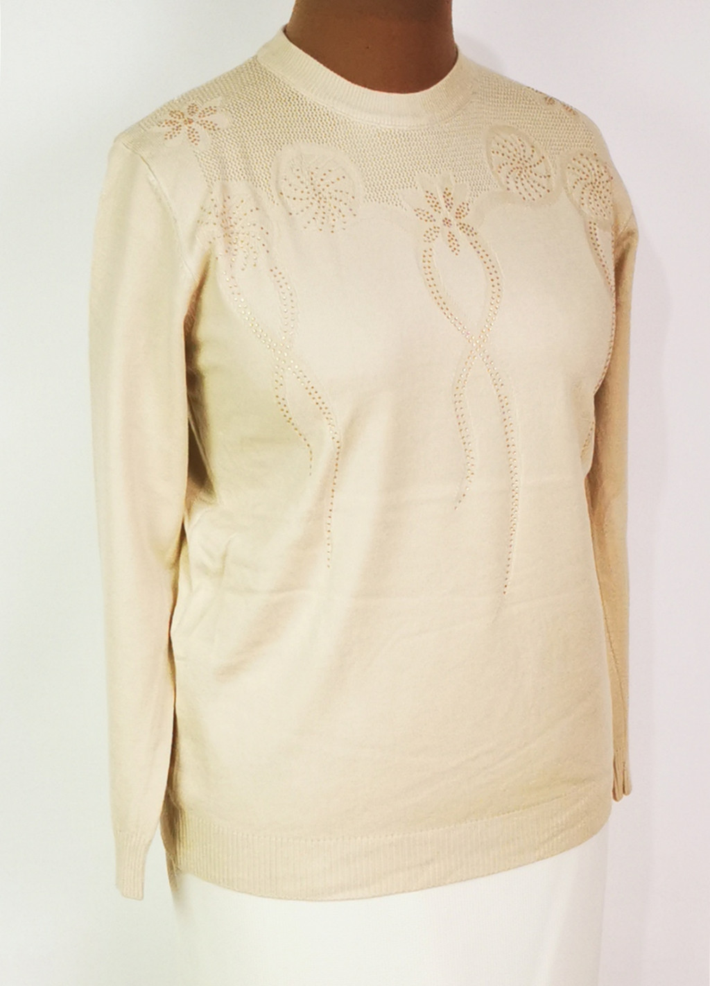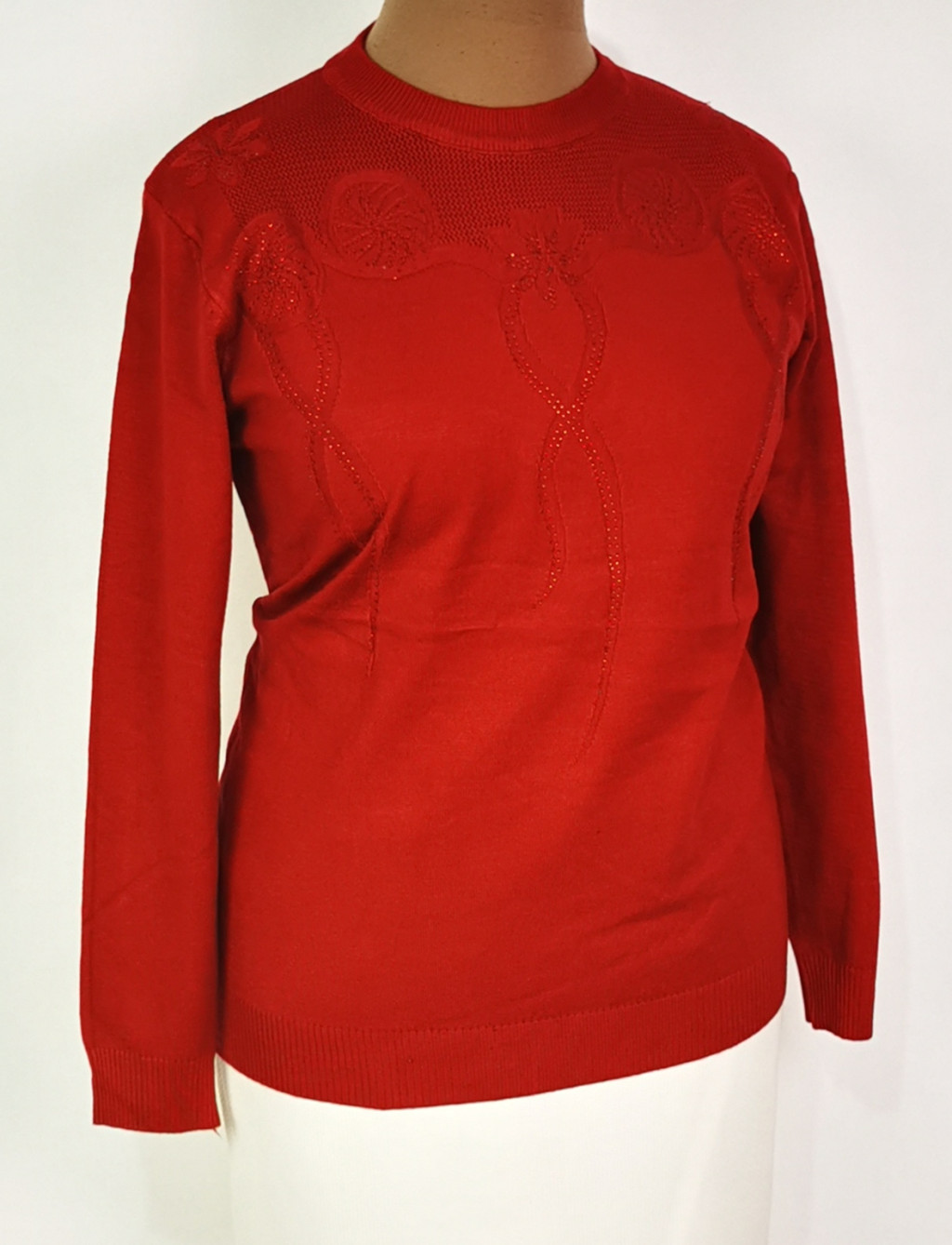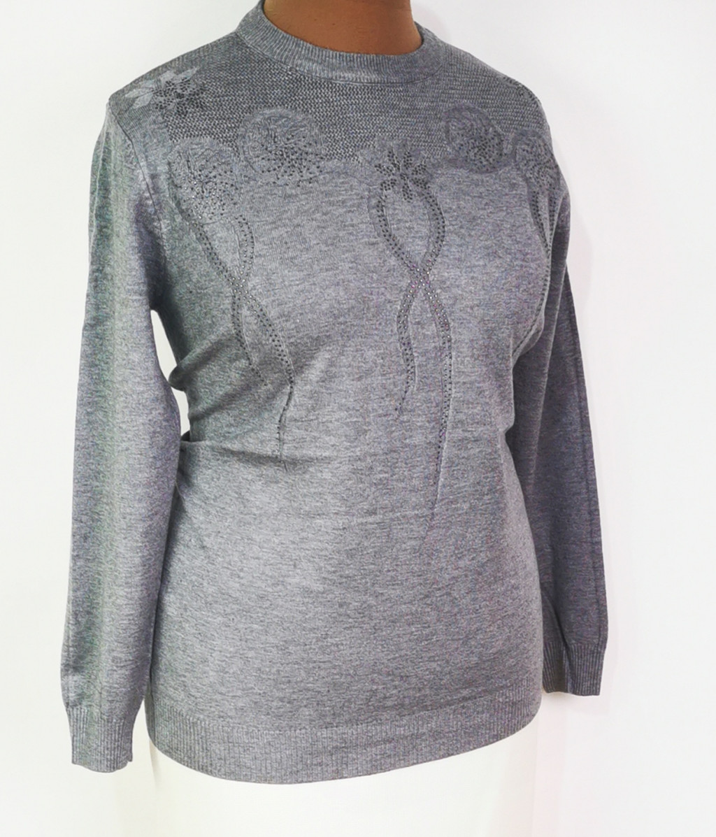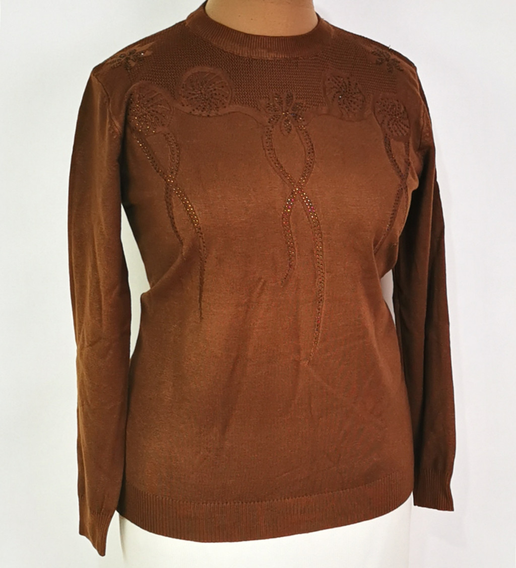 Kerek nyakú, hosszú ujjú, gépi kötött, enyhén csillogó mintás, pamutos anyagú felső.