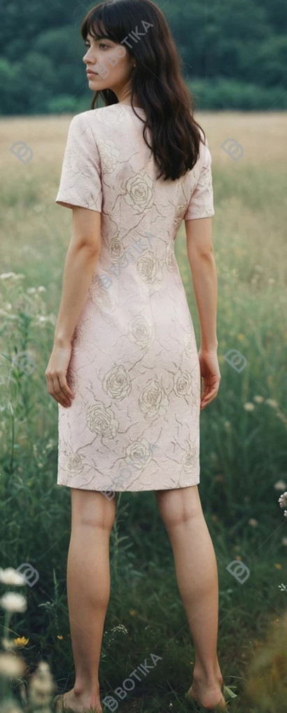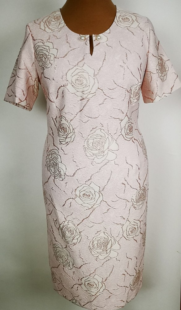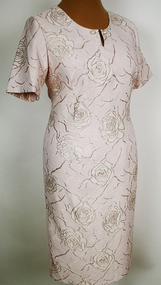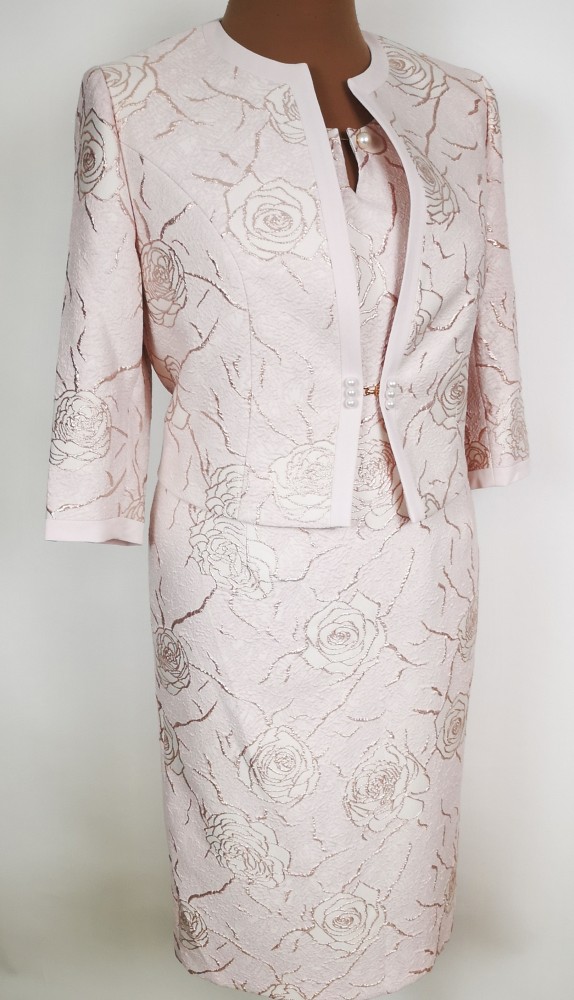 Gyönyörű, halvány rózsaszín színű, két részes alkalmi kosztüm, ruha része kerek nyakú, rövid ujjú, hátul derékig cipzáras, felsliccelt, nyaknál cseppformájú kivágással és gyöngyökkel, ruha részén enyhén csillogó rajzolt virág mintával díszített. Blézere 3/4-es ujjú, selyembéléses, a ruhával megegyező mintával, gyöngyös kapcssal díszített. 1-2 cm-t enged.