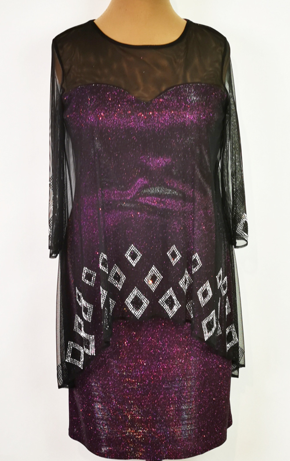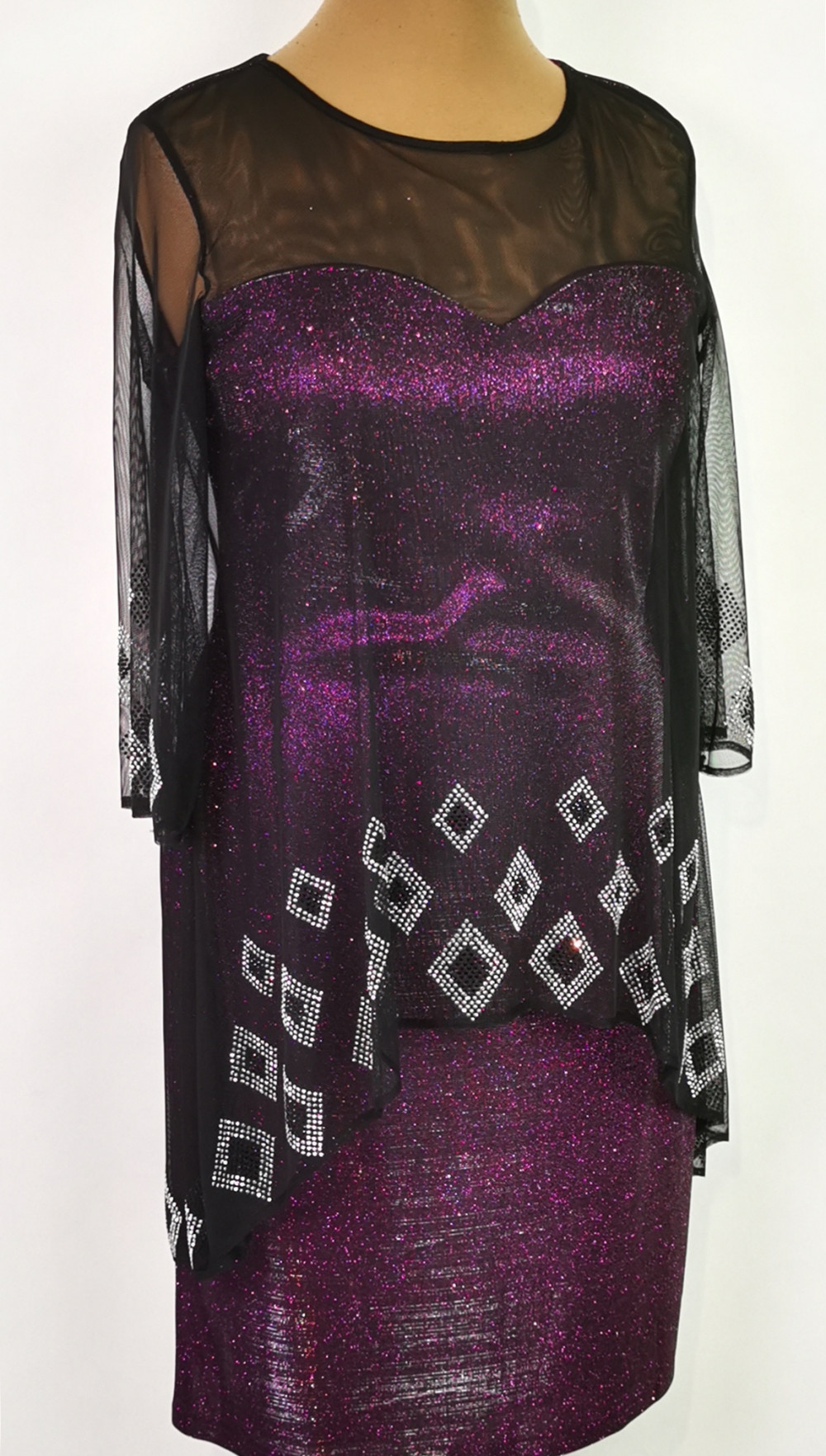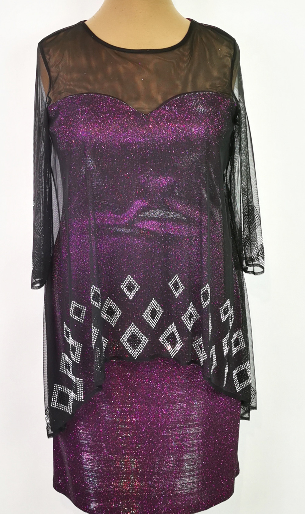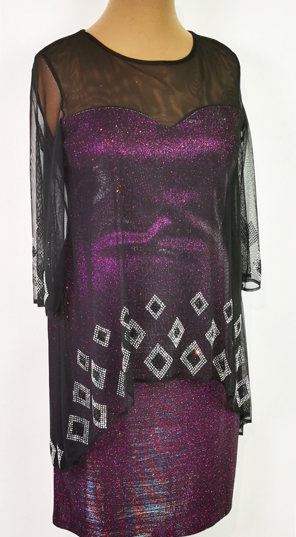 Nagyon szép, kerek nyakú, 3/4-es ujjú, selyembéléses, oldalt cipzáras, enyhén csillogó mintás, lila színű, fekete muszlin rátétes, díszített alkalmi ruha. 1-2 cm-t enged.