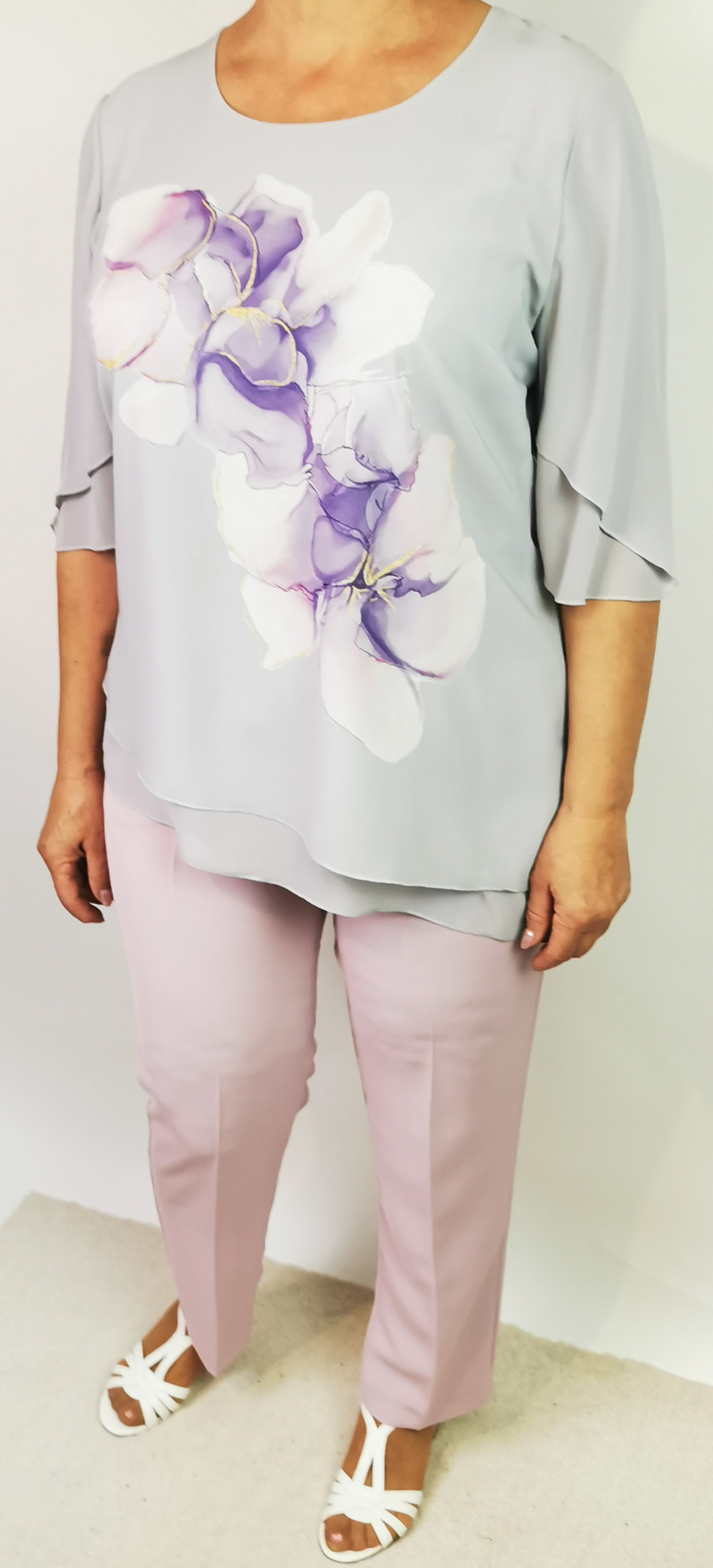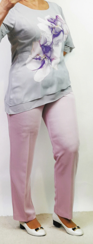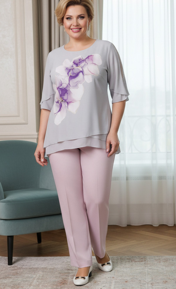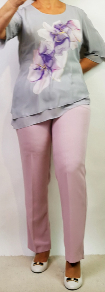 Nagyon szép, két részes kosztüm, nadrágja rózsaszín színű, gombos, cipzáras, kétoldalt gumibetétes, zsebes. Felső része kerek nyakú, rövid ujjú, aszimetrikus aljú, dupla, muszlin anyagú, ezüstszürke alapszínen, színes virág mintával díszített.