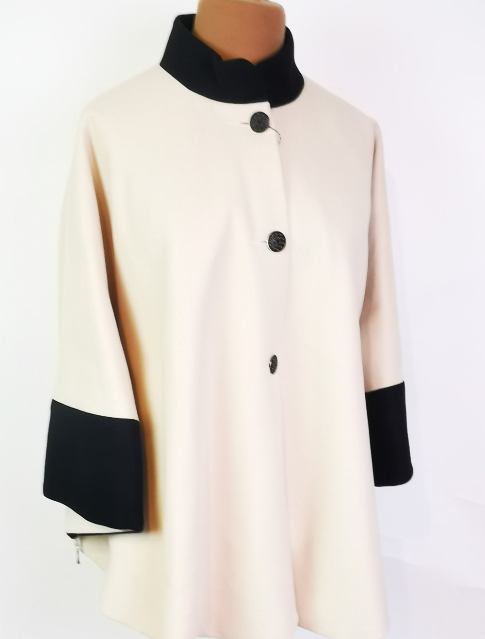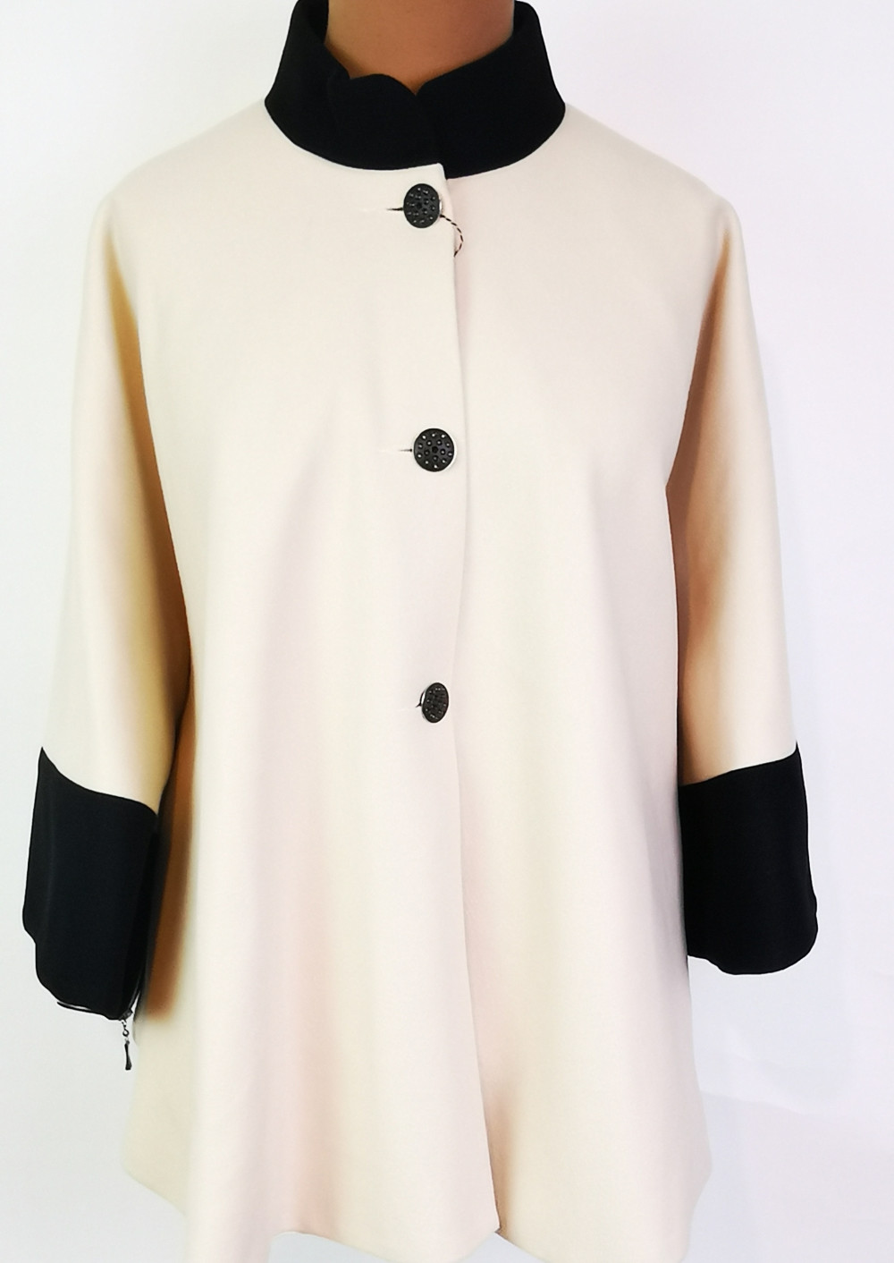 Álló nyakú, végi gombos, selyembéléses, bézs alapszínű, lefelé bővülő, cipzárral variálható, átmeneti, alkalmi szövet kabát.
