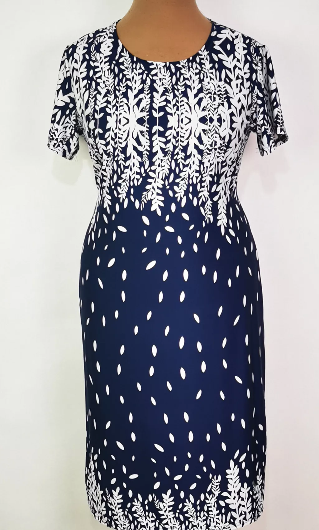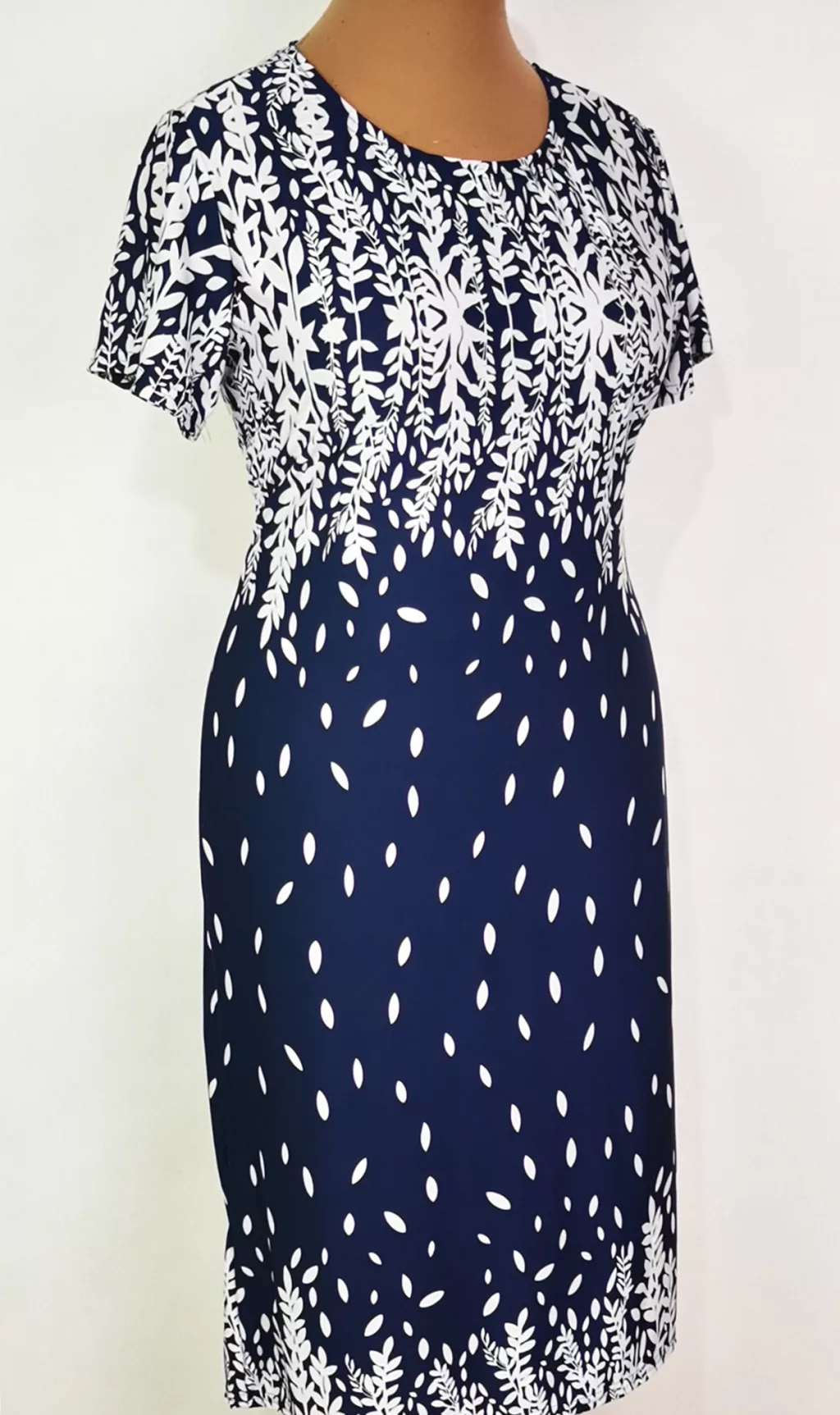 Kerek nyakú, rövid ujjú, sötétkék alapszínen, fehér színű mintás, selymes anyagú ruha 4-5 cm-t enged.