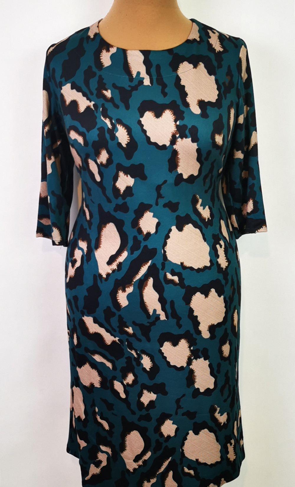 Sötétzöld alapon, barna-fekete színű mintával díszített, kerek nyakú, 3/4-es ujjú, hátul cipzáras ruha. 1-2 cm-t enged.
