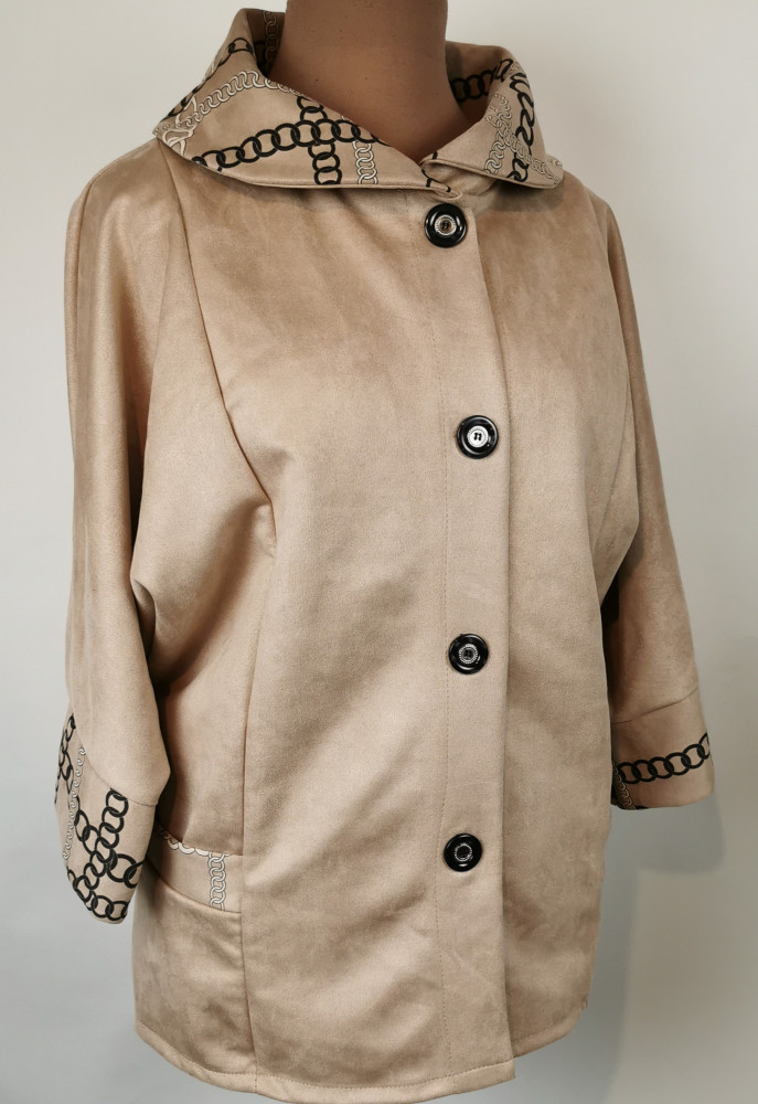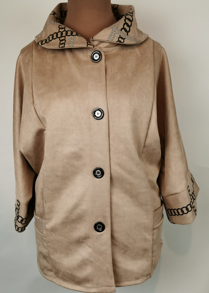 3/4-es, denevér ujjú, mogyoróbarna színű, zsebes, gombos, nyaknál és az ujja díszített, szintetikus velúr anyagú, őszi-tavaszi kabát