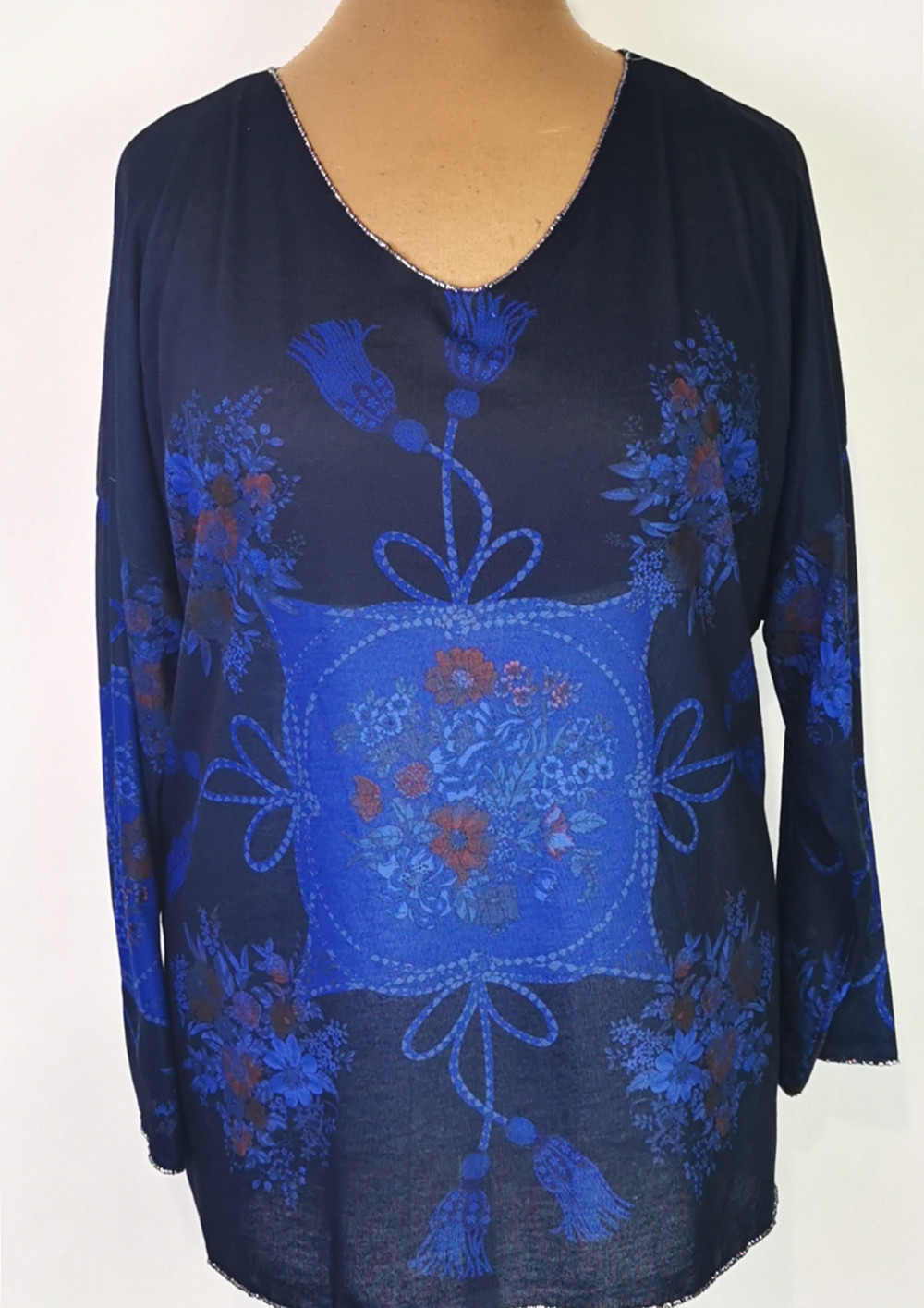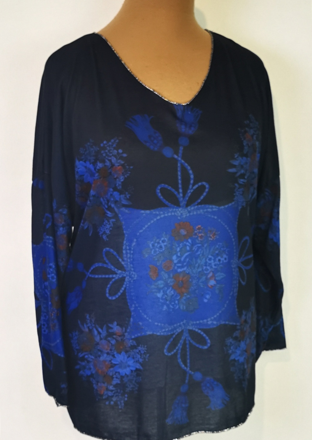 "V" nyakú, ejtett vállú, sötétkék alapon, világoskék mintás, pamutos anyagú felső. 5-6 cm-t enged.