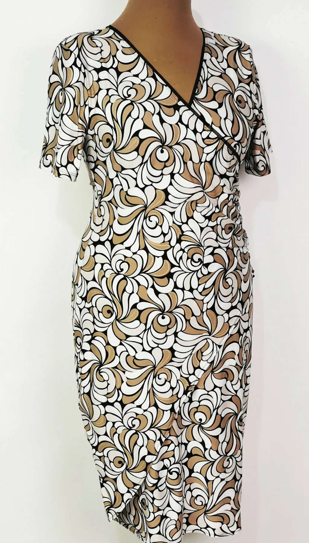 "V" nyakú, rövid ujjú, elől átlapolt, bézs-fekete-fehér színű, selymes anyagú ruha. 2-3 cm-t enged.