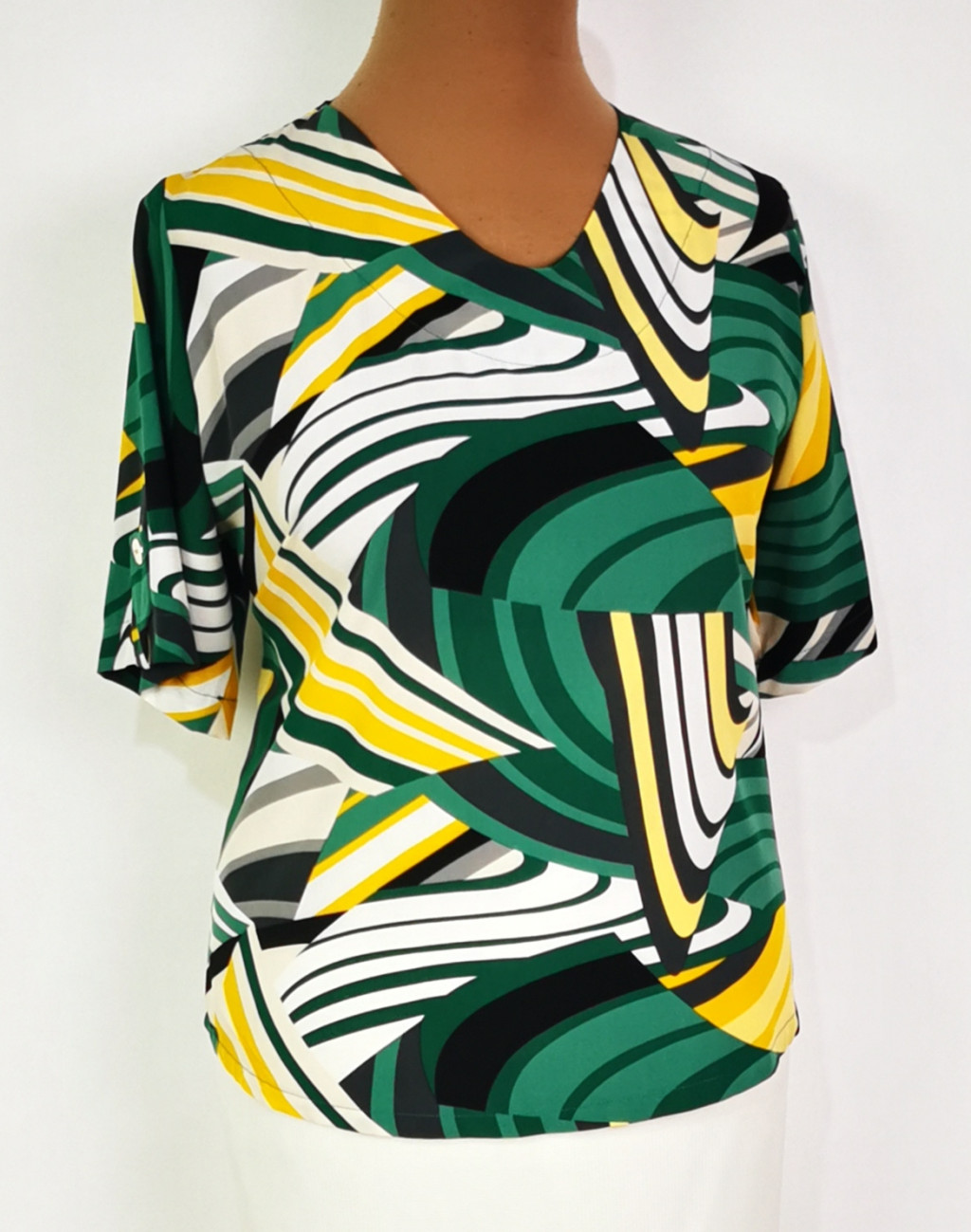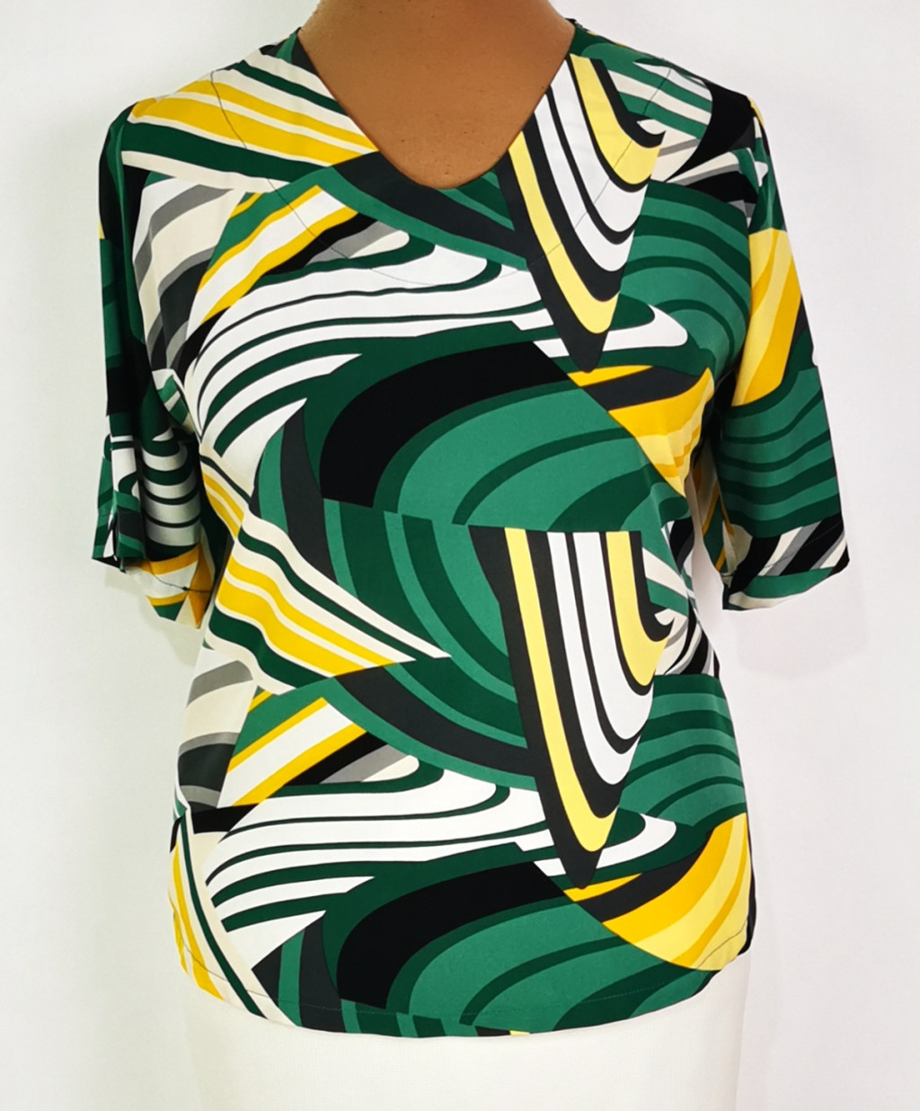 "V" nyakú, rövid ujjú, fehér-sárga-zöld színű mintás, selymes anyagú felső. 2-3 cm-t enged.