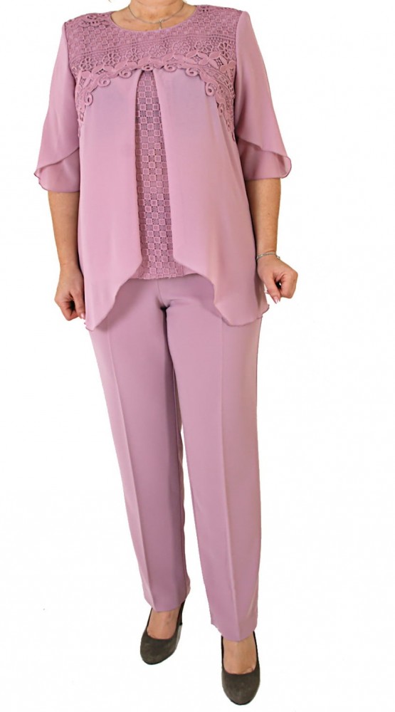Gyönyörű, mályva színű, kétrészes alkalmi kosztüm, nadrágja kétoldalt gumis, gombos, cipzáras záródású, zsebes. Felső része kerek nyakú, 3/4-es muszlin ujjú, aszimetrikus aljú, dupla muszlin anyagú, muszlin rátétes,
