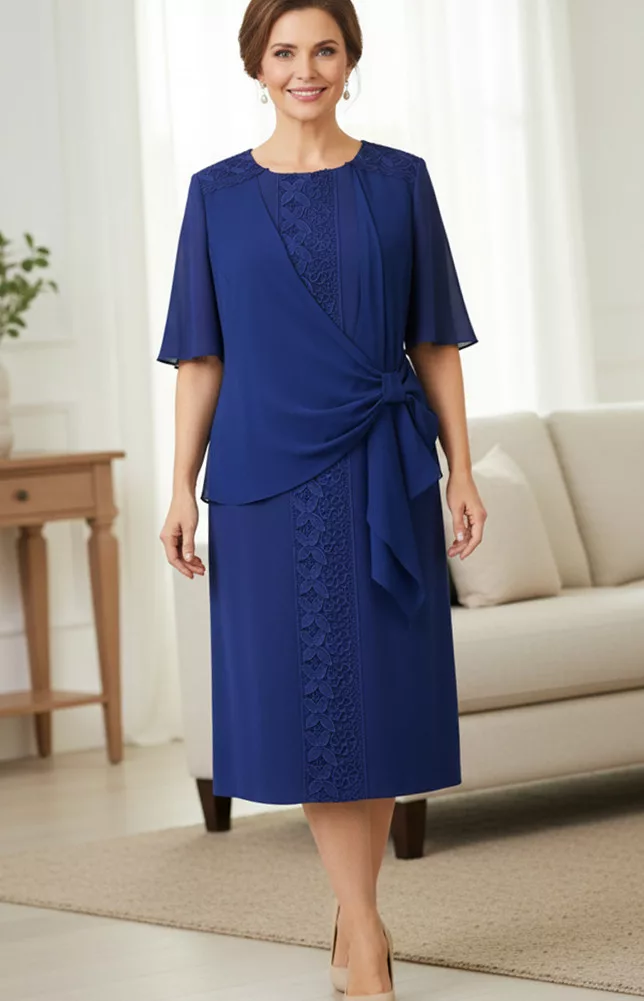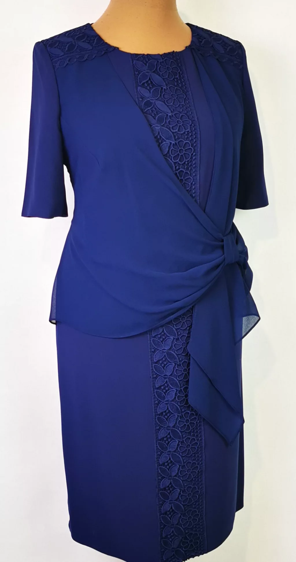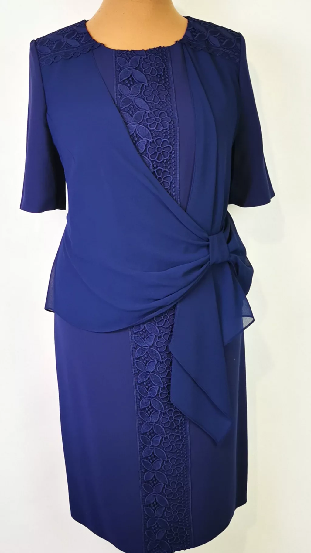 Kerek nyakú, rövid, muszlin ujjú, hátul cipzáras, felsliccelt, elől csipke és muszlin rátétes, gyönyörű sötétkék színű, alkalmi ruha. 1-2 cm-t enged.