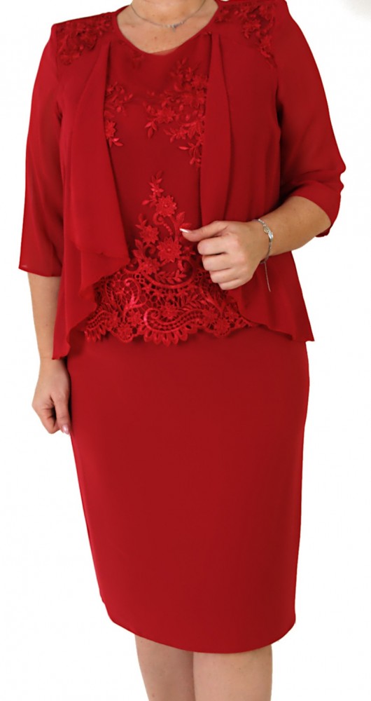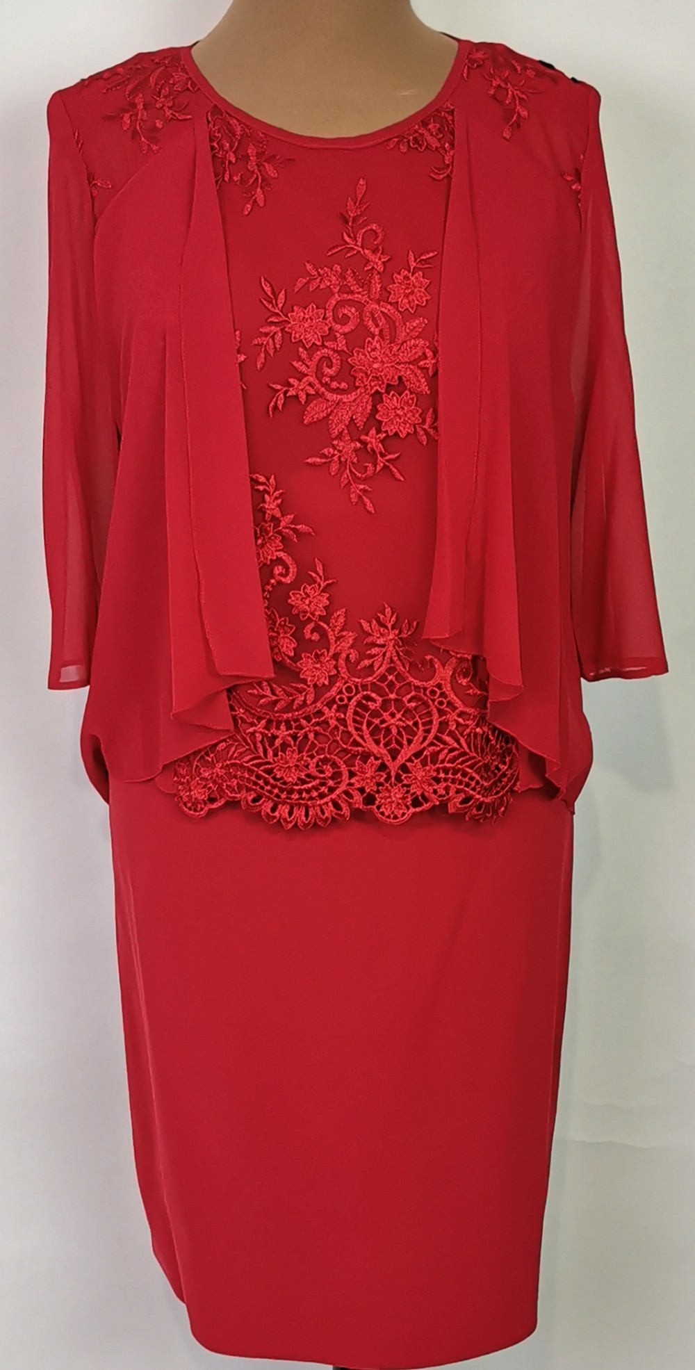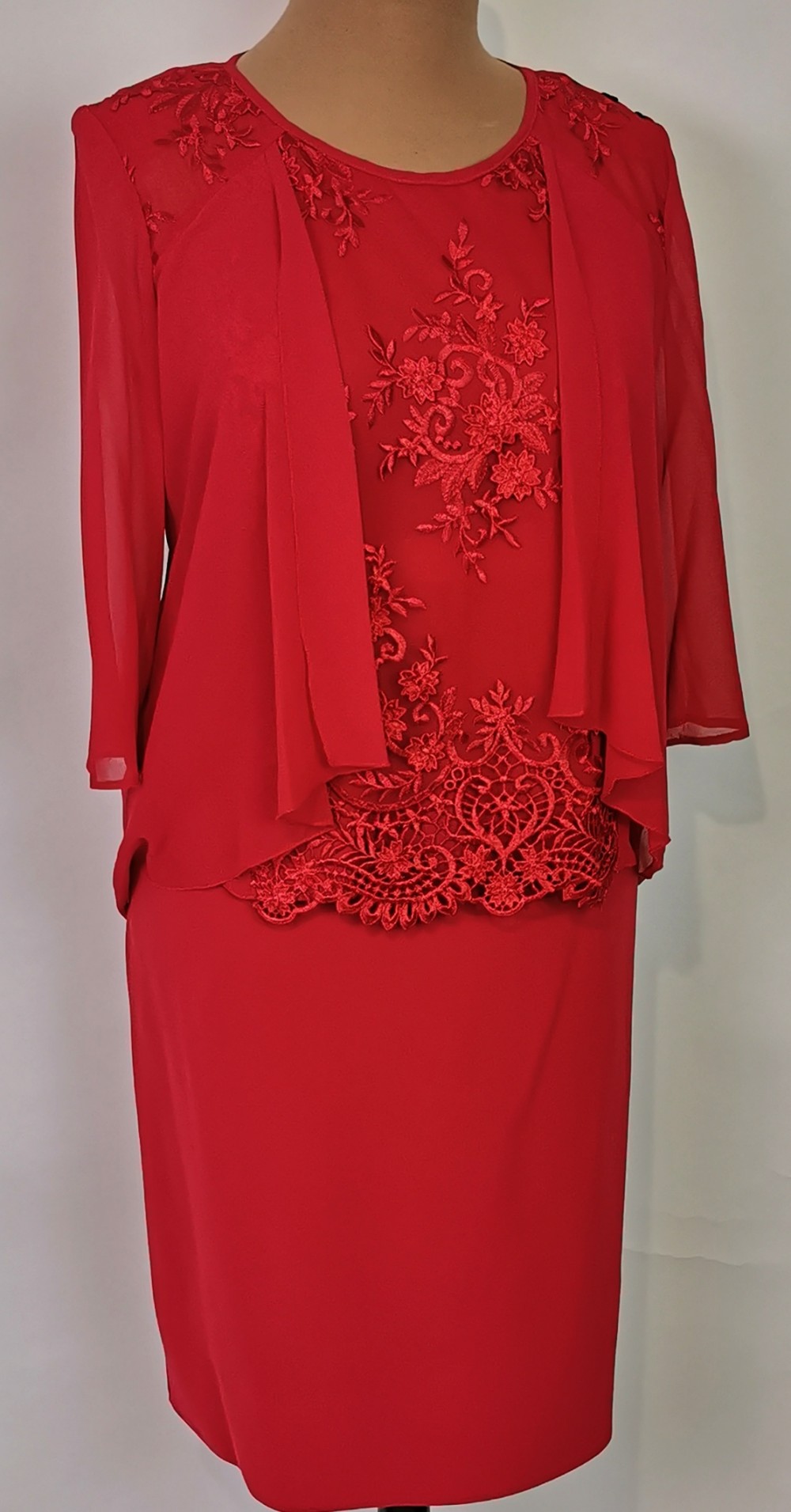 Gyönyörű, kétrészes alkalmi kosztüm. Szoknya része cipzáras, selyembéléses, felsliccelt, kétoldalt gumibetétes. Felső része kerek nyakú, 3/4-es muszlin ujjú, aszimetrikus aljú, dupla muszlin anyagú, muszlin rátétes, elől hímzett csipke díszítetéssel. 1-2 cm-t enged.