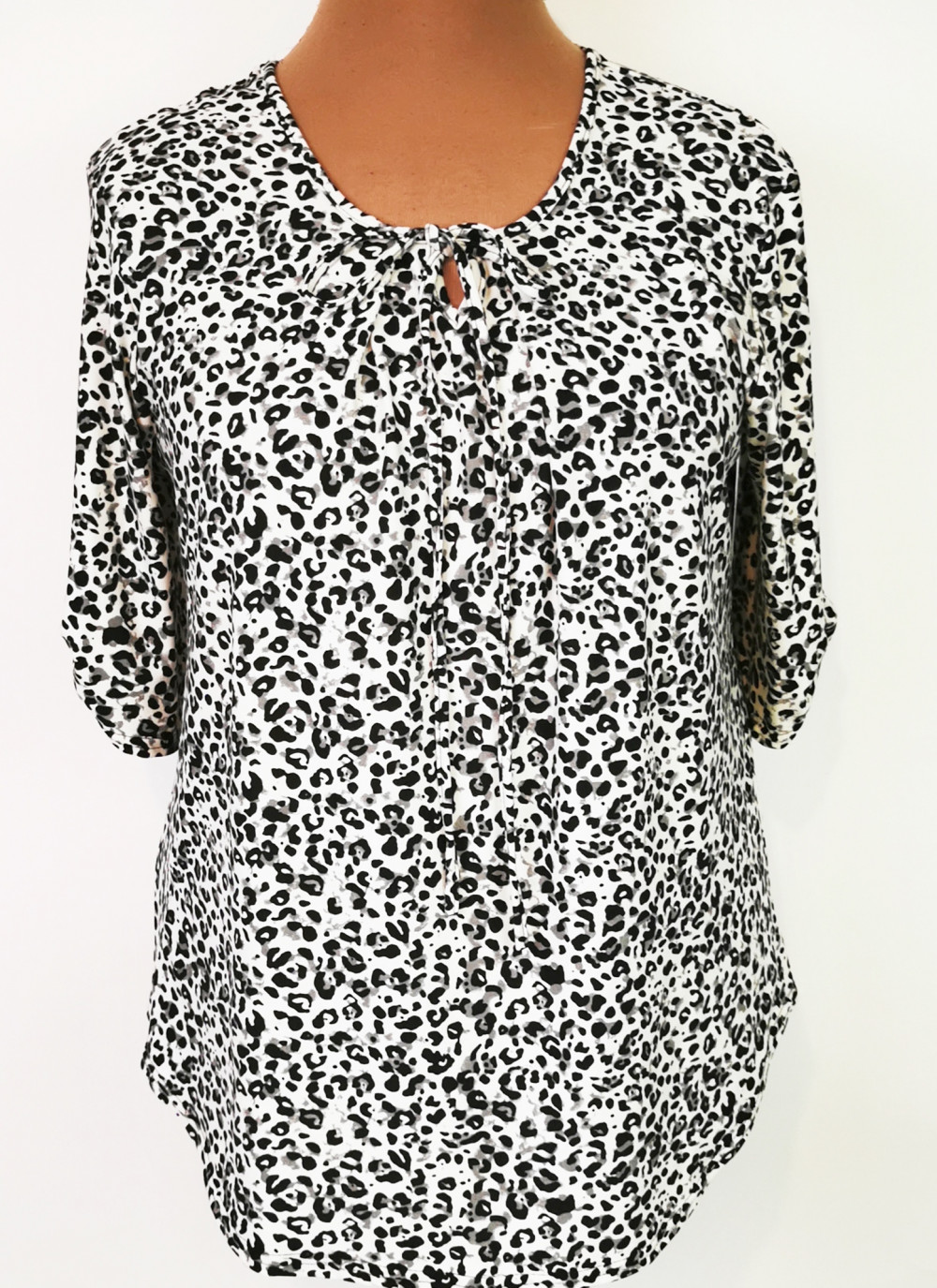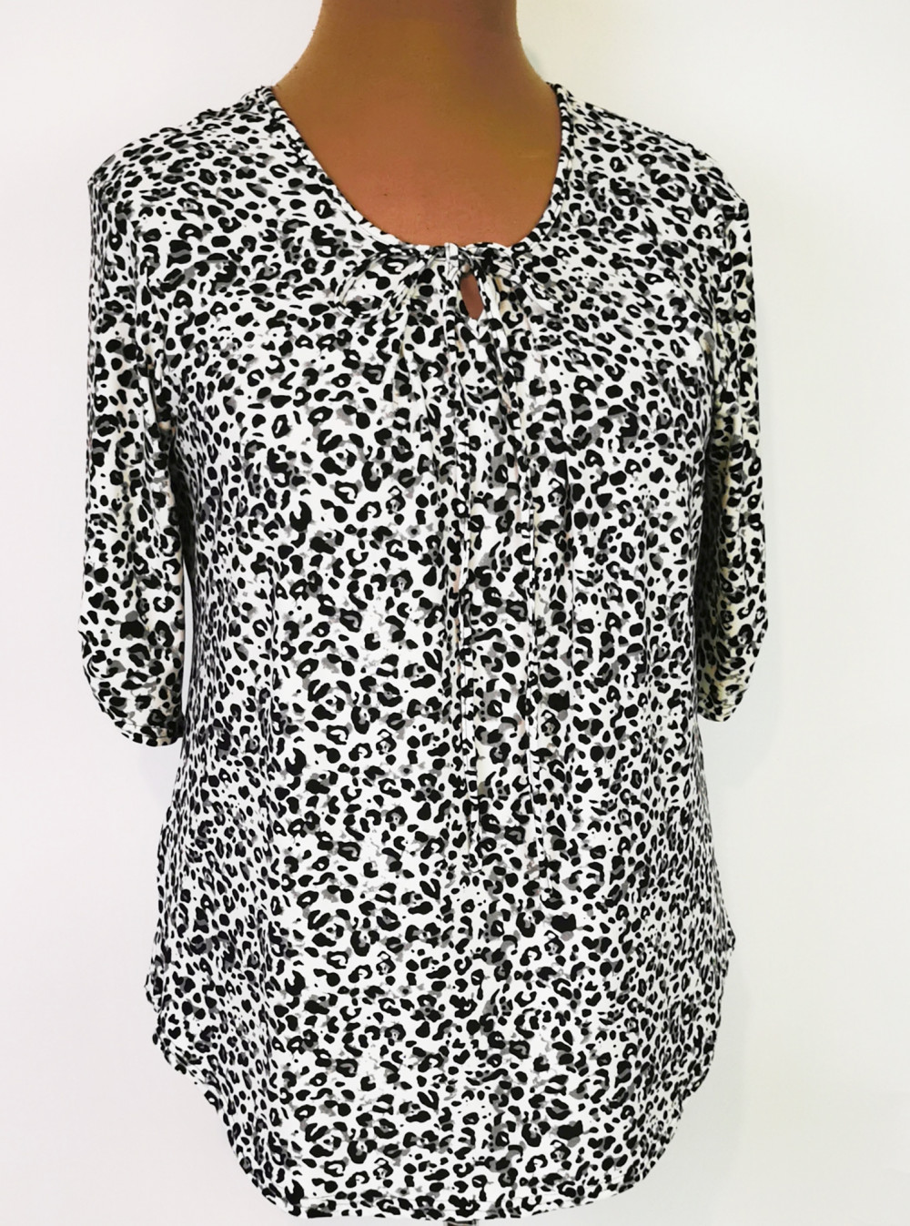 Kerek nyakú, 3/4-es ujjú, fekete-fehér színű, leopárd mintás, nyaknál díszített felső. 5-6 cm-t enged.