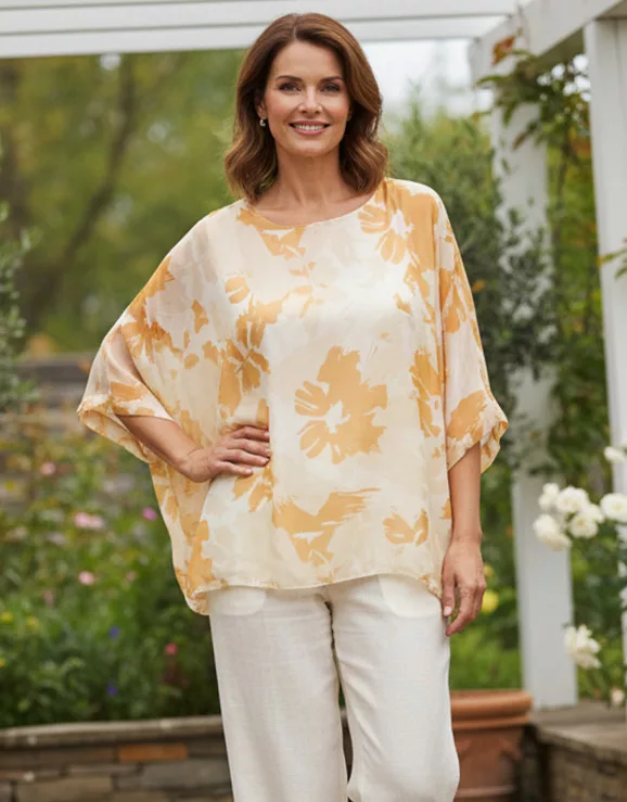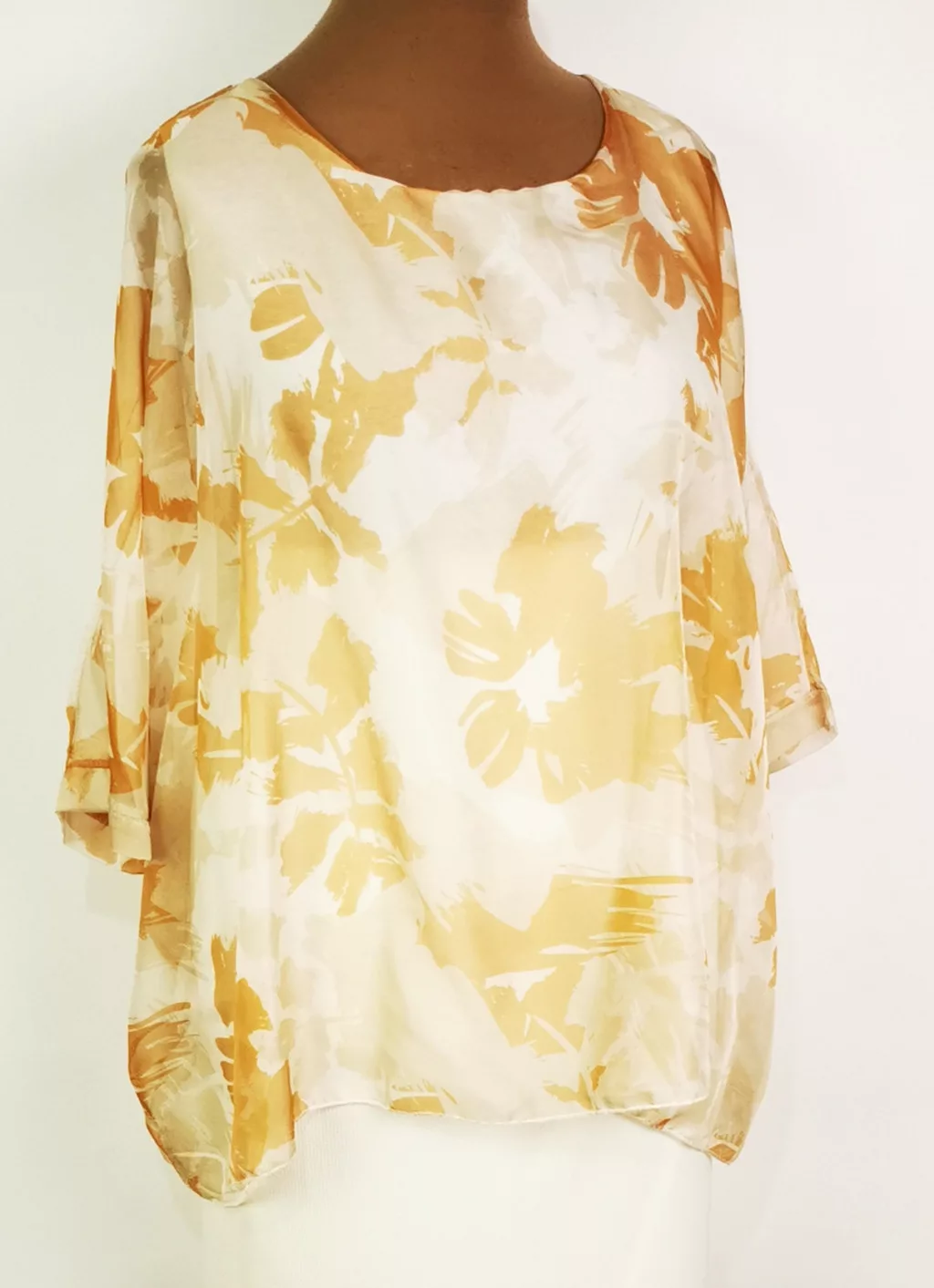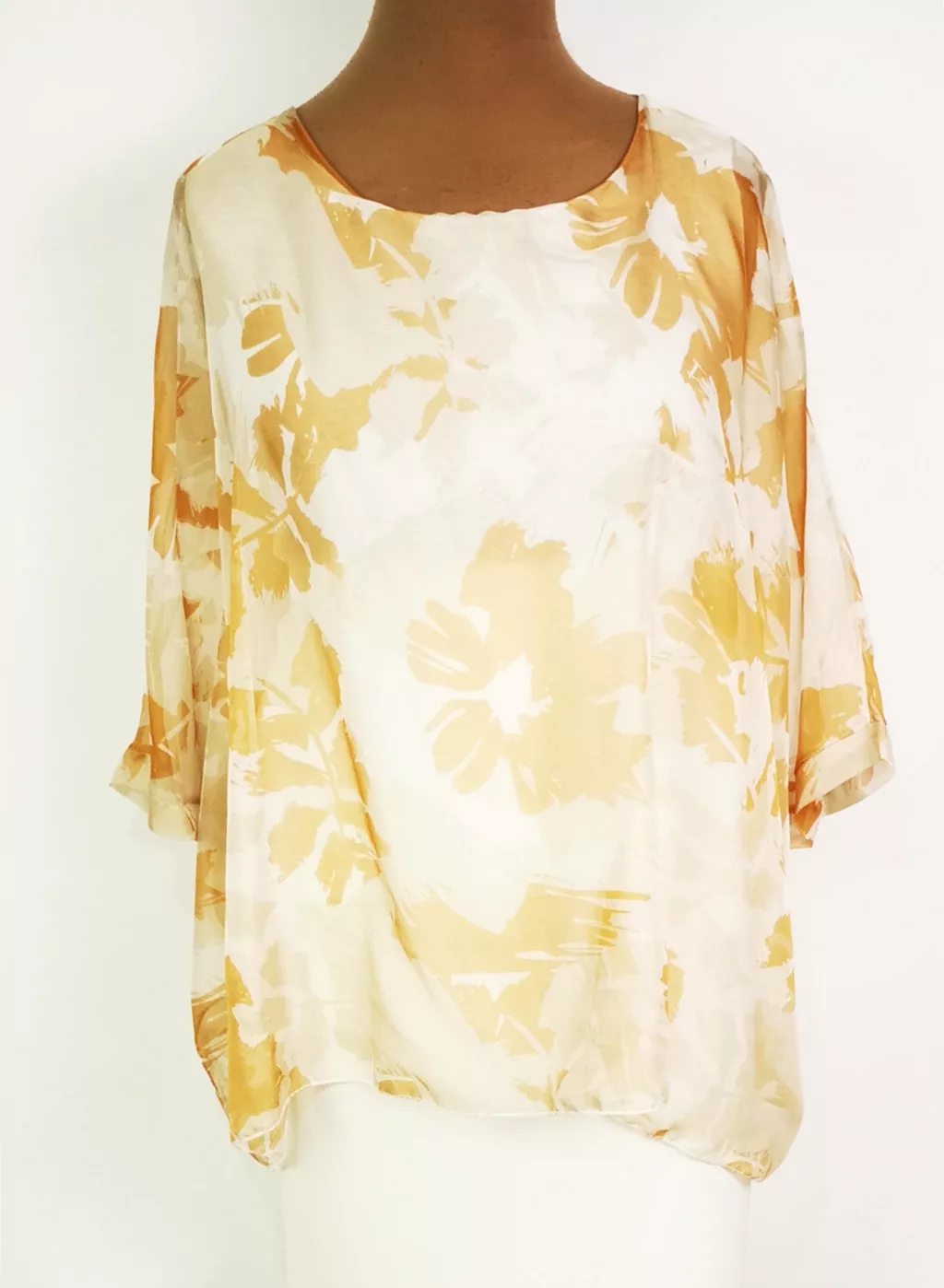 Kerek nyakú, 3/4-es ujjú, dupla muszlin anyagú alkalmi felső. 4-5 cm-t enged.