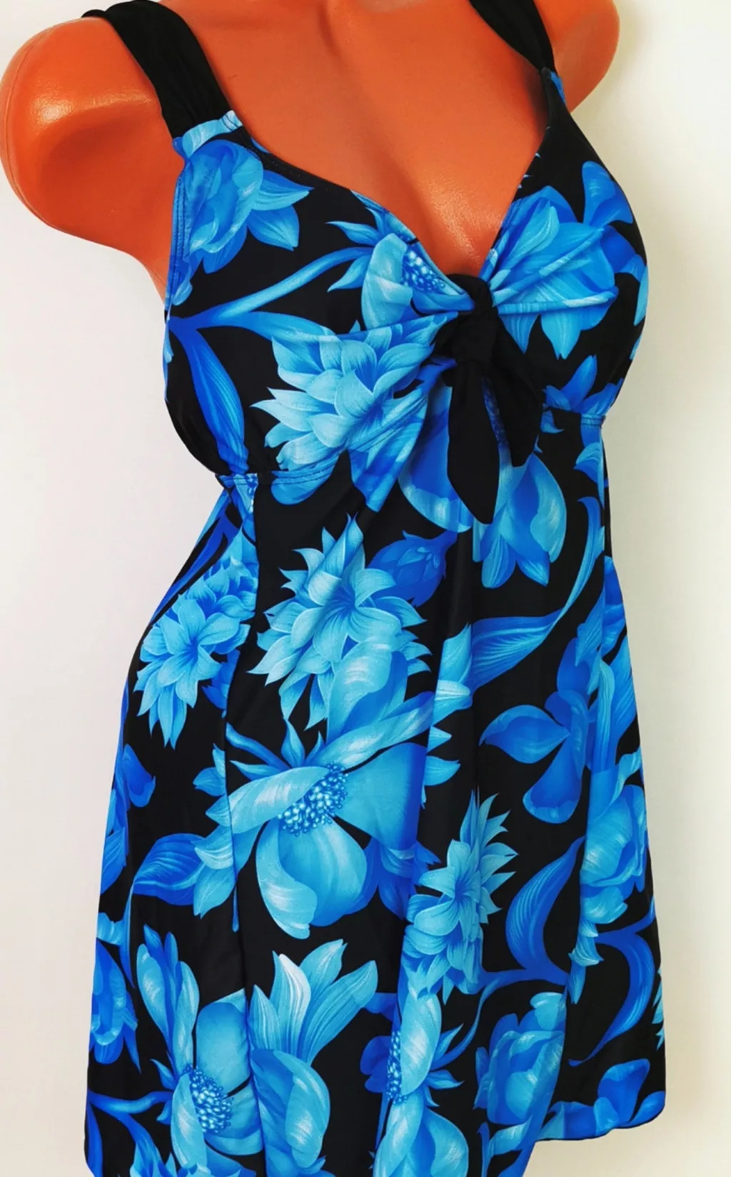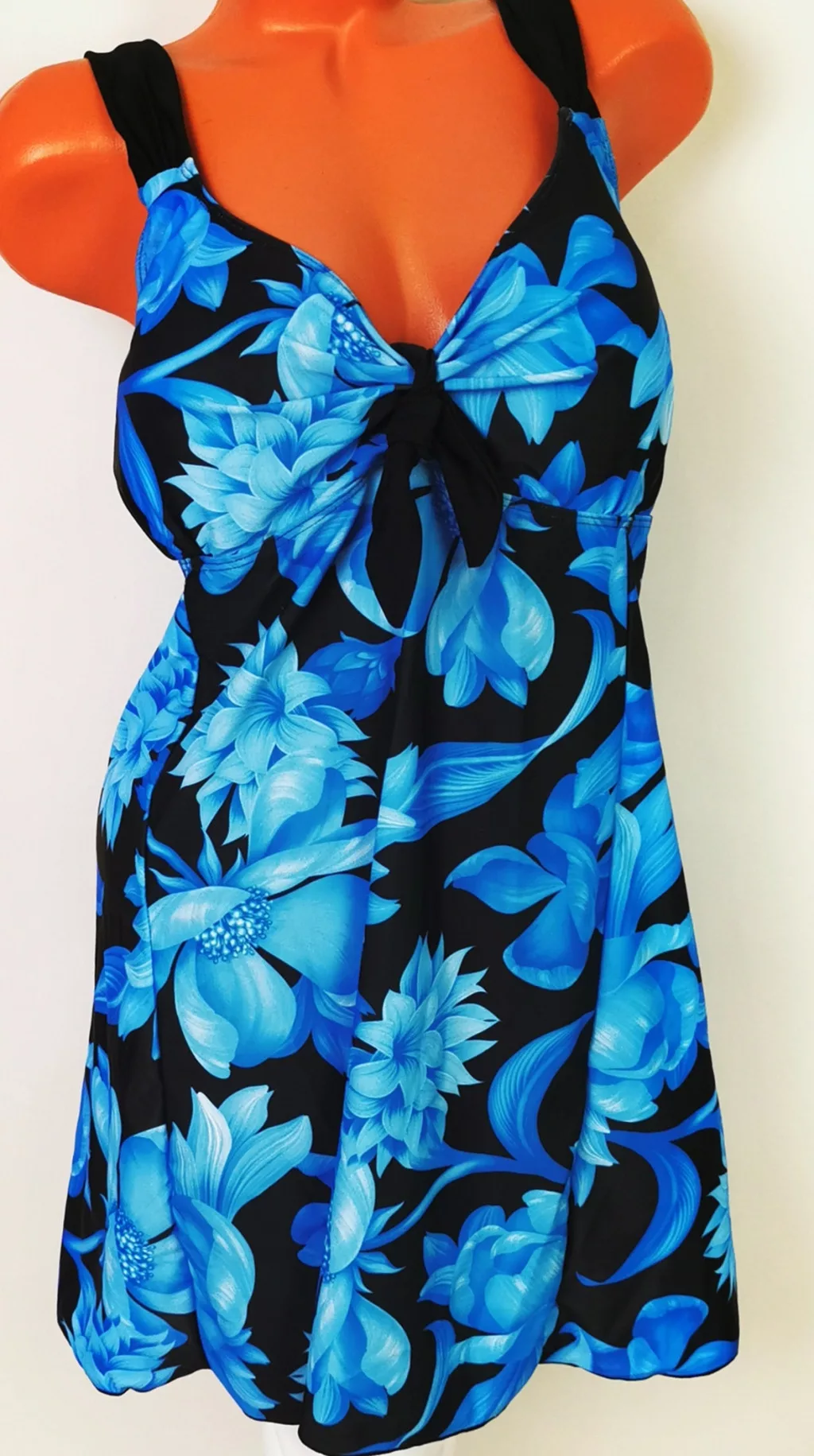 Fekete alapszínű, nagy piros virág mintával díszített, állítható vállpántos, hosszú felső részű, vékony szivacsbetétes tankini.