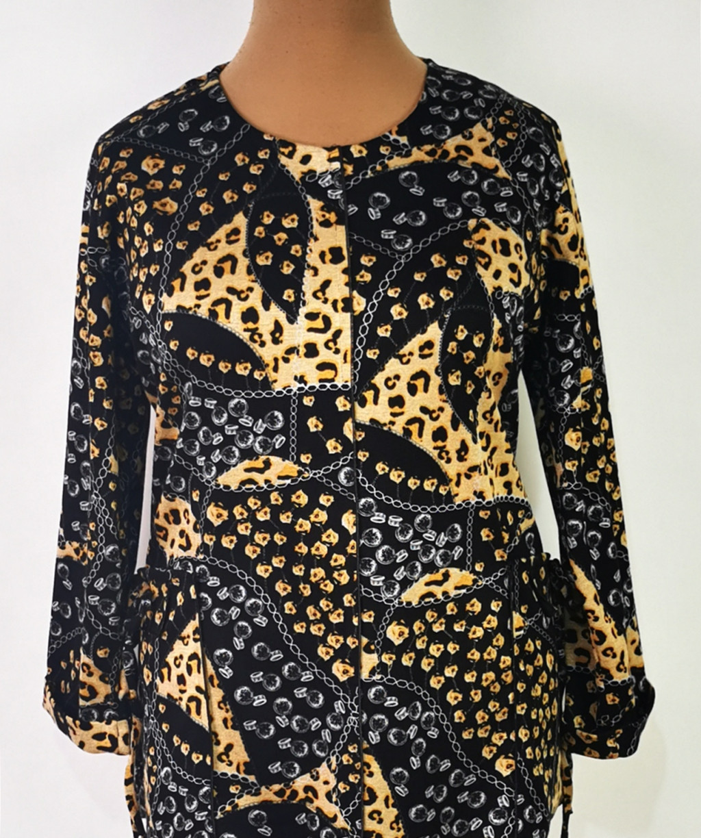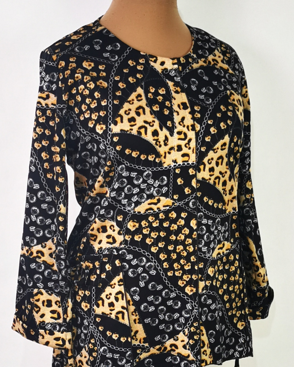 Kerek nyakú, hosszú ujjú, fekete alapszínen, barna-szürke, leopárd mintával díszített, selymes, rugalmas anyagú felső. 6-7 cm-t enged.