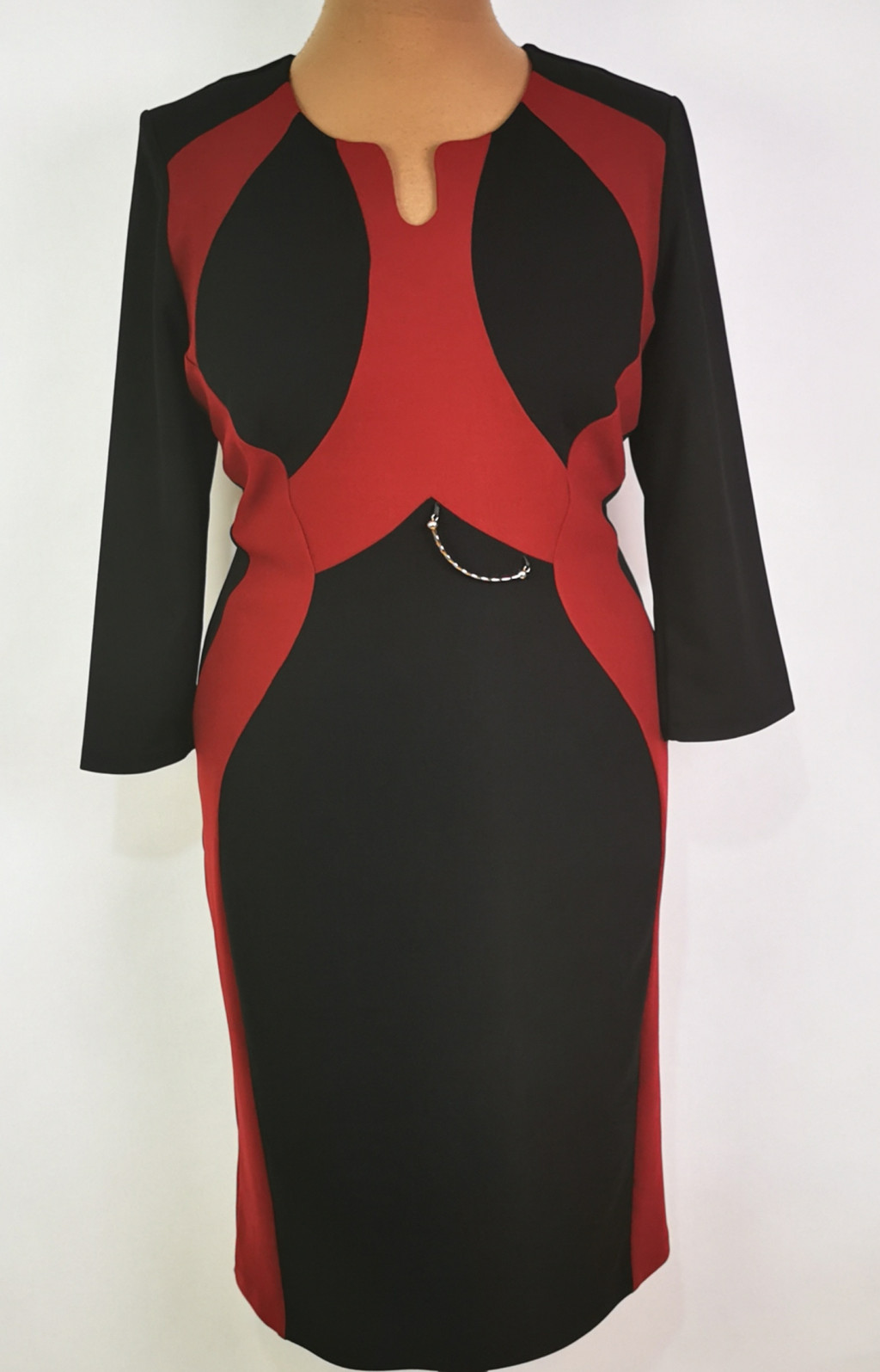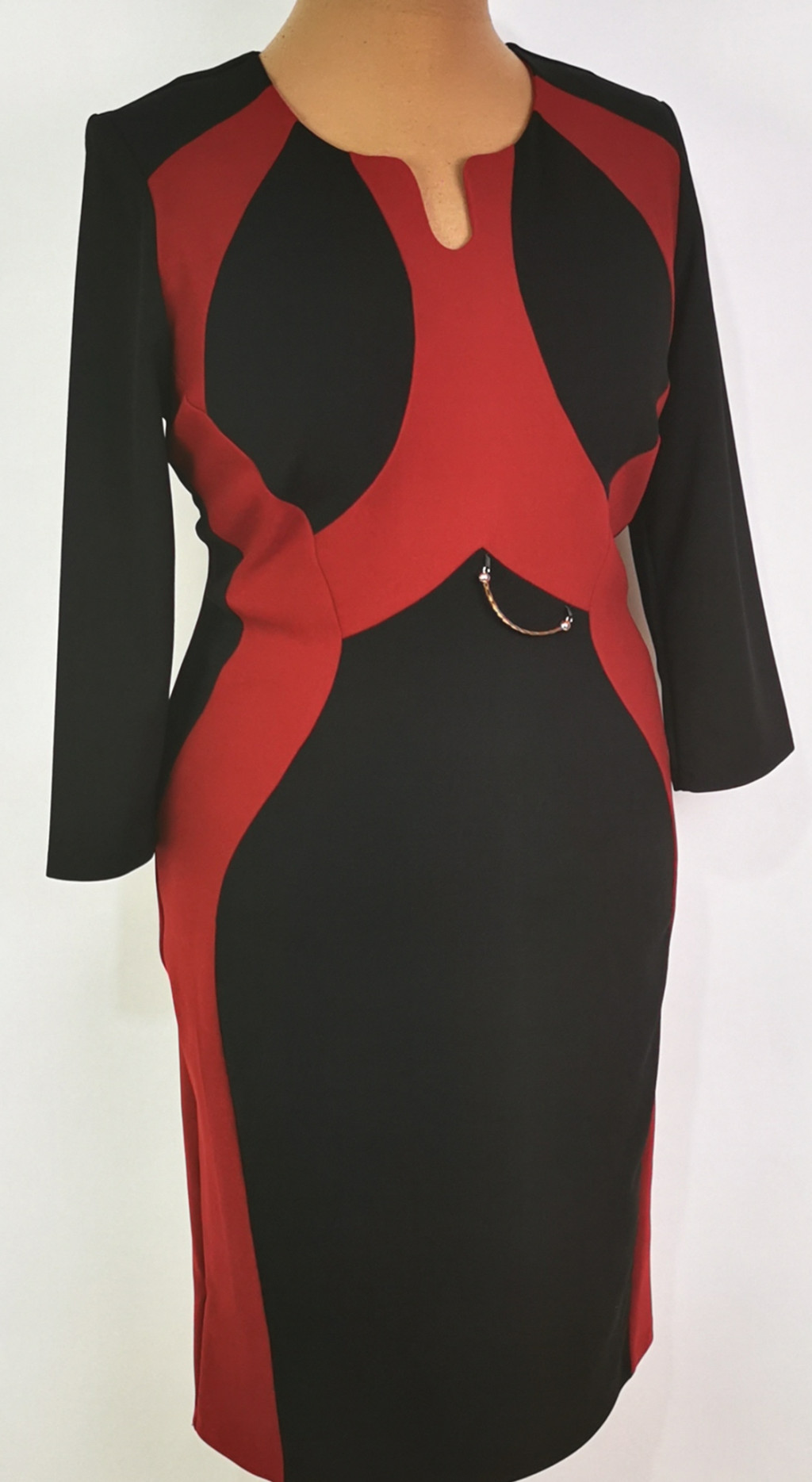 Kerek nyakú, 3/4 ujjú, hátul derékig cipzáras, felsliccelt, fekete alapszínű, bordó színű betéttel és csattal díszített alkalmi ruha. 4-5 cm-t enged.