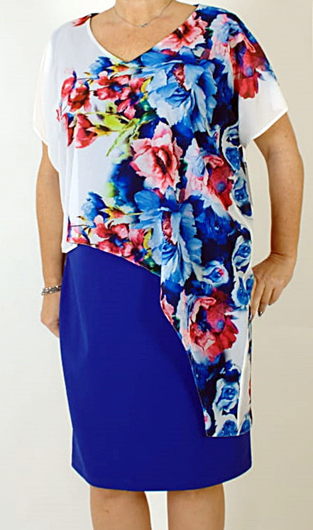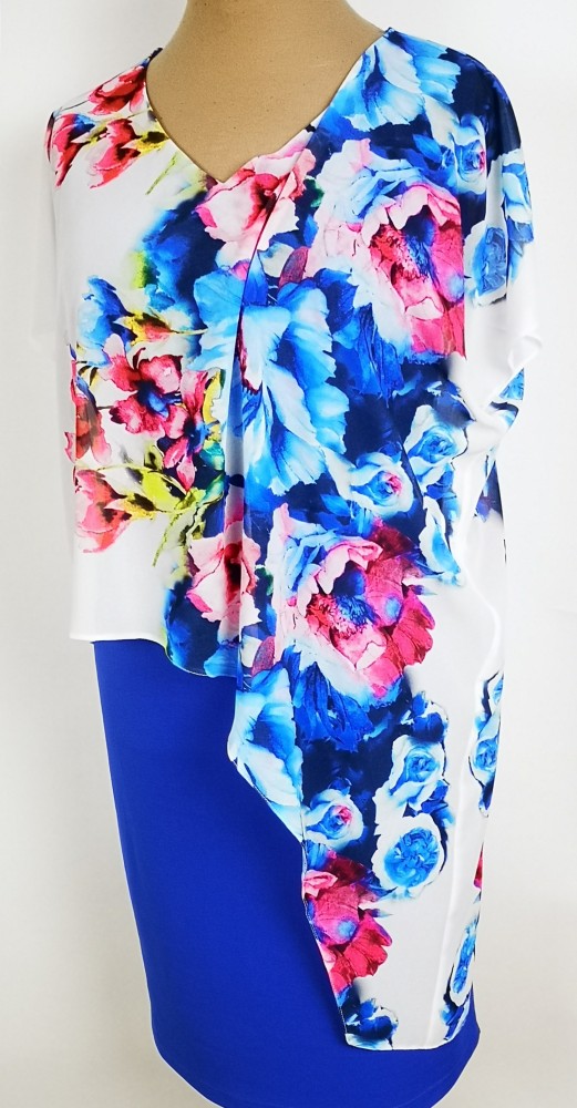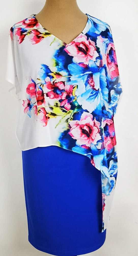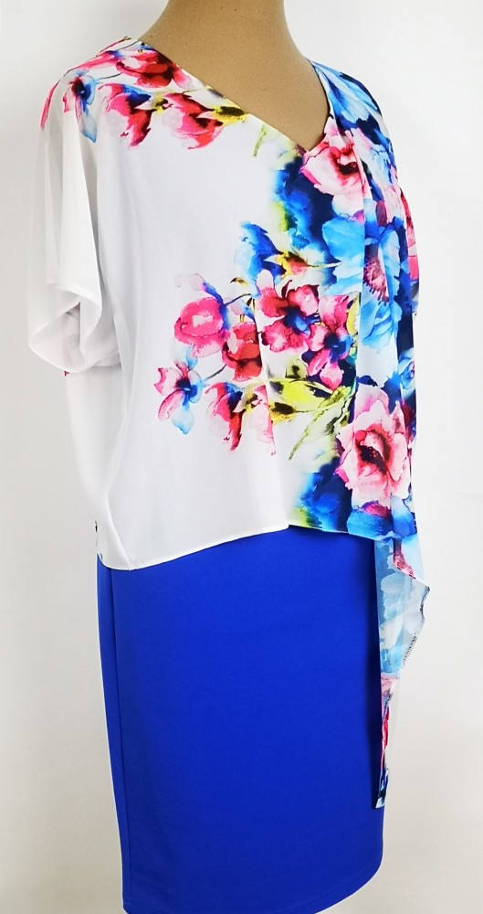Gyönyörű, királykék alapszínű, "V" nyakú, elől-hátul, nagy színes virág mintával díszített, muszlin rátétes alkalmi ruha. 4-5 cm-t enged.