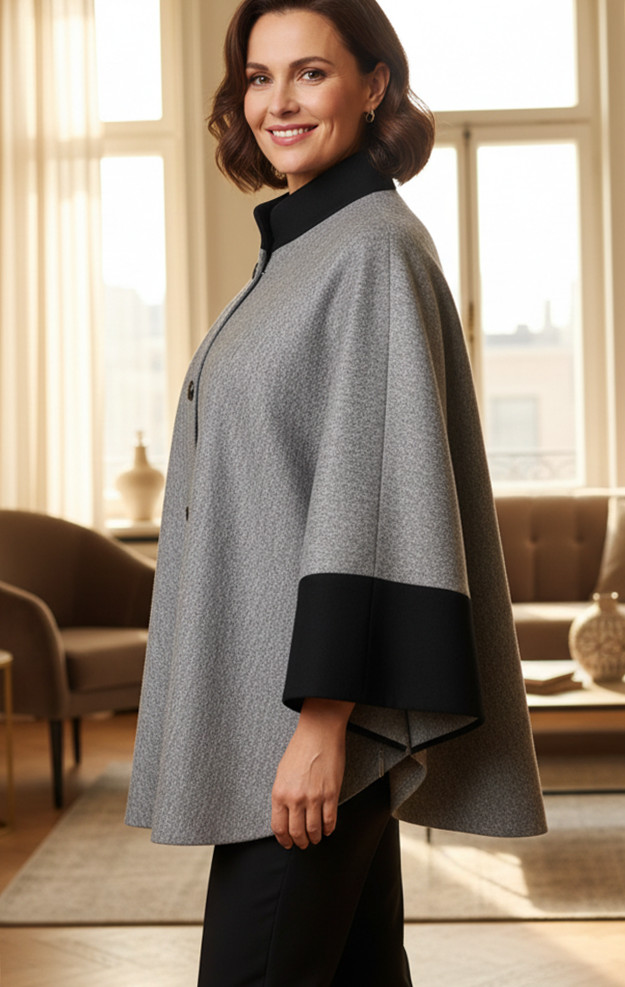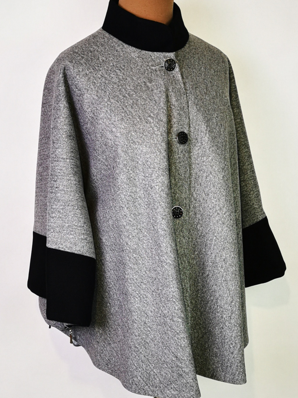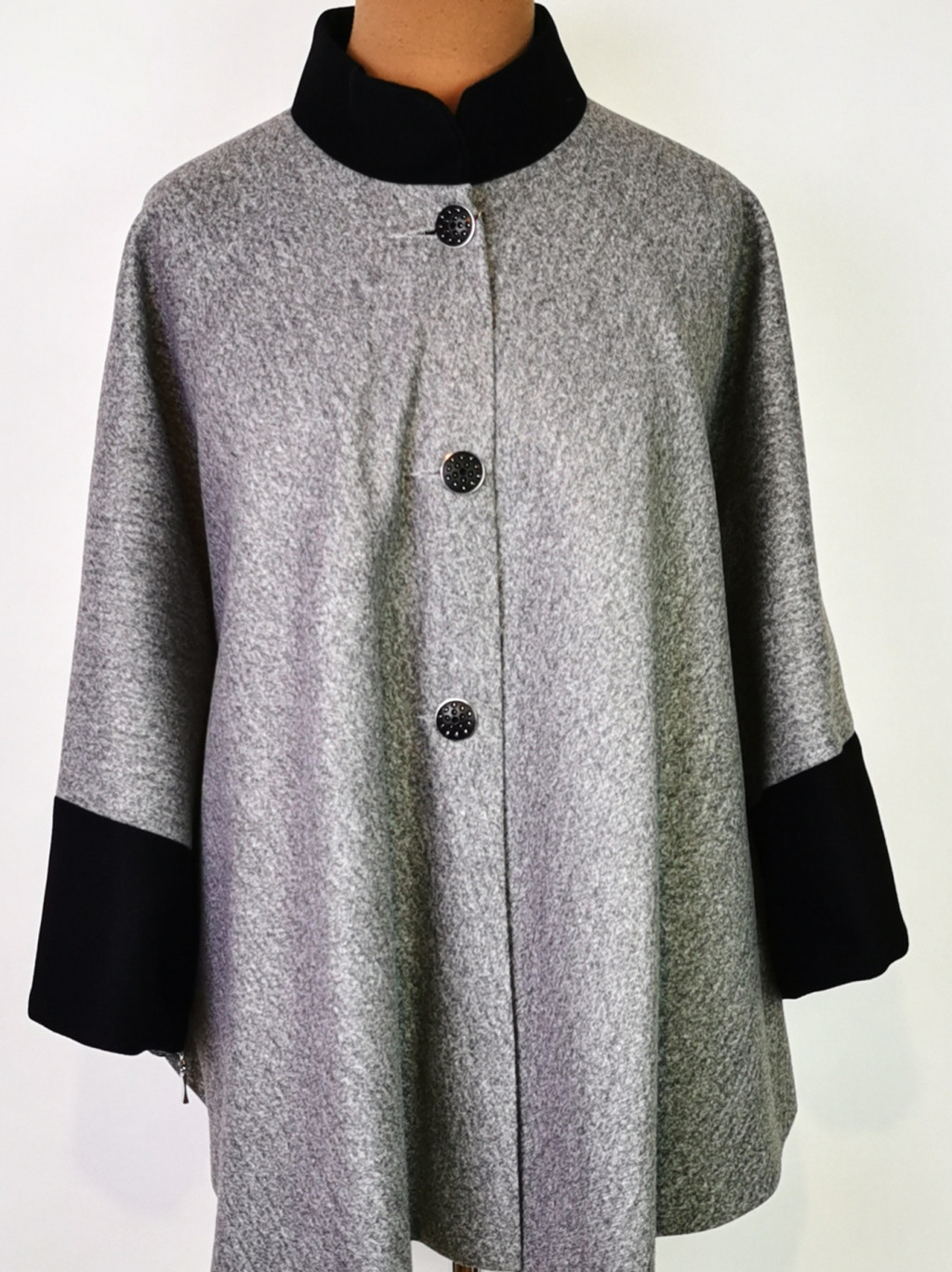 Álló nyakú, végi gombos, selyembéléses, bézs alapszínű, lefelé bővülő, cipzárral variálható, átmeneti, alkalmi szövet kabát.