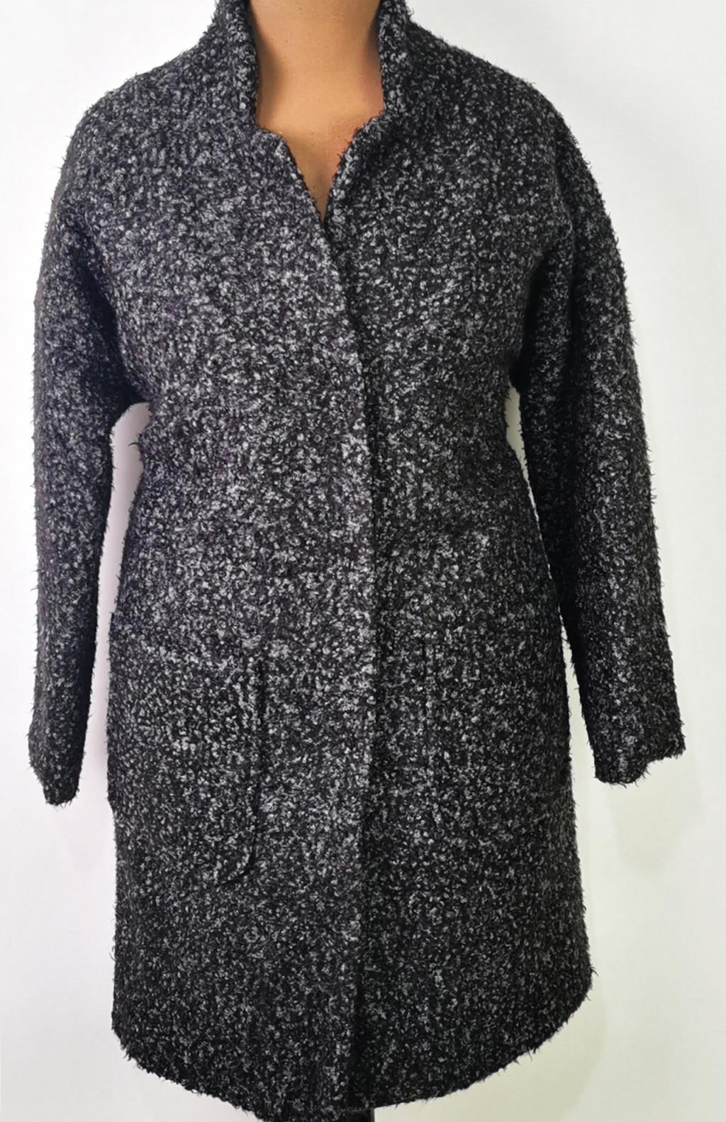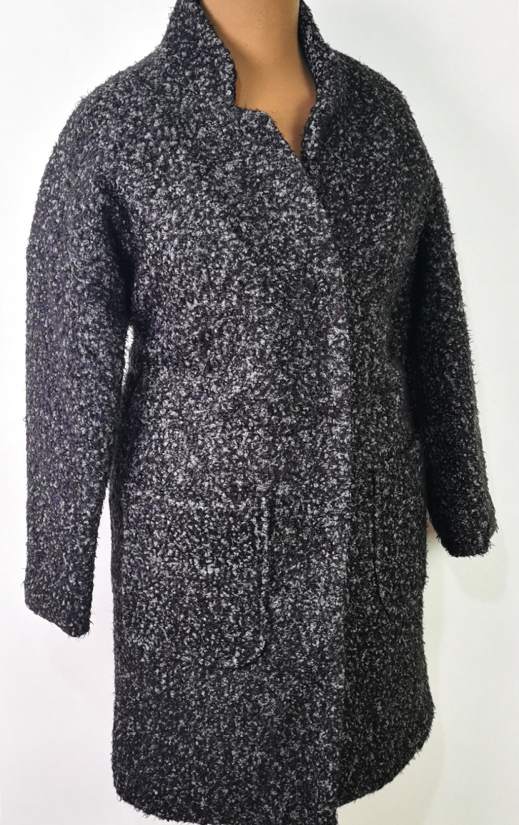 Álló nyakú, patentos záródású, szürke-fekete színű, cirmos mintás, zsebes, vatelin béléses, átmenet kabát.