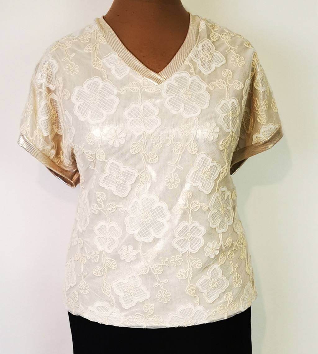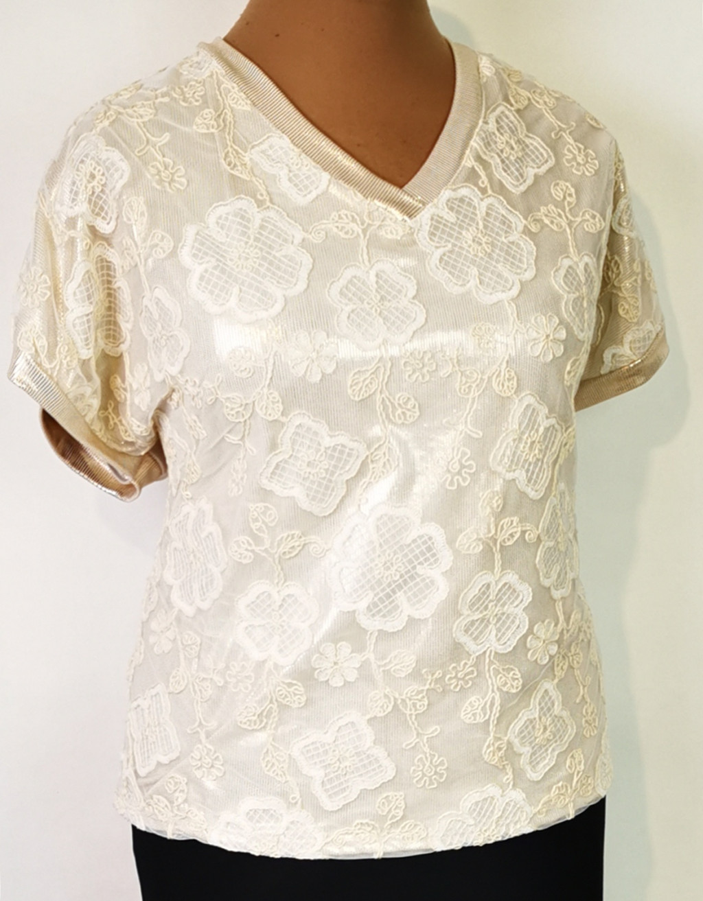 "V"nyakú, rövid ujjú, hátul egyszínű bézs, elől dupla anyagú, csipkerátéttel díszített, akalmi felső. 2-3 cm-t enged.
