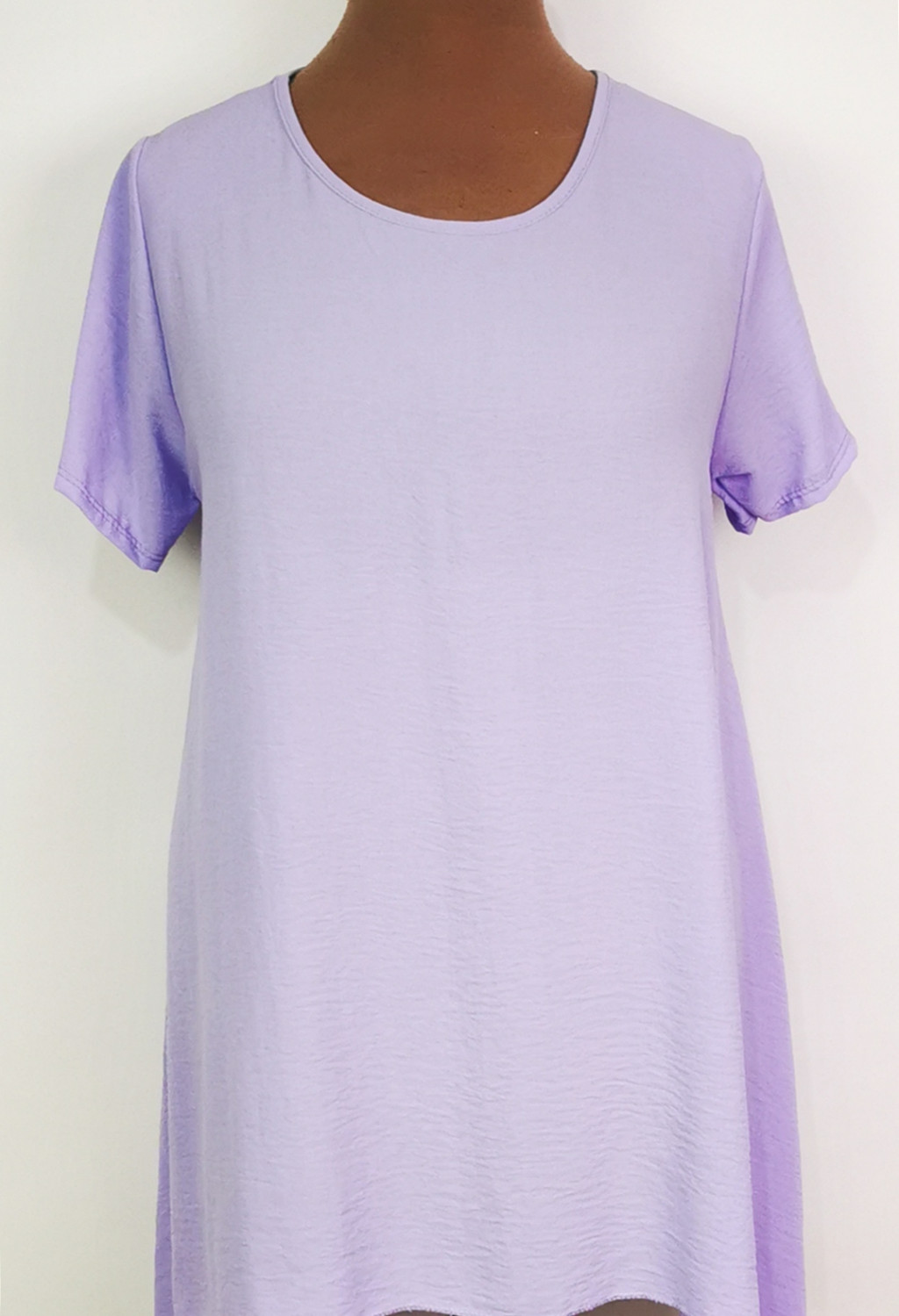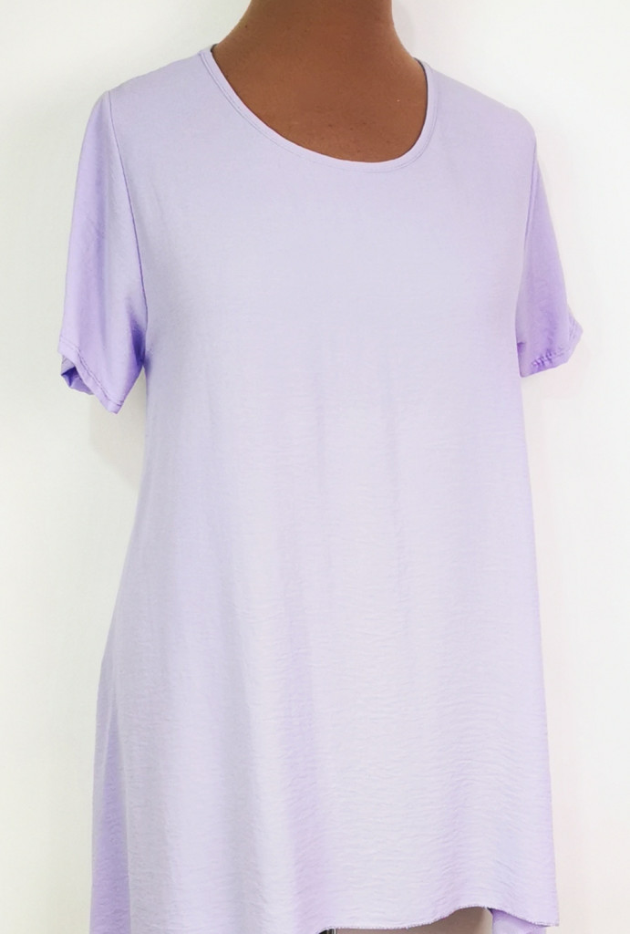 Kerek nyakú, rövid ujjú, lefelé bővűlő, halvány lila színű, muszlin felső. 6-7 cm-t enged.