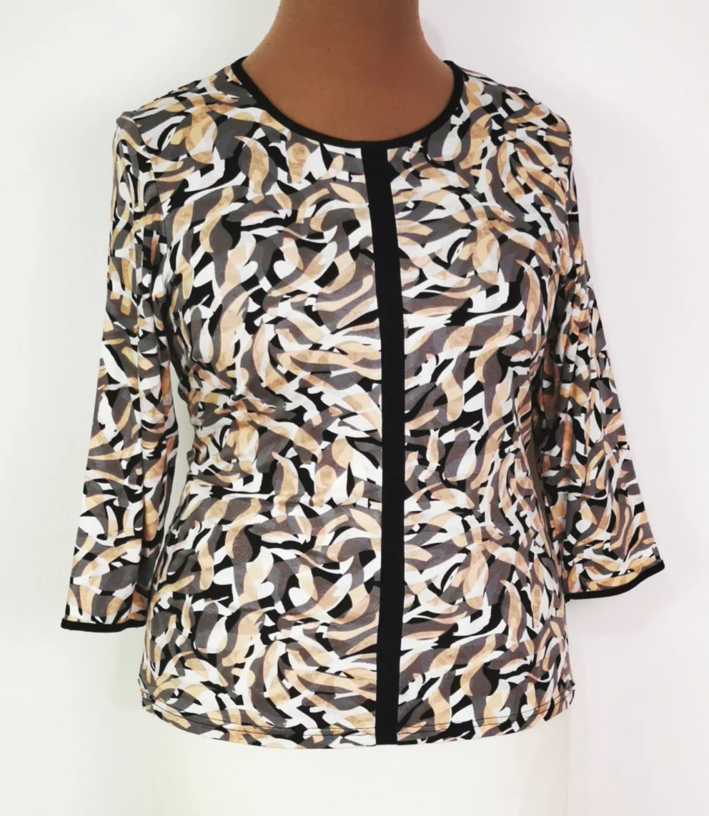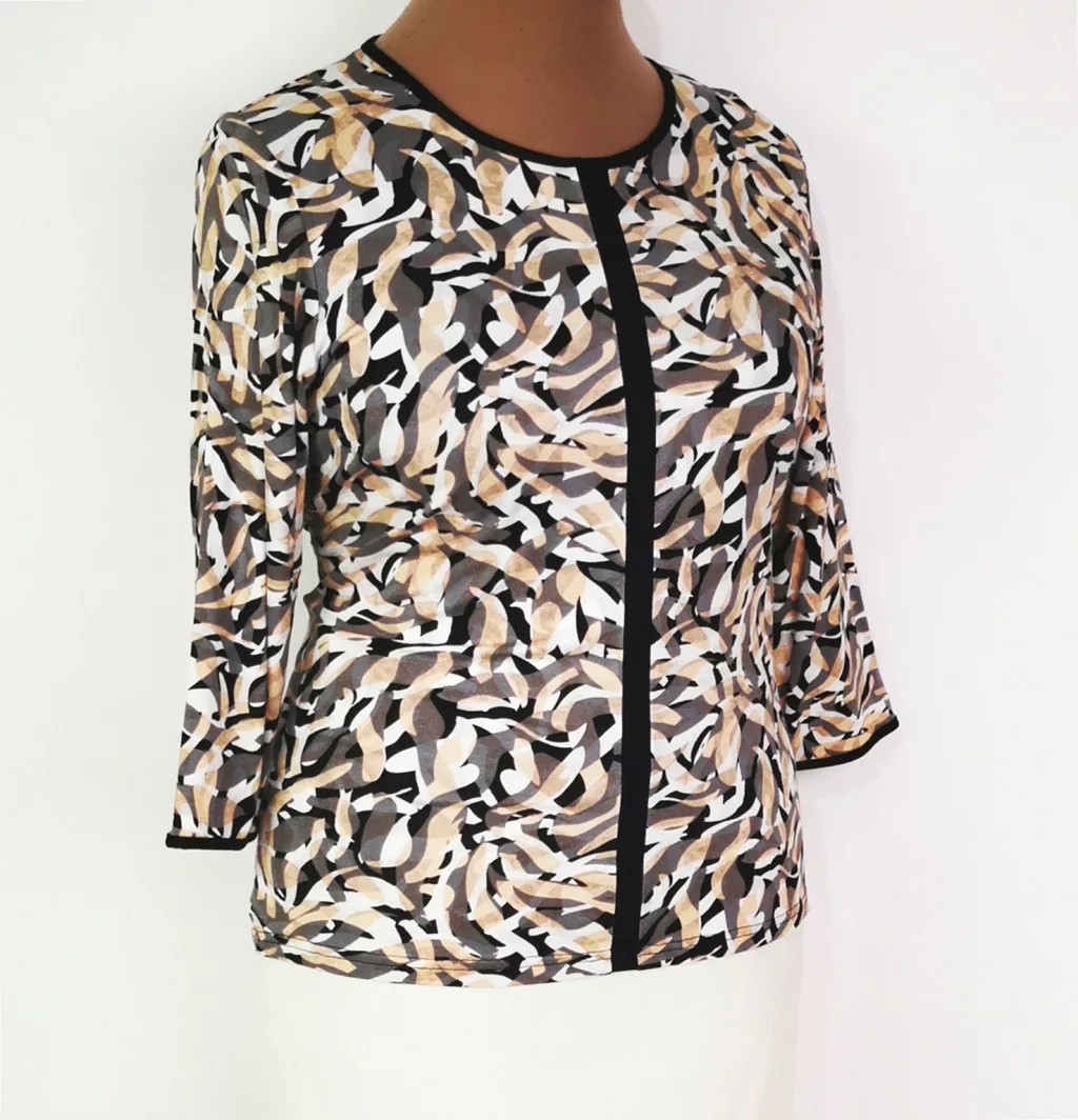 Kerek nyakú, 3/4-es ujjú, fehér-bézs-fekete színű mintás, pamutos anyagú felső. 5-6 cm-t enged.