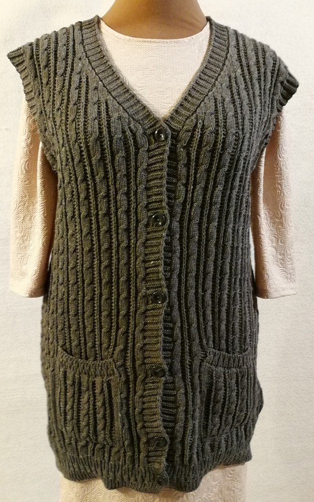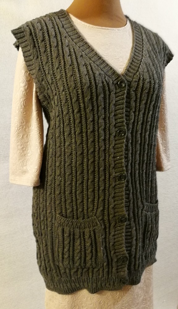 "V" nyakú, végig gombos, zsebes, gépi kötött, anyagában mintás, puha, pamut anyagú mellény. 10-15 cm-t enged.
